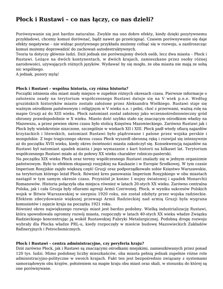 Płock i Rustawi – co nas łączy, co nas dzieli? Porównywanie się jest bardzo naturalne. Zwykle ma ono dobre efekty, kiedy dzięki pozytywnemu przykładowi, chcemy komuś dorównać, bądź nawet go prześcignąć. Czasem porównywanie się daje efekty negatywne – nie widząc pozytywnego przykładu możemy cofnąć się w rozwoju, a zazdroszcząc komuś możemy doprowadzić do zachowań autodestruktywnych. Teoria ta dotyczy głównie ludzi. Dziś jednak nie porównujemy dwóch osób, lecz dwa miasta – Płock i Rustawi. Leżące na dwóch kontynentach, w dwóch krajach, zamieszkane przez osoby różnej narodowości, używających różnych języków. Wydawać by się mogło, że oba miasta nie mają ze sobą nic wspólnego. A jednak, pozory mylą! Płock i Rustawi – wspólna historia, czy różna historia? Początki istnienia obu miast miały miejsce w zupełnie różnych okresach czasu. Pierwsze informacje o założeniu osady na terytorium współczesnego Rustawi datuje się na V wiek p.n.e. Według gruzińskich historyków miasto zostało założone przez Aleksandra Wielkiego. Rustawi staje się ważnym ośrodkiem państwowym i religijnym w V wieku n.e. i pełni, choć z przerwami, ważną rolę na mapie Gruzji aż do XIII wieku. Płock natomiast został założony jako wczesnośredniowieczny gród obronny prawdopodobnie w X wieku. Miasto dość szybko stało się znaczącym ośrodkiem władzy na Mazowszu, a przez pewien okres czasu było stolicą Księstwa Mazowieckiego. Zarówno Rustawi jak i Płock były wielokrotnie niszczone, szczególnie w wiekach XII i XIII. Płock padł wtedy ofiarą najazdów krzyżackich i litewskich, natomiast Rustawi było plądrowane i palone przez wojska perskie i mongolskie. Z tego tragicznego okresu czasu Płock wyszedł obronną ręką i rozwijał się intensywnie aż do początku XVII wieku, kiedy okres świetności miasta zakończył się. Konsekwencją najazdów na Rustawi był natomiast upadek miasta i jego wymazanie z kart historii na kilkaset lat. Terytorium współczesnego Rustawi miało aż do połowy XX wieku charakter rolniczo-pasterski. Na początku XIX wieku Płock oraz tereny współczesnego Rustawi znalazły się w jednym organizmie państwowym. Było to efektem ekspansji rosyjskiej na Kaukazie i w Europie Środkowej. W tym czasie Imperium Rosyjskie zajęło większą część Gruzji oraz podporządkowało sobie Księstwo Warszawskie, na terytorium którego leżał Płock. Również kres panowania Imperium Rosyjskiego w obu miastach nastąpił w tym samym okresie czasu. Przyniósł je koniec I wojny światowej i upadek Monarchii Romanowów. Historia połączyła oba miejsca również w latach 20-stych XX wieku. Zarówno centralna Polska, jak i cała Gruzja były ofiarami agresji Armii Czerwonej. Płock, w wyniku sukcesów Polskich wojsk w Bitwie Warszawskiej w sierpniu 1920 roku, nie został zdobyty przez wojska radzieckie. Efektem zdecydowanie większej przewagi Armii Radzieckiej nad armią Gruzji była wygrana komunistów i zajęcie kraju na początku 1921 roku. Również okres największego rozwoju miast jest bardzo podobny. Wielką industrializację Rustawi, która spowodowała ogromny rozwój miasta, rozpoczęły w latach 40-stych XX wieku władze Związku Radzieckiego koncentrując ją wokół Rustawskiej Fabryki Metalurgicznej. Podobną drogę rozwoju wybrały dla Płocka władze PRL-u, kiedy rozpoczęły w mieście budowę Mazowieckich Zakładów Rafineryjnych i Petrochemicznych. Płock i Rustawi – centra administracyjne, czy peryferia kraju? Dziś zarówno Płock, jak i Rustawi są znaczącymi ośrodkami miejskimi, zamieszkiwanych przez ponad 120 tys. ludzi. Mimo podobnej liczby mieszkańców, oba miasta pełnią jednak zupełnie różne role administracyjno-polityczne w swoich krajach. Fakt ten jest bezpośrednio związany z systemami samorządowym obu krajów, położeniem na mapie kraju obu miast oraz skali, w stosunku do której są one porównywane. Płock to leżące w centrum kraju miasto na prawach powiatu, będące jednym z centrów administracyjnych w województwie mazowieckim. W latach 1975–1998 miasto było stolicą województwa płockiego. Płock mimo zamieszkiwania w nim ponad 120 tys. mieszkańców jest dopiero 28 miastem w kraju, w którym mieszka ok. 0.3 % mieszkańców Polski. Rustawi jest stolicą leżącego w południowo-wschodniej Gruzji regionu Dolna Kartlia (po gruzińsku: Kwemo Kartli). Miasto zaczęło zyskiwać znaczenie jako centrum administracyjne regionu wraz z wprowadzaną w ostatnich latach reformą samorządową w Gruzji zwiększającą znacznie rolę władz regionalnych. Choć miasto zamieszkuje podobna do Płocka liczba ludności, w skali kraju Rustawi jest czwartym ośrodkiem miejskim zamieszkiwanym przez ok. 4% mieszkańców Gruzji. Ze względu na bliskość położenia miasta do stolicy kraju Tbilisi, bardzo często określa się Rustawi jako sypialnię stolicy. Tymczasem w okresie komunizmu, kiedy w mieście rozwijały się zakłady przemysłowe, za sypialnie Rustawi określało się… właśnie Tbilisi. Płock i Rustawi – centra polityczne, czy polityczna pustynia? Mimo stosunkowo niewielkiej liczby mieszkańców Płocka, z miastem i jego regionem jest związany szereg polityków pełniących ważne funkcje na współczesnej mapie politycznej Polski. Najważniejszym z nich jest Waldemar Pawlak, jeden z liderów Polskiego Stronnictwa Ludowego, do niedawne wicepremier i minister gospodarki. Znanym płockim politykiem jest również poseł PiS Stefan Jasiński. Pierwszą na płockiej liście wyborczej Platformy Obywatelskiej do Sejmu RP była w ostatnich wyborach parlamentarnych minister Julia Pitera. Z Rustawi, mimo zdecydowanie większego znaczenia miasta na politycznej mapie kraju, nie pochodzi żaden z ważniejszych gruzińskich polityków. Miasto jest natomiast znane z założonej tam w 1994 roku największej w Gruzji komercyjnej stacji telewizyjnej Rustawi2. Dziennikarze 