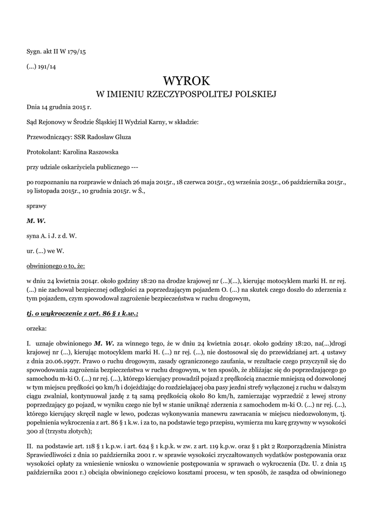 Sygn. akt II W 179/15 (...) 191/14 WYROK W IMIENIU RZECZYPOSPOLITEJ POLSKIEJ Dnia 14 grudnia 2015 r. Sąd Rejonowy w Środzie Śląskiej II Wydział Karny, w składzie: Przewodniczący: SSR Radosław Gluza Protokolant: Karolina Raszowska przy udziale oskarżyciela publicznego --po rozpoznaniu na rozprawie w dniach 26 maja 2015r., 18 czerwca 2015r., 03 września 2015r., 06 października 2015r., 19 listopada 2015r., 10 grudnia 2015r. w Ś., sprawy M. W. syna A. i J. z d. W. ur. (...) we W. obwinionego o to, że: w dniu 24 kwietnia 2014r. około godziny 18:20 na drodze krajowej nr (...)(...), kierując motocyklem marki H. nr rej. (...) nie zachował bezpiecznej odległości za poprzedzającym pojazdem O. (...) na skutek czego doszło do zderzenia z tym pojazdem, czym spowodował zagrożenie bezpieczeństwa w ruchu drogowym, tj. o wykroczenie z art. 86 § 1 k.w.; orzeka: I. uznaje obwinionego M. W. za winnego tego, że w dniu 24 kwietnia 2014r. około godziny 18:20, na(...)drogi krajowej nr (...), kierując motocyklem marki H. (...) nr rej. (...), nie dostosował się do przewidzianej art. 4 ustawy z dnia 20.06.1997r. Prawo o ruchu drogowym, zasady ograniczonego zaufania, w rezultacie czego przyczynił się do spowodowania zagrożenia bezpieczeństwa w ruchu drogowym, w ten sposób, że zbliżając się do poprzedzającego go samochodu m-ki O. (...) nr rej. (...), którego kierujący prowadził pojazd z prędkością znacznie mniejszą od dozwolonej w tym miejscu prędkości 90 km/h i dojeżdżając do rozdzielającej oba pasy jezdni strefy wyłączonej z ruchu w dalszym ciągu zwalniał, kontynuował jazdę z tą samą prędkością około 80 km/h, zamierzając wyprzedzić z lewej strony poprzedzający go pojazd, w wyniku czego nie był w stanie uniknąć zderzenia z samochodem m-ki O. (...) nr rej. (...), którego kierujący skręcił nagle w lewo, podczas wykonywania manewru zawracania w miejscu niedozwolonym, tj. popełnienia wykroczenia z art. 86 § 1 k.w. i za to, na podstawie tego przepisu, wymierza mu karę grzywny w wysokości 300 zł (trzystu złotych); II. na podstawie art. 118 § 1 k.p.w. i art. 624 § 1 k.p.k. w zw. z art. 119 k.p.w. oraz § 1 pkt 2 Rozporządzenia Ministra Sprawiedliwości z dnia 10 października 2001 r. w sprawie wysokości zryczałtowanych wydatków postępowania oraz wysokości opłaty za wniesienie wniosku o wznowienie postępowania w sprawach o wykroczenia (Dz. U. z dnia 15 października 2001 r.) obciąża obwinionego częściowo kosztami procesu, w ten sposób, że zasądza od obwinionego na rzecz Skarbu Państwa kwotę 100 zł tytułem zryczałtowanych wydatków postępowania oraz połowę pozostałych wydatków poniesionych przez Skarb Państwa od chwili wszczęcia postępowania w sprawie i na podstawie art. 21 ust. 2 w zw. z art. 3 ust. 1 ustawy z dnia 23 czerwca 1973 r. o opłatach w sprawach karnych wymierza mu opłatę w kwocie 30 zł. UZASADNIENIE WYROKU Na podstawie przeprowadzonego przewodu sądowego ustalono następujący stan faktyczny: W dniu 24 kwietnia 2014r. A. K. wraz z żoną M. K. i synem K. K. (1) pojechali pociągiem do W. w celu nabycia auta. Na miejscu zakupili używany samochód m-ki O. (...) nr rej. (...), którym następnie udali się w podróż powrotną do swojego miejsca zamieszkania w W.. Pojazdem kierował A. K., obok niego siedział syn K., a miejsce z tyłu zajmowała M. K.. Dowód: zeznania świadka A. K., k. 15 – 16, nośnik z zapisem, k. 66, zeznania świadka M. K., k. 30, nośnik z zapisem, k. 66, zeznania świadka K. K. (1), k. 28, nośnik z zapisem, k. 66. A. K. zamierzał pojechać inną drogą niż zwykle, aby zobaczyć nowo wybudowany most na O. w B.. W tym celu, po opuszczaniu W., prowadził on auto po drodze krajowej nr (...). A. K. nie znał dobrze trasy, którą zamierzał dojechać do W. i w razie gdyby zabłądził zamierzać „pytać ludzi” o drogę. Dowód: zeznania świadka A. K., k. 15 – 16, nośnik z zapisem, k. 66, zeznania świadka M. K., k. 30, nośnik z zapisem, k. 66, zeznania świadka K. K. (1), k. 28, nośnik z zapisem, k. 66. Dojeżdżając do skrzyżowania drogi (...) z ulicą (...) w K. A. K. pojechał dalej prosto, mijając z prawej strony stację paliw BP. Kierował on pojazdem z prędkością około 60 – 70 km/h a następnie zaczął zwalniać prędkość, zbliżając się do umiejscowionej w środkowej części drogi strefy wyłączonej z ruchu. Dowód: zeznania świadka A. K., k. 15 – 16, nośnik z zapisem, k. 66, płyty dvd z nagraniami z monitoringu, k. 92, 93. W obrębie tej powierzchni, stanowiącej znak poziomy P-21 był wbudowany pylon ze znakiem C-9 "nakaz jazdy z prawej strony znaku", usytuowany bezpośrednio za końcową częścią chodnika umieszczonego po prawej stronie drogi. Na wysokości znaku C-9, po prawej stronie drogi, występowało pobocze o asfaltowej nawierzchni. Krawędź jezdni była wyznaczona krawędziową linią ciągłą - znak poziomy P-7b. Szerokość prawego pobocza o nawierzchni asfaltowej wynosiła 2 metry, zaś szerokość prawej jezdni wynosiła 3,4 m. Tyle samo miała też największa szerokość strefy wyłączonej z ruchu, który to znak poziomy w miarę zbliżania się do końca zwęża się. Dowód: opinia biegłego z zakresu wypadków komunikacyjnych M. P., k. 133 – 157, nośnik z zapisem, k. 169, płyty dvd z nagraniami z monitoringu, k. 92, 93. W czasie gdy A. K. wyhamowywał swój pojazd, zaczął się do niego zbliżać obwiniony M. W., jadący w tym samym kierunku motocyklem m-ki H. (...) o nr rej. (...). Obwiniony widział, że poprzedzający go samochód m-ki O. zwalnia, lecz mimo to utrzymywał stałą prędkość około 80 km/h. Zamierzał on wyprzedzić samochód kierowany przez A. K. prawym pasem ruchu na wysokości znaku poziomego P-21. Dowód: częściowo wyjaśnienia obwinionego M. W., nośnik z zapisem, k. 96. Po przejechaniu obok pylonu ze znakiem C-9, A. K. w pewnym momencie włączył w swoim aucie lewy kierunkowskaz. P