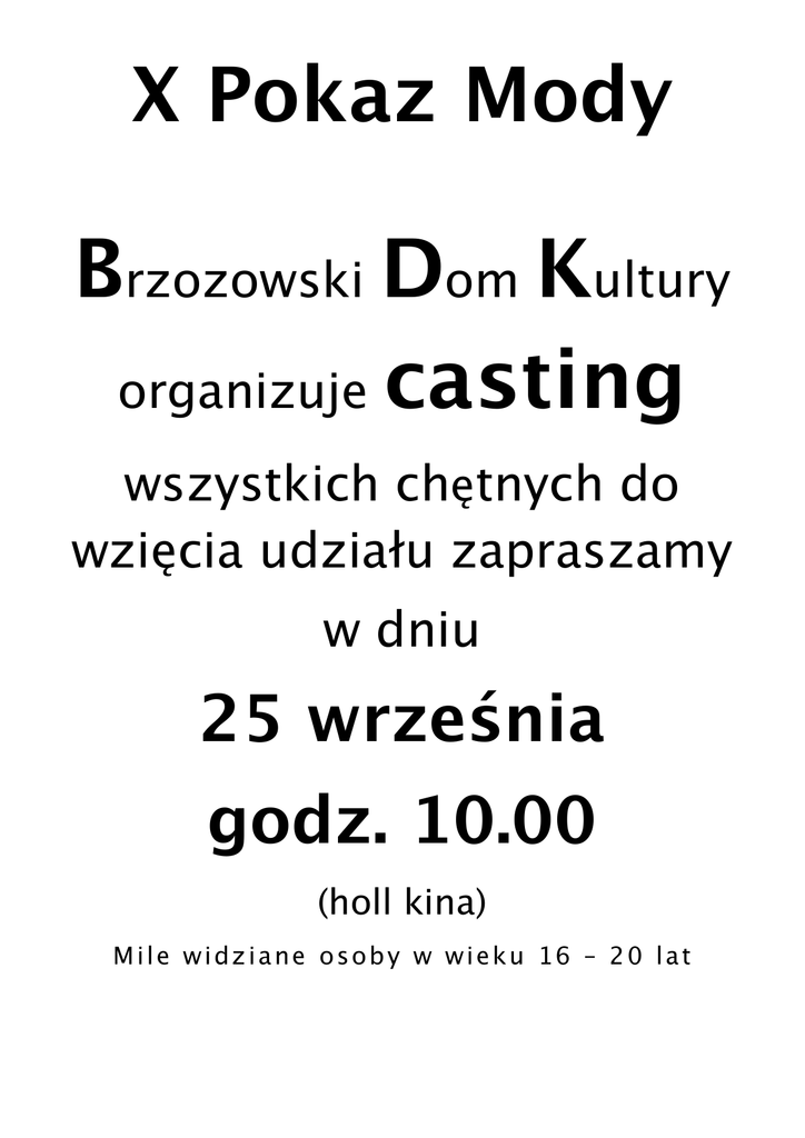 X Pokaz Mody Brzozowski Dom Kultury organizuje casting wszystkich chętnych do wzięcia udziału zapraszamy w dniu 25 września godz. 10.00 (holl kina) Mile widziane osoby w wieku 16 – 20 lat