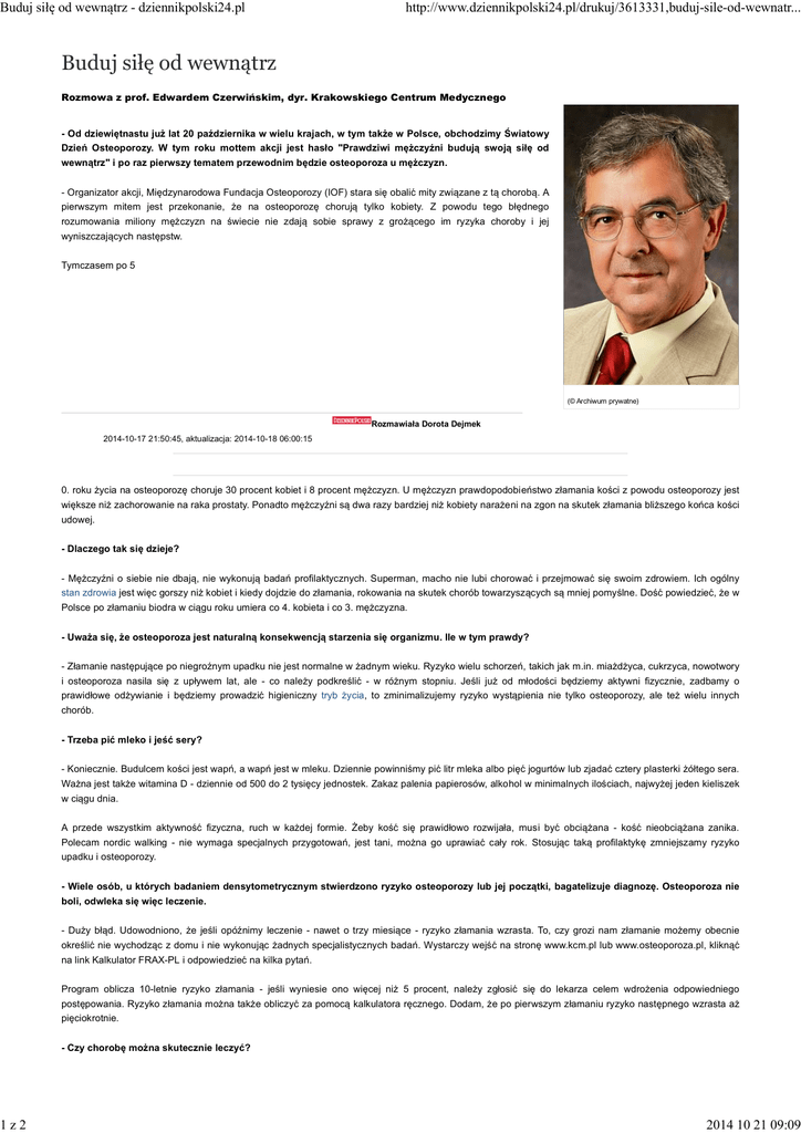 Buduj siłę od wewnątrz - dziennikpolski24.pl 1z2 http://www.dziennikpolski24.pl/drukuj/3613331,buduj-sile-od-wewnatr... Buduj siłę od wewnątrz Rozmowa z prof. Edwardem Czerwińskim, dyr. Krakowskiego Centrum Medycznego - Od dziewiętnastu już lat 20 października w wielu krajach, w tym także w Polsce, obchodzimy Światowy Dzień Osteoporozy. W tym roku mottem akcji jest hasło "Prawdziwi mężczyźni budują swoją siłę od wewnątrz" i po raz pierwszy tematem przewodnim będzie osteoporoza u mężczyzn. - Organizator akcji, Międzynarodowa Fundacja Osteoporozy (IOF) stara się obalić mity związane z tą chorobą. A pierwszym mitem jest przekonanie, że na osteoporozę chorują tylko kobiety. Z powodu tego błędnego rozumowania miliony mężczyzn na świecie nie zdają sobie sprawy z grożącego im ryzyka choroby i jej wyniszczających następstw. Tymczasem po 5 (© Archiwum prywatne) Rozmawiała Dorota Dejmek 2014-10-17 21:50:45, aktualizacja: 2014-10-18 06:00:15 0. roku życia na osteoporozę choruje 30 procent kobiet i 8 procent mężczyzn. U mężczyzn prawdopodobieństwo złamania kości z powodu osteoporozy jest większe niż zachorowanie na raka prostaty. Ponadto mężczyźni są dwa razy bardziej niż kobiety narażeni na zgon na skutek złamania bliższego końca kości udowej. - Dlaczego tak się dzieje? - Mężczyźni o siebie nie dbają, nie wykonują badań profilaktycznych. Superman, macho nie lubi chorować i przejmować się swoim zdrowiem. Ich ogólny stan zdrowia jest więc gorszy niż kobiet i kiedy dojdzie do złamania, rokowania na skutek chorób towarzyszących są mniej pomyślne. Dość powiedzieć, że w Polsce po złamaniu biodra w ciągu roku umiera co 4. kobieta i co 3. mężczyzna. - Uważa się, że osteoporoza jest naturalną konsekwencją starzenia się organizmu. Ile w tym prawdy? - Złamanie następujące po niegroźnym upadku nie jest normalne w żadnym wieku. Ryzyko wielu schorzeń, takich jak m.in. miażdżyca, cukrzyca, nowotwory i osteoporoza nasila się z upływem lat, ale - co należy podkreślić - w różnym stopniu. Jeśli już od młodości będziemy aktywni fizycznie, zadbamy o prawidłowe odżywianie i będziemy prowadzić higieniczny tryb życia, to zminimalizujemy ryzyko wystąpienia nie tylko osteoporozy, ale też wielu innych chorób. - Trzeba pić mleko i jeść sery? - Koniecznie. Budulcem kości jest wapń, a wapń jest w mleku. Dziennie powinniśmy pić litr mleka albo pięć jogurtów lub zjadać cztery plasterki żółtego sera. Ważna jest także witamina D - dziennie od 500 do 2 tysięcy jednostek. Zakaz palenia papierosów, alkohol w minimalnych ilościach, najwyżej jeden kieliszek w ciągu dnia. A przede wszystkim aktywność fizyczna, ruch w każdej formie. Żeby kość się prawidłowo rozwijała, musi być obciążana - kość nieobciążana zanika. Polecam nordic walking - nie wymaga specjalnych przygotowań, jest tani, można go uprawiać cały rok. Stosując taką profilaktykę zmniejszamy ryzyko upadku i osteoporozy. - Wiele osób, u których badaniem densytometrycznym stwierdzono ryzyko osteoporozy lub jej początki, bagatelizuje diagnozę. Osteoporoza nie boli, odwleka się więc leczenie. - Duży błąd. Udowodniono, że jeśli opóźnimy leczenie - nawet o trzy miesiące - ryzyko złamania wzrasta. To, czy grozi nam złamanie możemy obecnie określić nie wychodząc z domu i nie wykonując żadnych specjalistycznych badań. Wystarczy wejść na stronę www.kcm.pl lub www.osteoporoza.pl, kliknąć na link Kalkulator FRAX-PL i odpowiedzieć na kilka pytań. Program oblicza 10-letnie ryzyko złamania - jeśli wyniesie ono więcej niż 5 procent, należy zgłosić się do lekarza celem wdrożenia odpowiedniego postępowania. Ryzyko złamania można także obliczyć za pomocą kalkulatora ręcznego. Dodam, że po pierwszym złamaniu ryzyko następnego wzrasta aż pięciokrotnie. - Czy chorobę można skutecznie leczyć? 2014 10 21 09:09 Buduj siłę od wewnątrz - dziennikpolski24.pl 2z2 http://www.dziennikpolski24.pl/drukuj/3613331,buduj-sile-od-wewnatr... - Im wcześniejszy etap choroby, tym efekty terapii będą lepsze. Leczenie zaawansowanej osteoporozy nie przynosi tak spektakularnych wyników. Jeśli u danej osoby densytometria jest dopiero na pograniczu osteoporozy, to włączenie w tym momencie odpowiednich leków zabezpiecza pacjenta przed chorobą już do końca życia. Ale jeśli do lekarza zgłasza się osoba po złamaniu biodra, kiedy ryzyko złamania drugiego biodra wzrosło już 6-krotnie, to wdrożenie leczenia zmniejszy to ryzyko 4-krotnie, ale całkiem go nie wyeliminuje. Obecnie dysponujemy wieloma lekami o wysokiej skuteczności przeciwzłamaniowej. W Polsce jednak refundowany jest tylko jeden lek doustny przyjmowany raz w tygodniu. Pozostałe leki stoją w aptece na półkach, ale nie są refundowane lub też dla znikomej grupy pacjentów, trzeba bowiem spełniać wiele kryteriów. W dodatku NFZ "zredukował" liczbę leczonych o połowę. Mamy 2 mln 700 tys. Polaków ze złamaniami spowodowanymi osteoporozą. Jeszcze dwa lata temu leczyło się 200 tys. chorych, czyli co dziesiąta osoba, dziś terapii poddaje się tylko co piąta. "Cicha epidemia" osteoporozy rozprzestrzenia się. * Biała sobota W sobotę, 25 października, w godz. 8-14, osoby po 50. roku życia zapraszamy na bezpłatne badania densytometryczne. Badania, połączone z akcją edukacyjną dla pacjentów, odbędą się w Krakowskim Centrum Medycznym, ul. Kopernika 32. Konieczna uprzednia rejestracja telefoniczna: 12 430 00 00, hasło: "Światowy Dzień Osteoporozy". 2014 10 21 09:09