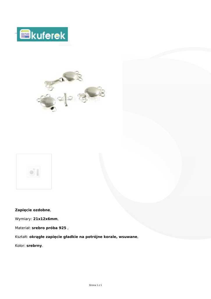 Zapięcie ozdobne, Wymiary: 21x12x6mm, Materiał: srebro próba 925 , Kształt: okrągłe zapięcie gładkie na potrójne korale, wsuwane, Kolor: srebrny. Strona 1 z 1