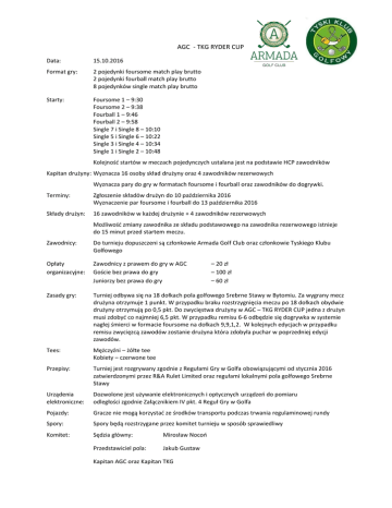 AGC - TKG RYDER CUP Data: 15.10.2016 Format gry: 2 pojedynki foursome match play brutto 2 pojedynki fourball match play brutto 8 pojedynków single match play brutto Starty: Foursome 1 – 9:30 Foursome 2 – 9:38 Fourball 1 – 9:46 Fourball 2 – 9:58 Single 7 i Single 8 – 10:10 Single 5 i Single 6 – 10:22 Single 3 i Single 4 – 10:34 Single 1 i Single 2 – 10:48 Kolejność startów w meczach pojedynczych ustalana jest na podstawie HCP zawodników Kapitan drużyny: Wyznacza 16 osoby skład drużyny oraz 4 zawodników rezerwowych Wyznacza pary do gry w formatach foursome i fourball oraz zawodników do dogrywki. Terminy: Zgłoszenie składów drużyn do 10 października 2016 Wyznaczenie par foursome i fourball do 13 października 2016 Składy drużyn: 16 zawodników w każdej drużynie + 4 zawodników rezerwowych Możliwość zmiany zawodnika ze składu podstawowego na zawodnika rezerwowego istnieje do 15 minut przed startem meczu. Zawodnicy: Do turnieju dopuszczeni są członkowie Armada Golf Club oraz członkowie Tyskiego Klubu Golfowego Opłaty organizacyjne: Zawodnicy z prawem do gry w AGC Goście bez prawa do gry Juniorzy bez prawa do gry Zasady gry: Turniej odbywa się na 18 dołkach pola golfowego Srebrne Stawy w Bytomiu. Za wygrany mecz drużyna otrzymuje 1 punkt. W przypadku braku rozstrzygnięcia meczu po 18 dołkach obydwie drużyny otrzymują po 0,5 pkt. Do zwycięstwa drużyny w AGC – TKG RYDER CUP jedna z drużyn musi zdobyć co najmniej 6,5 pkt. W przypadku remisu 6-6 odbędzie się dogrywka w systemie nagłej śmierci w formacie foursome na dołkach 9,9,1,2. W kolejnych edycjach w przypadku remisu zwycięzcą zawodów zostanie drużyna która zdobyła puchar w poprzedniej edycji zawodów. Tees: Mężczyźni – żółte tee Kobiety – czerwone tee Przepisy: Turniej jest rozgrywany zgodnie z Regułami Gry w Golfa obowiązującymi od stycznia 2016 zatwierdzonymi przez R&A Rulet Limited oraz regułami lokalnymi pola golfowego Srebrne Stawy Urządenia elektroniczne: Dozwolone jest używanie elektronicznych i optycznych urządzeń do pomiaru odległości zgodnie Załącznikiem IV pkt. 4 Reguł Gry w Golfa Pojazdy: Gracze nie mogą korzystać ze środków transportu podczas trwania regulaminowej rundy Spory: Spory będą rozstrzygane przez komitet turnieju w sposób sprawiedliwy Komitet: Sędzia główny: Mirosław Nocoń Przedstawiciel pola: Jakub Gustaw Kapitan AGC oraz Kapitan TKG – 20 zł – 100 zł – 60 zł