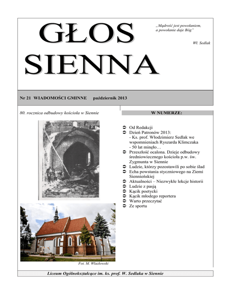 „Mądrość jest powołaniem, a powołanie daje Bóg” Wł. Sedlak Nr 21 WIADOMOŚCI GMINNE październik 2013 80. rocznica odbudowy kościoła w Siennie W NUMERZE: Od Redakcji Dzień Patronów 2013: - Ks. prof. Włodzimierz Sedlak we wspomnieniach Ryszarda Klimczaka - 50 lat minęło… Przeszłość ocalona. Dzieje odbudowy średniowiecznego kościoła p.w. św. Zygmunta w Siennie Ludzie, którzy pozostawili po sobie ślad Echa powstania styczniowego na Ziemi Siennieńskiej Aktualności – Niezwykłe lekcje historii Ludzie z pasją Kącik poetycki Kącik młodego reportera Warto przeczytać Ze sportu Fot. M. Wlazłowski Liceum Ogólnokształcące im. ks. prof. W. Sedlaka w Siennie Od Redakcji W bieżącym numerze „Głosu Sienna” powracamy do wydarzeń sprzed wielu lat. Rozpoczynamy artykułami związanymi z Patronami szkół. Księdza profesora Włodzimierza Sedlaka pragniemy zaprezentować w świetle wspomnień przyjaciela z okresu wojny pana Ryszarda Klimczaka, którego losy rzuciły do Sienna. Ten utalentowany prozaik, poeta, satyryk, dziennikarz związany z Łodzią pięknie mówi o Patronie naszych szkół. Teofila Banacha chcemy pokazać poprzez pryzmat „ocalonej pamięci”. Przypominamy, że w bieżącym roku minęło 50 lat od historycznej decyzji nadającej szkole imię niezapominanego nauczyciela. Pragniemy również przybliżyć okoliczności odbudowy kościoła parafialnego p.w. św. Zygmunta w Siennie. W tym roku przypada 80. rocznica rekonstrukcji świątyni po wojennych zniszczeniach. Wracamy też do informacji o Adamie Cieśli. Sylwetkę twórcy spółdzielczości w naszej miejscowości ukazujemy w świetle sejmowych dokumentów zgromadzonych w „Bibliotece sejmowej”. Kolejnym ważnym wydarzeniem, które chcemy utrwalić, jest 150. rocznica powstania styczniowego . To wydarzenie historyczne rozgrywało się również w Siennie i okolicy, toteż warto utrwalić i pokazać młodemu pokoleniu, że wielka historia również miała miejsce w naszej „małej ojczyźnie”. Szczególną uwagę poświęcamy pułkownikowi Dionizemu Czachowskiemu, który zginął w pobliskim Jaworze Soleckim. W „Aktualnościach” przedstawiamy efekty pracy uczniów biorących udział w projekcie „Szkoła Dialogu”. Celem zajęć było nie tyko poznanie przeszłości Sienna, ale przede wszystkim kształcenie postaw tolerancji i otwartości na inne kultury. Nowością tego numeru jest rubryka: „Ludzie z pasją”, ukazująca współczesnych mieszkańców Sienna, którzy oprócz pracy zawodowej, realizują swoje zainteresowania, często odbiegające od wykonywanego zawodu. W bieżącym numerze znalazło się również miejsce na ukazanie dokonań naszych uczniów oraz podsumowanie osiągnięć „Zawiszy”. Zachęcamy do lektury „Głosu Sienna” i dzielenia się wszelkimi spostrzeżeniami z Redakcją. Redakcja Głos Sienna DZIEŃ PATRONÓW 2013 Ksiądz Profesor Włodzimierz Sedlak we wspomnieniach Ryszarda Klimczaka W bieżącym roku prezentujemy Patrona Liceum Ogólnokształcącego i Publicznego Gimnazjum w świetle wspomnień i utworów literackich Ryszarda Klimczaka, który spotkał się z księdzem Sedlakiem podczas wojny. Wspólne przeżycia zbliżyły młodego przesiedleńca z Łodzi i kapłana, który na stałe pozostawił swój ślad w Siennie. W jubileuszowym wydawnictwie pt. „Ksiądz profesor Włodzimierz Sedlak „…sercem skarżyszczanin” Ryszard Klimczak tak wspomina ten niezwykły czas: „Przedziwne nas losu ogniwa złączyły. Księdza Włodzimierza Sedlaka poznałem w 1940 roku, w niedużej, niezbyt urodziwej osadzie – Sienno – zagubionej między Wisłą a Górami Świętokrzyskimi (…) dokąd rzuciła nas wojenna zawierucha.” Dla niespełna piętnastoletniego młodzieńca ksiądz Sedlak stał się niekwestionowanym autorytetem. Swoją fascynację osobowością kapłana tak opisuje: „Rozległa wiedza i wszechstronność zainteresowań księdza Sedlaka wzbudziły podziw i szacunek, przynajmniej w moich młodzieńczych odczuciach. Emanował jakąś magnetyczną siłą przyciągania”. Ogromną wiedzą ksiądz dzielił się ze swoim uczniem na zajęciach z języka polskiego, niemieckiego, biologii, mineralogii, botaniki i zoologii, chemii, geografii, filozofii i astronomii. Dzięki tajnemu nauczaniu, którego Włodzimierz Sedlak był organizatorem, mógł kontynuować naukę rozpoczętą jeszcze przed wojną. Lekcje w plenerze czy też wycieczki do pobliskiego Bałtowa były dla uczniów i autora wspomnień niezwykle cenne. Na wspólnych wyprawach wychowankowie stawali się odkrywcami i badaczami przyrody. Młodzież pozostawała również pod wpływem kazań młodego księdza, które - jak pisze Klimczak - „były głosem sumienia” i zawierały „słowa prawdy, nadziei i miłości”, tak potrzebne w czasie, gdy wiara w człowieka i wartości ulegała zachwianiu. Uczeń Ryszard Klimczak ur. 24 czerwca 1925 r. w Łodzi; prozaik, poeta, satyryk, dziennikarz, absolwent studiów prawniczych na Uniwersytecie Łódzkim. W czasie II wojny światowej walczył w oddziałach partyzanckich na Kielecczyźnie. Uczeń i przyjaciel księdza profesora Włodzimierza Sedlaka (1911-1993), twórcy bioelektronicznego modelu życia. Autor powieści: Czas – karabin (1961), Niepokój elektrostazy (1987), Skok w wyciszony horyzont (1993), O Raku, owczarku węgierskim i skrzypcach Stradivariusa (1998), opowiadań: Nikt nie jest poza podejrzeniem (1992), Humoreski – makabreski z łezką i bez łezki (2001), Dotyk zamulonego czasu (2007), wspomnień: Raport ilustrowany (1970), felietonów: Bez owijania w bawełnę (1971), esejów: Etiuda na dwa biopola - Włodzimierza Sedlaka szkic do portretu (2000), Lot po krzywiźnie czasoprzestrzeni (1995) i innych. Utwory Ryszarda Klimczaka ukazały się w kilkunastu antologiach i almanachach. Autor filmu dokumentalnego „Meandry, przełomy” (2007). Laureat ogólnopolskich konkursów literackich. Źródło - strona interne