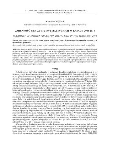 138 EKONOMISTÓW ROLNICTWA I AGROBIZNESU Krzysztof STOWARZYSZENIE Hryszko Roczniki Naukowe ● tom XVII ● zeszyt 3 Krzysztof Hryszko Instytut Ekonomiki Rolnictwa i Gospodarki Żywnościowej – PIB w Warszawie ZMIENNOŚĆ CEN ZBYTU RYB BAŁTYCKICH W LATACH 2004-2014 VOLATILITY OF MARKET PRICES FOR BALTIC FISH IN THE YEARS 2004-2014 Słowa kluczowe: rynek ryb, ceny zbytu, zmienność cen, dekompozycja szeregów czasowych, opłacalność połowów Key words: fish market, sale prices, price volatility, decomposition of time series, catch profitability Abstrakt. Podjęto próbą analizy wzorców kształtowania się cen podstawowych gatunków ryb poławianych na Morzu Bałtyckim w okresie ostatnich 11 lat. Ceny zbytu ryb bałtyckich, często zwane także cenami pierwszej sprzedaży ryb uzyskiwanymi przez rybaków w portach, podobnie jak ceny innych produktów rolno-żywnościowych kształtują się pod wpływem wielu czynników. Ich wzajemne oddziaływanie i kierunki sił z jakimi dane czynniki mogą wpływać na poziom cen jest trudny do oszacowania. Poznanie przybliżonych prawidłowości i symptomatycznych zmian pojawiających się w przeszłości na danym rynku jest ważnym elementem wyjaśnienia zachodzących procesów i stanowi podstawę podejmowania decyzji i działań gospodarczych w przyszłości. Wstęp Rybołówstwo bałtyckie podlegało w ostatniej dekadzie głębokim przekształceniom i restrukturyzacji. Wynikało to głównie z przystąpienia Polski do Unii Europejskiej (UE) i objęcia m.in. gospodarki morskiej wspólną polityką rybacką (WPR), a w konsekwencji koniecznością dostosowania potencjału połowowego do stanu zasobów biologicznych. Działania te były oparte głównie na zmniejszeniu potencjału floty (złomowaniu) i wypłacie odszkodowań. W końcu 2014 roku w połowy ryb na Morzu Bałtyckim zaangażowane było 870 jednostek rybackich [Kuzebski 2015], co oznaczało redukcję ich liczby o 410 statków (o 32%) w porównaniu z 2004 rokiem, a w przeliczeniu na tonaż i moc silników odpowiednio o 55 i 51%. Jednocześnie wielkość połowów bałtyckich podlegała w tym okresie ścisłej kontroli ze względu na kwoty połowowe (ustalane przez Komisję Europejską w oparciu o doradztwo naukowe Międzynarodowej Rady Badań Morza). Wysoka dynamika liczby złomowanych jednostek w pierwszych latach funkcjonowania programu oraz uregulowanie kwestii nieraportowanych połowów dorszy, które zostało udowodnione Polsce w trakcie kontroli inspektorów unijnych i związane było z koniecznością karnego obniżenia kwot połowowych w kolejnych latach, spowodowało, że w latach 2004-2008 wystąpiło znaczne obniżenie połowów (ze 154 tys. t do 95 tys. t). W kolejnych latach nastąpiła względna stabilizacja wielkości wyładunków ryb w portach (110-135 tys. ton), jednak nadal bardzo dużej fluktuacji podlegały połowy poszczególnych gatunków ryb. Zmienność struktury połowów oraz cen ryb wpływały na jeszcze większe zróżnicowanie w poszczególnych latach wartości polskich połowów bałtyckich, które wahały się od 122 do 239 mln zł rocznie. Wymiernym efektem przemian było zmniejszenie zatrudnienia o około 1,5 tys. osób, w efekcie czego pozostałe 2,6 tys. armatorów wyraźnie odczuło poprawę wydajności ekonomicznej połowów. Wartość sprzedanych ryb przypadająca na 1 rybaka zwiększyła się średnio z 44 tys. zł w 2004 roku do 97 tys. zł w 2013 roku i 80 tys. zł w 2014 roku, a więc około 2-krotnie. Ważna rolę w kształtowaniu się wyniku finansowego polskiego rybołówstwa bałtyckiego odgrywają dotacje i środki finansowe dostępne w ramach funkcjonowania unijnych programów operacyjnych (głównie z tytułu trwałego lub tymczasowego zaprzestania działalności połowowej), które stanowiły w ostatnich latach około 20-30% przychodów [Kuzebski 2014]. Mimo to ceny zbytu i ich zmienność decydują o rentowności prowadzonej działalności. W latach 2011-2012 Zmienność cen zbytu ryb bałtyckich w latach 2004-2014 Rysunek 1. Wielkość i wartość połowów bałtyckich w latach 2004-2014 Figure 1. Volume and value of Baltic catches in 2004-2014 Źródło: opracowanie na podstawie danych Morskiego Instytut Rybackiego – PIB Source: study based on National Marine Fisheries Research Institute data 139 250 200 tys. ton mln zł 150 100 50 0 2004 2005 2006 2007 2008 2009 2010 2011 2012 2013 2014 kształtowała się ona na wysokim poziomie i wynosiła 16-17%, ale po uwzględnieniu dotacji unijnych i budżetowych wzrosła aż do 35-40%. Wyniki takie utrzymały się także w 2013 roku, 2,4 1,3 ale w kolejnym roku wyraźnie spadły na skutek cen zbytu. cena niskich zbytu/sale prices (Yt) 2,0 trend/trend (Tt) Materiał i metodyka badań 1,6 1,1 0,9 componen Zbadanie wpływu poszczególnych czynników na kształtowanie się cen jest bardzo wahania trudne,cykliczne/cycle a 0,7 1,2 wygładzenie/smoothing (filtr/filter cena jest odzwierciedleniem wszystkich znanych i istotnych informacji będących w posiadaniu Hodricka-Prescotta) uczestników rynku. Dlatego zasadne w szeregach 0,5 0,8 jest wskazanie prawidłowości występujących 2004 2006 2008 2010 2012 2 2004 Analiza 2006 2008 regularnych 2010 2012 zdarzeń 2014 czasowych [Hamulczuk, Stańko 2011]. tych skupia się na wyodrębnieniu z szeregu czasowego składowych w postaci tendencji rozwojowej (Tt), 1,2czyli skłonności 1,2 wahania przypadkowe/irregular do długookresowych jednokierunkowych zmian zmiennej w czasie.1,1 Wokół trendu za-(It) wahaniawartości sezonowe/seasonally component (St) zwyczaj można obserwować różnego rodzajucomponent odchylenie lub wahania i jeżeli mają one mniej lub 1,1 bardziej regularny charakter, wtedy możemy mówić dodatkowo o wahaniach1,0 cyklicznych (Ct). W rybołówstwie takim czynnikiem może być np. zwiększona biomasa dorszy 0,9 pod wpływem cyklicznych wpływów do Bałtyku1,0wód słonych z Morza Północnego i wzrost połowów tych ryb. 0,8 Kolejn