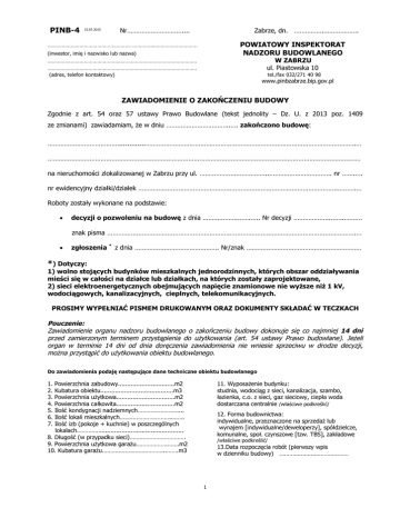 PINB-4 15.07.2015 Nr………………………….... Zabrze, dn. …………….………………. POWIATOWY INSPEKTORAT NADZORU BUDOWLANEGO ……………………………………………………………….………………………… (inwestor, imię i nazwisko lub nazwa) W ZABRZU ul. Piastowska 10 ………………………………………………………………………………………… ………………………………………………………………………………………… (adres, telefon kontaktowy) tel./fax 032/271 40 98 www.pinbzabrze.bip.gov.pl ZAWIADOMIENIE O ZAKOŃCZENIU BUDOWY Zgodnie z art. 54 oraz 57 ustawy Prawo Budowlane (tekst jednolity – Dz. U. z 2013 poz. 1409 ze zmianami) zawiadamiam, że w dniu ……………………………..…. zakończono budowę: ………………………………….............…………………………………………………………………………………………………….… ……………………………………………………………………………………………………………………………………………………… na nieruchomości zlokalizowanej w Zabrzu przy ul. ………………………………..……………………………. nr …….…. nr ewidencyjny działki/działek ……………………………………………………………………………………………….……….… Roboty zostały wykonane na podstawie: decyzji o pozwoleniu na budowę z dnia ……………….…….….. Nr decyzji ………………..……..……… znak pisma ……………………………………………………………………………………………………………………….… zgłoszenia * z dnia ………………………………………. Nr/znak ……………………………………………………… *) Dotyczy: 1) wolno stojących budynków mieszkalnych jednorodzinnych, których obszar oddziaływania mieści się w całości na działce lub działkach, na których zostały zaprojektowane, 2) sieci elektroenergetycznych obejmujących napięcie znamionowe nie wyższe niż 1 kV, wodociągowych, kanalizacyjnych, cieplnych, telekomunikacyjnych. PROSIMY WYPEŁNIAĆ PISMEM DRUKOWANYM ORAZ DOKUMENTY SKŁADAĆ W TECZKACH Pouczenie: Zawiadomienie organu nadzoru budowlanego o zakończeniu budowy dokonuje się co najmniej 14 dni przed zamierzonym terminem przystąpienia do użytkowania (art. 54 ustawy Prawo budowlane). Jeżeli organ w terminie 14 dni od dnia doręczenia zawiadomienia nie wniesie sprzeciwu w drodze decyzji, można przystąpić do użytkowania obiektu budowlanego. Do zawiadomienia podaję następujące dane techniczne obiektu budowlanego 1. 2. 3. 4. 5. 6. 7. Powierzchnia zabudowy...............................m2 Kubatura obiektu........................................m3 Powierzchnia użytkowa................................m2 Powierzchnia całkowita................................m2 Ilość kondygnacji nadziemnych…………………….... Ilość lokali mieszkalnych…………………………..……. Ilość izb (pokoje + kuchnie) w poszczególnych lokalach……………............................................. 8. Długość (w przypadku sieci)……………………………. 9. Powierzchnia użytkowa garażu……………….…….m2 10. Kubatura garażu………………………………...…….m3 11. Wyposażenie budynku: studnia, wodociąg z sieci, kanalizacja, szambo, łazienka, c.o. z sieci, gaz sieciowy, ciepła woda dostarczana centralnie /właściwe podkreślić/ 12. Forma budownictwa: indywidualne, przeznaczone na sprzedaż lub wynajem [indywidualne/deweloperzy], spółdzielcze, komunalne, społ. czynszowe [tzw. TBS], zakładowe /właściwe podkreślić/ 13.Data rozpoczęcia robót (pierwszy wpis w dzienniku budowy) …………………………………… 1 Do zawiadomienia dołączam (właściwe zaznaczyć „ x ”): Lp. Nazwa dokumentu 1 2 Dziennik budowy (oryginał wraz z kopiami) Oświadczenie kierownika budowy (druk PINB-6): o zgodności wykonania obiektu budowlanego z projektem budowlanym lub warunkami pozwolenia na budowę oraz przepisami, b) o doprowadzeniu do należytego stanu i porządku terenu budowy, a także - w razie korzystania – drogi, ulicy, sąsiadującej nieruchomości, budynku lub lokalu Oświadczenie o właściwym zagospodarowaniu terenów przyległych, jeżeli eksploatacja wybudowanego obiektu jest uzależniona od ich odpowiedniego zagospodarowania (potwierdzenie odbioru pasa drogowego przez MZDiII w Zabrzu) Protokoły badań i sprawdzeń, w tym: a) protokół sprawdzenia przewodów wentylacyjnych, spalinowych i dymowych w stanie użytkowym oraz podłączeń urządzeń (ważny 1 rok, podstawa art. 62 ust. 1 pkt 1c Pb) b) protokół z przeprowadzonej kontroli szczelności wewnętrznej instalacji gazowej z kopią uprawnień osoby przeprowadzającej kontrolę (ważny 1 rok, podstawa art. 62 ust. 1 pkt 1c Pb c) protokół z badań wewnętrznej instalacji elektrycznej wraz z kopią świadectwa kwalifikacji osoby przeprowadzającej pomiary (ważny 5 lat, podstawa prawna art. 62 ust. 1 pkt 2 Pb) d) protokół Urzędu Dozoru Technicznego Potwierdzenie, zgodnie z odrębnymi przepisami, odbioru wykonanych przyłączy: a) wodociągowego (ZPWiK) b) kanalizacji sanitarnej (ZPWiK) / atest na zbiornik bezodpływowy c) kanalizacji deszczowej (MZDiII)/ atest na zbiornik bezodpływowy d) elektroenergetycznego (TAURON) e) gazowego (PGNiG/PSG) f) ciepłownicze (ZPEC) Dokumentacja geodezyjną, zawierająca wyniki geodezyjnej inwentaryzacji powykonawczej oraz informację o zgodności usytuowania obiektu budowlanego z projektem zagospodarowania działki lub terenu lub odstępstwach od tego projektu, sporządzoną przez osobę wykonującą samodzielne funkcje w dziedzinie geodezji i kartografii oraz posiadającą odpowiednie uprawnienia zawodowe Kopie rysunków wchodząc