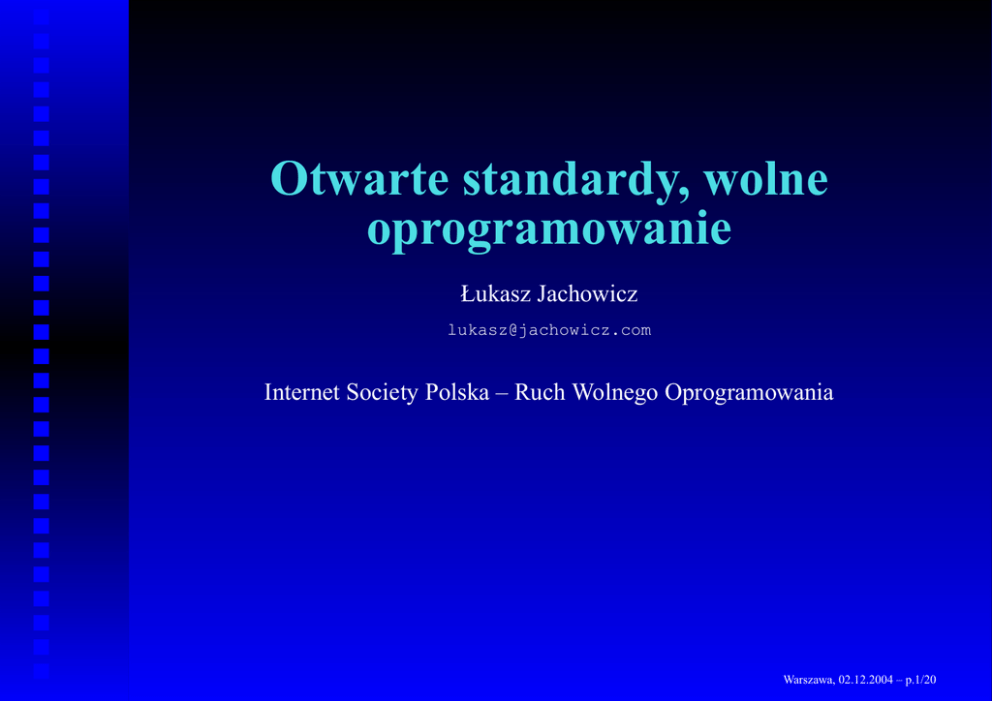 Otwarte standardy, wolne oprogramowanie Łukasz Jachowicz [email protected] Internet Society Polska – Ruch Wolnego Oprogramowania Warszawa, 02.12.2004 – p.1/20 Zamierzchła przeszłość • Każdy producent miał własny system • Zmiana komputera oznaczała zmian˛e oprogramowania • Brak możliwości współpracy różnych maszyn Warszawa, 02.12.2004 – p.2/20 Minione dekady • Poczatki ˛ sieci lokalnych • Walka standardów • NetWare IPX, Appleshare, SMB, TCP/IP itd Warszawa, 02.12.2004 – p.3/20 Dziś • Jedna sieć, jeden standard • Poczta, WWW, SQL, FTP, ASCII • Problemy z nowymi usługami Instant Messaging: GG, ICQ, MSN... Projekty nowych protokołów pocztowych Skype Warszawa, 02.12.2004 – p.4/20 Nie tylko sieć • Pliki graficzne - standaryzacja • Multimedia - cz˛eściowa standaryzacja • Tekst - brak wspólnego standardu • Mieszane dokumenty Warszawa, 02.12.2004 – p.5/20 Po co nam otwarte standardy? • Żeby wiedzieć, jak działać • Żeby si˛e komunikować • Żeby mieć dost˛ep do własnych dokumentów • Żeby nie być przywiazanym ˛ do jednego producenta • Żeby nie było przymusu kupowania PC Warszawa, 02.12.2004 – p.6/20 Cztery podstawowe wolności • Wolność uruchamiania • Wolność badania działania • Wolność dystrybucji • Wolność poprawiania i rozpowszechniania poprawek Warszawa, 02.12.2004 – p.7/20 Co za tym idzie? • Wolność wymiany pomysłów i wiedzy • Neutralność technologiczna, koniec wymuszania stosowania określonych produktów określonych producentów • Brak dyskryminacji, równe szanse w dost˛epie do rynku i do informacji • Rozwój lokalnej informatyki • Pieniadze ˛ sa˛ wydawane lokalnie Warszawa, 02.12.2004 – p.8/20 Wolne oprogramowanie • Czym wi˛ec jest wolne oprogramowanie? • Popularność • Opłacalność • Ale po co komu kod źródłowy? Warszawa, 02.12.2004 – p.9/20 Korzyści • Stabilne, dobrej jakości oprogramowanie, o dużych możliwościach • Korzyści ekonomiczne • Walory edukacyjne • Bezpieczeństwo Warszawa, 02.12.2004 – p.10/20 Korzyści dla przedsi˛ebiorców • Bezpieczeństwo • Elastyczność • Niezależność • Oszcz˛edność • Zaufanie Warszawa, 02.12.2004 – p.11/20 Korzyści dla edukacji • Wartość edukacyjna kodu źródłowego • Uczniowie moga˛ korzystać z tych samych programów w domu i szkole — eliminacja problemu piractwa • Pozytywny wpływ na rozwój ducha współpracy wśród uczniów • Znaczne oszcz˛edności Warszawa, 02.12.2004 – p.12/20 Korzyści dla producentów • • • • • • • Wysokiej klasy narz˛edzia programistyczne Możliwość korzystania z gotowych elementów Brak ograniczeń narzucanych przez system Wolna konkurencja Oszcz˛edność Zaufanie użytkowników Marketingowa przewaga nad zamkni˛etym konkurentem Warszawa, 02.12.2004 – p.13/20 Przykłady oprogramowania W sieci można znaleźć dziesiatki ˛ (setki?) tysi˛ecy programów. Wśród najważniejszych sa: ˛ Linux, BSD – systemy operacyjne OpenOffice.org – pakiet biurowy, zgodny z MS Office GIMP – program graficzny Mozilla – przegladarka ˛ WWW, klient poczty LATEX – profesjonalny system składu tekstu wiele, wiele innych – W chwili tworzenia prezentacji mialem pod r˛eka˛ 20’290 pakietów przygotowanych do instalacji jednym ruchem myszki. W sieci jest ich kilkukrotnie wi˛ecej. Warszawa, 02.12.2004 – p.14/20 Polskie projekty i osiagni˛ ˛ ecia Dystrybucje Linuksa to pot˛eżne projekty majace ˛ na celu przygotowanie gotowych do instalacji środowisk zawierajacych ˛ całe potrzebne oprogramowanie. W Polsce powstało kilkanaście dystrybucji, trzy najwi˛eksze to: PLD – Polska dystrybucja Linuksa, robiona siłami ochotników, znana na całym świecie. Aurox – Komercyjna dystrybucja, zdobywajaca ˛ coraz wi˛eksza˛ popularność w Europie. OpenBIZ – Dystrybucja Linuksa przeznaczona dla użytkowników biznesowych. Projekt komercyjny. Warszawa, 02.12.2004 – p.15/20 Główne wdrożenia • organizacje pozarzadowe ˛ • Sejm i Senat • Straż Graniczna • banki • Elektrownia "Bełchatów" • tysiace ˛ innych. . . Warszawa, 02.12.2004 – p.16/20 Z ostatniej chwili • • • • • • • Open Forum Europe zaleca UE otwarty standard dokumentów Akcja legalizacyjna Novella Parlament wenezuelski - debata o WO w administracji Pekin Monachium Dresdner Kleinwort Wasserstein Finlandia Warszawa, 02.12.2004 – p.17/20 Polskie organizacje W kraju działa (i zgodnie współpracuje) kilka dużych organizacji. • Ruch Wolnego Oprogramowania (sekcja ISOC Poland) • Polska Grupa Użytkowników Linuksa • Grupa Użytkowników Systemu TEX Warszawa, 02.12.2004 – p.18/20 Wi˛ecej informacji • • • • • • http://www.gnu.org/ http://www.opensource.org/ http://www.isoc.org.pl/ http://www.rwo.pl/ http://www.pld-linux.org/ http://7thGuard.net/ Warszawa, 02.12.2004 – p.19/20 Kontakt Łukasz Jachowicz <[email protected]> Niniejsza prezentacja została przygotowana przy użyciu wyłacznie ˛ wolnego oprogramowania. Można ja˛ odtworzyć na każdym współczesnym komputerze - od PDA, poprzez maszyny biurkowe i superkomputery, na starych Amigach kończac. ˛ Warszawa, 02.12.2004 – p.20/20