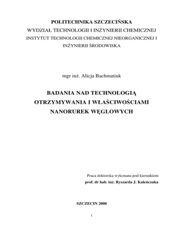 POLITECHNIKA SZCZECIŃSKA WYDZIAŁ TECHNOLOGII I INŻYNIERII CHEMICZNEJ INSTYTUT TECHNOLOGII CHEMICZNEJ NIEORGANICZNEJ I INŻYNIERII ŚRODOWISKA mgr inż. Alicja Bachmatiuk BADANIA NAD TECHNOLOGIĄ OTRZYMYWANIA I WŁAŚCIWOŚCIAMI NANORUREK WĘGLOWYCH Praca doktorska wykonana pod kierunkiem prof. dr hab. inż. Ryszarda J. Kaleńczuka SZCZECIN 2008 1 Składam serdeczne podziękowania Panu prof. dr hab. inż. Ryszardowi J. Kaleńczukowi oraz wszystkim pracownikom Instytutu Technologii Chemicznej Nieorganicznej i Inżynierii Środowiska za okazaną życzliwość, zrozumienie, pomoc oraz cenne uwagi przekazywane w trakcie przygotowywania niniejszej pracy 2 Wstęp............................................................................................................... 5 Część literaturowa....................................................................................... 6 Rozdział 1. Nanostruktury molekularne – nowe materiały............. 7 Rozdział 2. Budowa i rodzaje nanorurek węglowych……................ 7 2.1. Modele nanorurek węglowych................................................... 2.2. Chiralność nanorurek węglowych................................................. 10 7 Rozdział 3. Właściwości nanorurek węglowych.................................. 12 3.1. Właściwości elektryczne............................................................. 3.2. Właściwości magnetyczne........................................................... 18 3.3. Właściwości mechaniczne........................................................... 19 3.4. Właściwości optyczne................................................................. 12 20 Rozdział 4. Zastosowania nanorurek węglowych............................... 21 4.1. Nanorurki w medycynie............................................................. 4.2. Nanorurki w ochronie środowiska............................................. 22 4.3. Nanoelektronika.......................................................................... 22 4.4. Nanokompozyty.......................................................................... 4.5. Nanokontenery – magazynowanie wodoru ............................... 24 22 23 Rozdział 5. Metody otrzymywania nanorurek węglowych……….. 25 5.1. Metoda elektrołukowa…………………………………………… 25 5.2. Metoda laserowa…………………………………………………. 26 5.3. Metoda pirolizy katalitycznej.......................................................... 27 5.4. Inne metody syntezy nanorurek węglowych …............................. 29 5.5. Metody oczyszczania nanorurek węglowych............................. 30 Rozdział 6. Mechanizm wzrostu nanorurek węglowych………...… 32 Rozdział 7. Metody charakteryzacji nanorurek węglowych……... 35 7.1. Spektroskopia Ramana…………………………………………. 35 7.2. Transmisyjna Mikroskopia Elektronowa (TEM)..................... 38 7.3. Skaningowa Transmisyjna Mikroskopia Elektronowa (STEM) 40 połączona z analizą dyspersji energii promieniowania rentgenowskiego (EDS) ............................................................... 7.4. Spektroskopia strat energii elektronów (EELS)…………...…. 3 40 7.5. Dyfrakcja promieni rentgenowskich (XRD)…………………….. Część doświadczalna.................................................................................. 42 44 Cel pracy......................................................................................................... 45 Rozdział 8. Badania nad otrzymywaniem nanorurek węglowych 8.1. Przygotowanie katalizatora Co/Fe-MgO do 45 syntezy 45 materiałów nanorurkowych…………………………………………… 8.2. Synteza dwuściennych nanorurek węglowych (DWCNT)……… 45 8.3. Synteza jednościennych nanorurek węglowych (SWCNT)…...... 54 8.4. Synteza wielościennych nanorurek węglowych (MWCNT)……. 64 8.5. Kontrolowana synteza nanocząstek metalicznych do produkcji 70 nanorurek węglowych ……………………………..……………………... Rozdział 9. Funkcjonalizacja nanorurek węglowych………….……... 75 9.1. Funkcjonalizacja endohedralna nanorurek węglowych…..……. 75 9.1.1. Wypełnianie nanorurek węglowych żelazem………...…………... 75 9.1.2. Wypełnianie nanorurek węglowych chlorkiem srebra (AgCl).…. 80 9.2. Funkcjonalizacja egzohedralna nanorurek węglowych……….... 84 9.2.1. Funkcjonalizacja egzohedralna jednościennych nanorurek 84 węglowych za pomocą związków tytanu…………….…………………... Rozdział 10. Podsumowanie i wnioski………………………………….. 87 Wykaz rysunków.......................................................................................... 90 Literatura....................................................................................................... 96 Spis publikacji autora ................................................................................ 104 4 Wstęp Odkrycie nowych nanomateriałów węglowych, których budowanie odbywa się na poziomie atomowym – atom po atomie, spowodowało gwałtowny wzrost zainteresowania badaniami związanymi z nowymi krystalicznymi formami węgla. Te nowe formy węgla fulereny i nanorurki węglowe są ciągle ciekawym obiektem badawczym. Ich właściwości są nie do końca poznane, a potencjalne zastosowania liczne. Fulereny to molekuły o kształcie kulistym. Najmniejszy, zbudowany z 60 atomów węgla ułożonych w struktury połączonych heksagonów i pentagonów ma formę piłki. Nanorurki węglowe są opisywane jako cylindrycznie zwinięte płaszczyzny grafenowe. Z powodu ich specjalnej jednowymiarowej struktury mają one interesujące właściwości fizyczne. Sposób ułożenie kolejnych atomów węgla (chiralność) wpływa na ich właściwości elektronowe (struktury o charakterze metalicznym lub półprzewodnikowym). Możliwe s