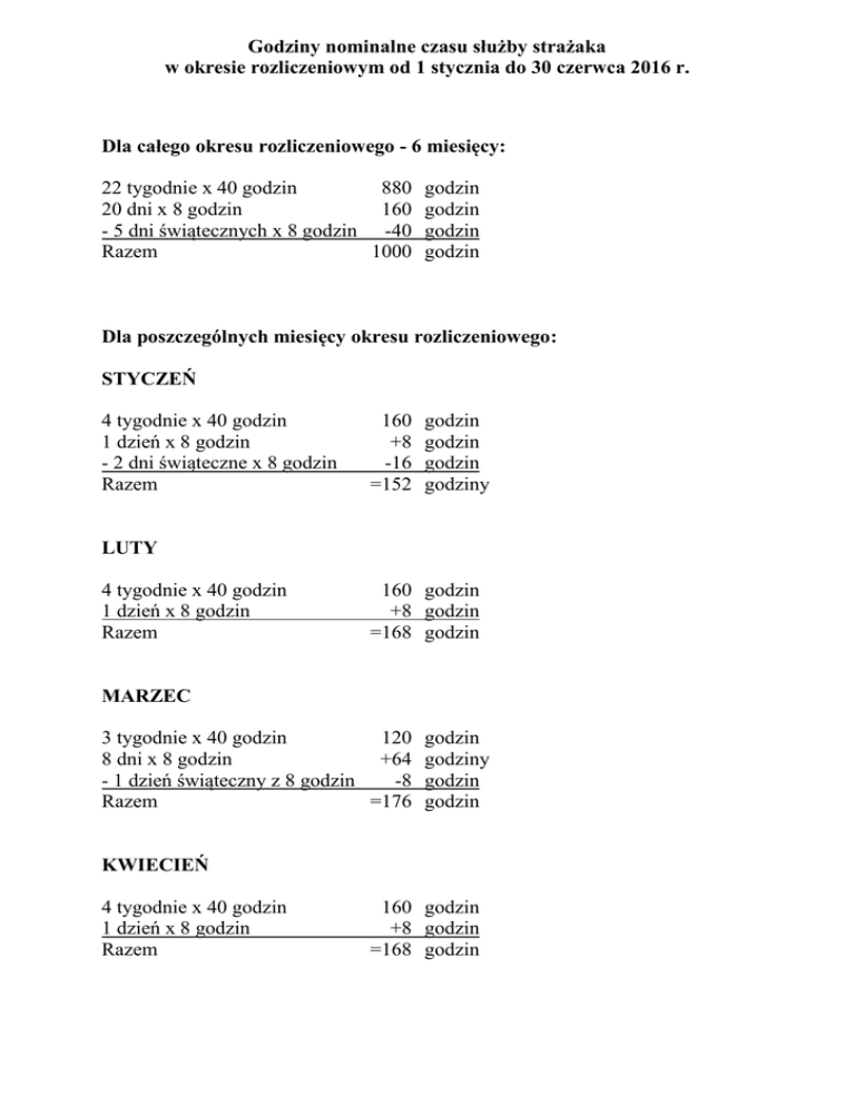 Godziny nominalne czasu służby strażaka w okresie rozliczeniowym od 1 stycznia do 30 czerwca 2016 r. Dla całego okresu rozliczeniowego - 6 miesięcy: 22 tygodnie x 40 godzin 880 20 dni x 8 godzin 160 - 5 dni świątecznych x 8 godzin -40 Razem 1000 godzin godzin godzin godzin Dla poszczególnych miesięcy okresu rozliczeniowego: STYCZEŃ 4 tygodnie x 40 godzin 1 dzień x 8 godzin - 2 dni świąteczne x 8 godzin Razem 160 +8 -16 =152 godzin godzin godzin godziny LUTY 4 tygodnie x 40 godzin 1 dzień x 8 godzin Razem 160 godzin +8 godzin =168 godzin MARZEC 3 tygodnie x 40 godzin 120 8 dni x 8 godzin +64 - 1 dzień świąteczny z 8 godzin -8 Razem =176 godzin godziny godzin godzin KWIECIEŃ 4 tygodnie x 40 godzin 1 dzień x 8 godzin Razem 160 godzin +8 godzin =168 godzin MAJ 4 tygodnie x 40 godzin 2 dni x 8 godzin - 2 dni świąteczne x 8 godzin Razem 160 16 -16 =160 godzin godzin godzin godzin CZERWIEC 3 tygodnie x 40 godzin 7 dni x 8 godzin Razem 120 godzin +56 godzin =176 godzin Suma poszczególnych miesięcy okresu rozliczeniowego: styczeń luty marzec kwiecień maj czerwiec Razem 152 168 176 168 160 176 1000 godziny godzin godzin godzin godzin godzin godzin