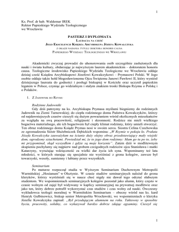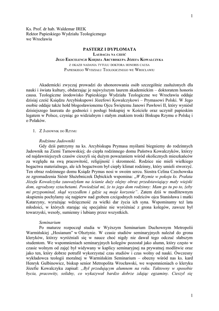1 Ks. Prof. dr hab. Waldemar IREK Rektor Papieskiego Wydziału Teologicznego we Wrocławiu PASTERZ I DYPLOMATA LAUDACJA NA CZEŚĆ JEGO EKSCELENCJI KSIĘDZA ARCYBISKUPA JÓZEFA KOWALCZYKA Z OKAZJI NADANIA TYTUŁU DOKTORA HONORIS CAUSA PAPIESKIEGO WYDZIAŁU TEOLOGICZNEGO WE WROCŁAWIU Akademicki zwyczaj prowadzi do uhonorowania osób szczególnie zasłużonych dla nauki i świata kultury, obdarzając je najwyższym laurem akademickim – doktoratem honoris causa. Teologiczne środowisko Papieskiego Wydziału Teologiczne we Wrocławiu oddaje dzisiaj cześć Księdzu Arcybiskupowi Józefowi Kowalczykowi – Prymasowi Polski. W Jego osobie oddaje także hołd błogosławionemu Ojcu Świętemu Janowi Pawłowi II, który wyniósł dzisiejszego laureata do godności i posługi biskupiej w Kościele oraz uczynił papieskim legatem w Polsce, czyniąc go widzialnym i stałym znakiem troski Biskupa Rzymu o Polskę i o Polaków. 1. Z JADOWNIK DO RZYMU Rodzinne Jadowniki Gdy dziś patrzymy na ks. Arcybiskupa Prymasa myślami biegniemy do rodzinnych Jadownik na Ziemi Tarnowskiej; do ciepła rodzinnego domu Państwa Kowalczyków, którzy od najdawniejszych czasów cieszyli się dużym poważaniem wśród okolicznych mieszkańców za względu na swą pracowitość, religijność i skromność. Rodzice nie mieli wielkiego bogactwa materialnego, ale ich bogactwem był ciepły klimat rodzinny, który umieli stworzyć. Ten obraz rodzinnego domu Ksiądz Prymas nosi w swoim sercu. Siostra Celina Czechowska ze zgromadzenia Sióstr Służebniczek Dębickich wspomina: „W Rzymie w pokoju ks. Prałata Józefa Kowalczyka zauważyłam na ścianie duży olejny obraz przedstawiający mały wiejski dom, ogrodzony sztachetami. Powiedział mi, że to jego dom rodzinny: Mam go tu po to, żeby mi przypominał, skąd wyszedłem i gdzie są moje korzenie”. Zatem dziś w modlitewnym skupieniu pochylamy się najpierw nad grobem czcigodnych rodziców ojca Stanisława i matki Katarzyny, wyrażając wdzięczność za wielki dar życia ich syna. Wspominamy też lata młodości, w których starając się specjalnie nie wyróżniać z grona kolegów, zawsze był towarzyski, wesoły, sumienny i lubiany przez wszystkich. Seminarium Po maturze rozpoczął studia w Wyższym Seminarium Duchownym Metropolii Warmińskiej „Hosianum” w Olsztynie. W czasie studiów seminaryjnych należał do grona kleryków, którzy wyróżniali się w nauce choć nigdy nie dawał tego odczuć słabszym studentom. We wspomnieniach seminaryjnych kolegów pozostał jako alumn, który często w czasie wolnym od zajęć był widywany w kaplicy seminaryjnej na prywatnej modlitwie oraz jako ten, który dobrze potrafił wykorzystać czas studiów i czas wolny od nauki. Ówczesny wykładowca teologii moralnej w Warmińskim Seminarium – obecny wśród nas ks. kard Henryk Gulbinowicz, biskup senior Metropolita Wrocławski, we wspomnieniach o kleryku Józefie Kowalczyku zapisał: „Był przodującym alumnem na roku. Taktowny w sposobie bycia, pracowity, solidny, co wykazywał bardzo dobrze zdając egzaminy. Cieszył się 1 2 zaufaniem kolegów, miał dobrą opinie profesorów, wychowawców i u rektora. Pogodne usposobienie i pracowitość powodowały, że bez przeszkód szedł do kapłaństwa”. Kapłaństwo i studia prawnicze Święcenia kapłańskie otrzymał 14 stycznia 1962 roku. Jako motto kapłańskiego życia przyjął słowa modlitwy liturgicznej: „Panie Jezu Chryste, spraw bym zawsze strzegł przykazań Twoich i nie dozwól mi nigdy odłączyć się od Ciebie”. Po świeceniach pełnił posługę duszpasterską jako wikariusz w parafii Świętej Trójcy w Kwidzynie. Następnie w październiku 1963 rozpoczął studia na Wydziale Prawa Kanonicznego Katolickiego Uniwersytetu Lubelskiego, a w lutym 1965 roku udał się do Rzymu, aby kontynuować naukę na Papieskim Uniwersytecie Gregoriańskim. Przygotowując rozprawę doktorską pasjonował się problematyką badań naukowych, dotyczących nadzwyczajnych szafarzy bierzmowania. Chętnie dzielił się swoimi przemyśleniami z kolegami. Naukowe poszukiwania doprowadziły do sukcesu – obrony pracy doktorskiej w 1968 roku a po opublikowaniu jednej z jej części do otrzymania rok później tytułu doktora prawa kanoniczego. Po zdobyciu dyplomu na Papieskim Uniwersytecie Gregoriańskim w Rzymie, ukończył trzyletni kurs Świętej Roty Rzymskiej i uzyskał wysoko cenionego dyplomu archiwisty w Tajnym Archiwum Watykańskim. Tak znaczne sukcesy naukowe były możliwe dzięki sumienniej i systematycznej pracy, która potwierdziła dewizę życiową dzisiejszego laureata „Co masz zrobić jutro, zrób dzisiaj”. Praca w Watykanie Po studiach zajmował wiele odpowiedzialnych stanowisk w Kurii Rzymskiej. Przeszedł tam dobrą szkołę dyplomacji watykańskiej, uchodzącej za najdyskretniejszą i najsprawniejszą na świecie, jeżdżąc w latach siedemdziesiątych ubiegłego stulecia do Polski z Arcybiskupem Luigim Poggim, Nuncjuszem Apostolskim do specjalnych poruczeń. Brał udział w podejmowanych działaniach, mających na celu zbliżenie miedzy Stolicą Apostolską a krajami zza „żelaznej kurtyny”. Wizytował diecezje, seminaria duchowne i prowadził trudne rozmowy z ówczesnymi władzami. Po wyborze papieża Jana Pawła II w 1978 roku zorganizował Sekcję Polską w Sekretariacie Stanu Stolicy Apostolskiej. Należał do wąskiego grona zaufanych współpracowników Ojca Świętego, którzy pracowali nad tekstami papieskich przemówień. Podczas pielgrzymek apostolskich był członkiem papieskiego orszaku. Przewodniczył watykańskiej Komisji ds. Publikacji Pism i Przekładów Obcojęzycznych Dzieł Karola Wojtyły. Ponadto zredagował czternaście tomów nauczania Jana Pawła II wydanych w języku polskim. Lata posługi w Watykanie, Arcybiskup Józef Kowalczyk uważa za wielką łaskę i określa szczególną i niepowtarzalną szkołą tajemnicy Kościoła i człowieka. Watykańscy współpracowni