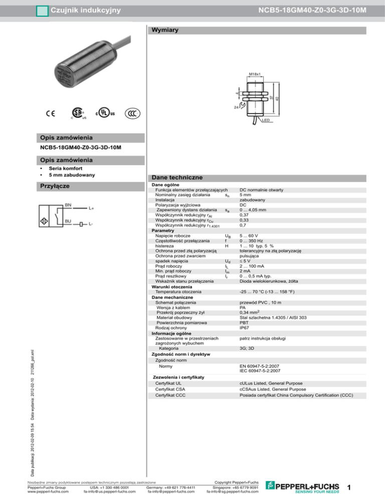 Czujnik indukcyjny NCB5-18GM40-Z0-3G-3D-10M Wymiary 37 40 4 M18x1 24 S LED Opis zamówienia NCB5-18GM40-Z0-3G-3D-10M Opis zamówienia • • Seria komfort 5 mm zabudowany Przyłącze BN L- Dane ogólne Funkcja elementów przełączających Nominalny zasięg działania sn Instalacja Polaryzacja wyjżciowa Zapewniony dystans działania sa Współczynnik redukcyjny rAl Współczynnik redukcyjny rCu Współczynnik redukcyjny r1.4301 Parametry Napięcie robocze UB Częstotliwość przełączania f histereza H Ochrona przed złą polaryzacją Ochrona przed zwarciem spadek napięcia Ud Prąd roboczy IL Min. prąd roboczy Im Prąd resztkowy Ir Wskażnik stanu przełączenia Warunki otoczenia Temperatura otoczenia Dane mechaniczne Schemat połączenia Wersja z kablem Przekrój poprzeczny żył Materiał obudowy Powierzchnia pomiarowa Rodzaj ochrony Informacje ogólne Zastosowanie w przestrzeniach zagrożonych wybuchem Kategoria Zgodność norm i dyrektyw Zgodność norm Normy Zezwolenia i certyfikaty Certyfikat UL Certyfikat CSA Certyfikat CCC DC normalnie otwarty 5 mm zabudowany DC 0 ... 4,05 mm 0,37 0,33 0,7 5 ... 60 V 0 ... 350 Hz 1 ... 10 typ. 5 % tolerancyjny na złą polaryzację pulsująca ≤5V 2 ... 100 mA 2 mA 0 ... 0,5 mA typ. Dioda wielokierunkowa, żółta -25 ... 70 °C (-13 ... 158 °F) przewód PVC , 10 m PA 0,34 mm2 Stal szlachetna 1.4305 / AISI 303 PBT IP67 patrz instrukcja obsługi 3G; 3D EN 60947-5-2:2007 IEC 60947-5-2:2007 cULus Listed, General Purpose cCSAus Listed, General Purpose Posiada certyfikat China Compulsory Certification (CCC) Data publikacji: 2012-02-09 15:54 Data wydania: 2012-02-10 211266_pol.xml BU L+ Dane techniczne Niezbêdne zmiany podyktowane postêpem technicznym pozostaj¹ zastrze¿one Pepperl+Fuchs Group USA: +1 330 486 0001 Germany: +49 621 776-4411 www.pepperl-fuchs.com [email protected] [email protected] Copyright Pepperl+Fuchs Singapore: +65 6779 9091 [email protected] 1 Czujnik indukcyjny ATEX 3G (nA) Instrukcja obsługi Kategoria urządzenia 3G (nA) zgodność z wytycznymi Zgodność norm NCB5-18GM40-Z0-3G-3D-10M Urządzenia elektryczne dla przestrzeni zagrożonych wybuchem do użytku w przestrzeniach zagrożonych wybuchem gazu, oparów i mgły. 94/9/EG EN 60079-0:2006, EN 60079-15:2005 Zabezpieczenie przed zapłonem typu "n" ograniczenie przez następujące warunki Oznakowanie CE Znak Ex Informacje ogólne Instalacja, uruchomienie Konserwacja, serwis ¬ II 3G Ex nA IIC T6 X Znak Ex może być wydrukowany również na załączonej etykietce. Urządzenie należy używać zgodnie z danymi katalogowymi oraz danymi zawartymi w tej instrukcji obsługi. Podane dane katalogowe ograniczone są przez tą instrukcję obsługi! Należy przestrzegać warunków szczególnych! Należy przestrzegać przepisów prawnych i/lub rozporządzeń i norm regulujących użycie lub też użycia zgodnego z przeznaczeniem. Jeżeli znak Ex znajduje się wyłącznie na załączonej etykietce, musi ona zostać umieszczona bezpośrednio w pobliżu czujnika! Powierzchnia naklejenia musi być czysta, odtłuszczona i gładka! Przyklejona etykietka musi być czytelna i trwała, również pod wpływem ewentualnej korozji chemicznej! Nie wolno dokonywać żadnych zmian przy urządzeniach przeznaczonych do pracy w przestrzeniach zagrożonych wybuchem. Wykonywanie napraw tych urządzeń nie jest możliwe. Szczególne warunki Maksymalny prąd obciążenia IL Data publikacji: 2012-02-09 15:54 Data wydania: 2012-02-10 211266_pol.xml Maksymalne dopuszczalne wartości prądu obciążenia są ograniczone do wartości podanych w następującej liście. Wyższe wartości prądu obciążenia i zwarcia nie są dopuszczalne. Maksymalne napięcie robocze UBmax Maksymalne dopuszczalne wartości napięcia roboczego UBmax ograniczone są do wartości podanych w następującej liście, tolerancja nie jest dopuszczalna. w zależności od prądu obciążenia IL i max. napięcia roboczego UBmax. Maksymalna dopuszczalna temperaDane zawarte są w następującej liście. tura otoczenia TUmax 50 °C (122 °F) gdy UBmax=60 V, IL=100 mA gdy UBmax=60 V, IL=50 mA 56 °C (132,8 °F) gdy UBmax=60 V, IL=25 mA 60 °C (140 °F) Ochrona przed uszkodzeniami mecha- Czujnik nie może być narażony na ŻADNE mechaniczne uszkodzenia. nicznymi Ochrona przed żwiatłem UV Czujnik i przewód instalacyjny należy chronić przed szkodliwym promieniowaniem UV. Możliwe jest to przez montaż wewnątrz pomieszczeń. Wyładowanie elektrostatyczne Należy unikać wyładowań elektrostatycznych metalowych elementów obudowy. Uniknięcie niebezpiecznego wywyładowania elektrostatycznego metalowych komponentów obudowy możliwe jest przez ich uziemienie. Ochrona przewodu instalacyjnego Należy chronić przewód instalacyjny przed naprężeniem i przekręceniem. 2 Niezbêdne zmiany podyktowane postêpem technicznym pozostaj¹ zastrze¿one Pepperl+Fuchs Group USA: +1 330 486 0001 Germany: +49 621 776-4411 www.pepperl-fuchs.com [email protected] [email protected] Copyright Pepperl+Fuchs Singapore: +65 6779 9091 [email protected] Czujnik indukcyjny ATEX 3D (tD) Instrukcja obsługi Kategoria urządzenia 3D zgodność z wytycznymi Zgodność norm NCB5-18GM40-Z0-3G-3D-10M Urządzenia elektryczne dla przestrzeni zagrożonych wybuchem do użytku w przestrzeniach zagrożonych wybuchem z obecnością palnego pyłu 94/9/EG EN 61241-0:2006, EN 61241-1:2004 ochrona przez obudowÄ™ âÄžtDâÄ″ ograniczenie przez następujące warunki Oznakowanie CE Znak Ex ¬ II 3D Ex tD A22 IP67 T80°C X Znak Ex może być wydrukowany również na załączonej etykietce. Informacje ogólne Urządzenie należy używać zgodnie z danymi katalogowymi oraz danymi zawartymi w tej instrukcji obsługi. MaksymalnÄ… temperaturÄ™ powierzchni okreĹ›lono na podstawie metody A bez warstwy pyĹ‚u na materiale. Podane dane katalogowe ograniczone są przez tą instrukcję obsługi! Należy przestrzegać warunków szczególnych! Należy przestrzegać przepisów pra
