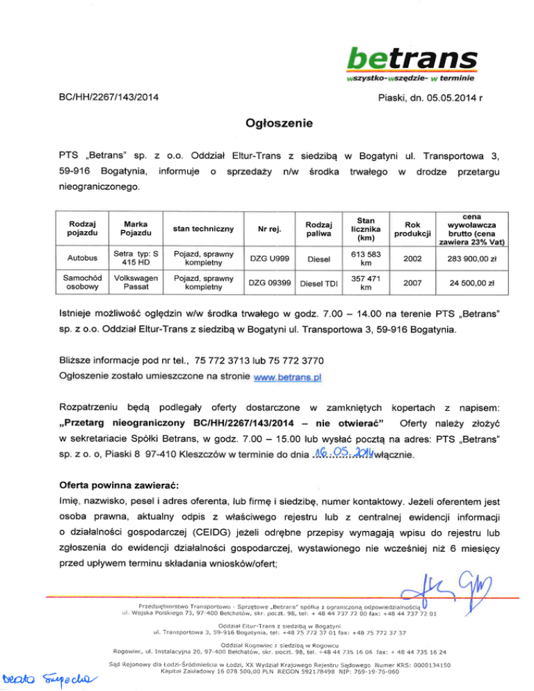 sp. z o.o. Oddzial Eltur-Trans z siedzibq w Bogatyni ul. Transportowa 3, 59-916 Bogatynia.
