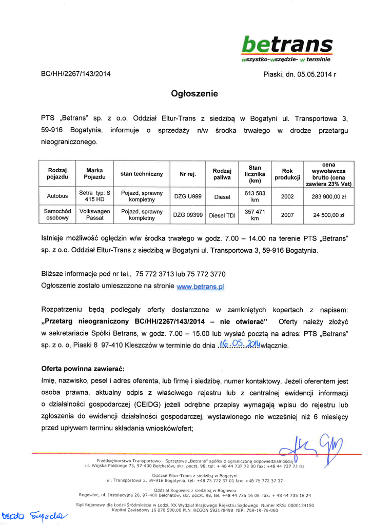 w sekretariacie Spolki Betrans, w godz.7.00 - 15.00 lub wysla6 pocztq na adres: PTS,,Betrans"