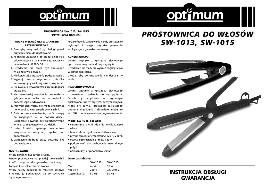 PROSTOWNICA SW-1013, SW-1015 INSTRUKCJA OBSŁUGI WAŻNE WSKAZÓWKI W ZAKRESIE BEZPIECZEŃSTWA 1. Przeczytaj całą instrukcję obsługi przed przystąpieniem do użytkowania. 2. Podłączaj urządzenie do prądu o napięciu odpowiadającym parametrom zaznaczonym na urządzeniu (230 V 50 Hz). 3. Urządzenie nie może być zanurzane w jakimkolwiek płynie. 4. Nie korzystaj z urządzenia podczas kąpieli. 5. Wyjmuj zawsze wtyczkę z gniazdka sieciowego gdy nie korzystasz z urządzenia. 6. Nie zawijaj przewodu zasilającego dookoła urządzenia. 7. Nie pozostawiaj urządzenia bez nadzoru gdy jest ono podłączone do prądu lub podczas jego użytkowania. 8. Przewód elektryczny nie może znajdować się w pobliżu nagrzanych powierzchni. 9. Podczas pracy urządzenia, zwróć uwagę na znajdujące się w pobliżu dzieci. Urządzenie powinno być przechowywane w miejscu niedostępnym dla dzieci. 10. Unikaj kontaktu grzejnych elementów urządzenia ze skórą, aby zapobiec ew. poparzeniom. 11. Urządzenie podczas pracy powinno być pod nadzorem. UŻYTKOWANIE: Włosy powinny być czyste i suche. Ustaw prostownicę na płaskiej powierzchni i włóż wtyczkę do gniazdka sieciowego. Lampka kontrolna zacznie świecić. Włosy należy podzielić na mniejsze kosmyki i kolejno je podgrzewać, aż do uzyskania żądanego rezultatu. Po zakończeniu użytkowania należy prostownicę wyłączyć i wyjąć wtyczkę przewodu zasilającego z gniazdka sieciowego. PROSTOWNICA DO WŁOSÓW SW-1013, SW-1015 KONSERWACJA: Wyjmij wtyczkę z gniazdka sieciowego i pozostaw urządzenie do wystygnięcia. Urządzenie można teraz wytrzeć miękką, lekko wilgotną ściereczką. Uważaj, aby do urządzenia nie dostała się woda. PRZECHOWYWANIE: Wyjmij wtyczkę z gniazdka sieciowego i pozostaw urządzenie do wystygnięcia. Przechowuj urządzenie w orginalnym opakowaniu lub w czystym, suchym miejscu. Nigdy nie zawijaj przewodu zasilającego dookoła urządzenia, albowiem może to w krótkim czasie spowodować jego uszkodzenie. Model SW-1015 posiada: • ceramiczne płytki idealnie wygładzające włosy • temperatura regulowana elektronicznie • płynna regulacja temperatury: 120 0C-210 0C • odżywiające działanie jonów i pary • podczerwień dla zachowania naturalnego połysku • nowoczesny, ergonomiczny kształt Dane techniczne: SW-1013 Moc: 45 W Napięcie: ~230 V Częstotliwość: 50 Hz SW-1015 50 W ~220-240 V 50 Hz INSTRUKCJA OBSŁUGI GWARANCJA PROSTOWNICA SW-1013, SW-1015 INSTRUKCJA OBSŁUGI WAŻNE WSKAZÓWKI W ZAKRESIE BEZPIECZEŃSTWA 1. Przeczytaj całą instrukcję obsługi przed przystąpieniem do użytkowania. 2. Podłączaj urządzenie do prądu o napięciu odpowiadającym parametrom zaznaczonym na urządzeniu (230 V 50 Hz). 3. Urządzenie nie może być zanurzane w jakimkolwiek płynie. 4. Nie korzystaj z urządzenia podczas kąpieli. 5. Wyjmuj zawsze wtyczkę z gniazdka sieciowego gdy nie korzystasz z urządzenia. 6. Nie zawijaj przewodu zasilającego dookoła urządzenia. 7. Nie pozostawiaj urządzenia bez nadzoru gdy jest ono podłączone do prądu lub podczas jego użytkowania. 8. Przewód elektryczny nie może znajdować się w pobliżu nagrzanych powierzchni. 9. Podczas pracy urządzenia, zwróć uwagę na znajdujące się w pobliżu dzieci. Urządzenie powinno być przechowywane w miejscu niedostępnym dla dzieci. 10. Unikaj kontaktu grzejnych elementów urządzenia ze skórą, aby zapobiec ew. poparzeniom. 11. Urządzenie podczas pracy powinno być pod nadzorem. UŻYTKOWANIE: Włosy powinny być czyste i suche. Ustaw prostownicę na płaskiej powierzchni i włóż wtyczkę do gniazdka sieciowego. Lampka kontrolna zacznie świecić. Włosy należy podzielić na mniejsze kosmyki i kolejno je podgrzewać, aż do uzyskania żądanego rezultatu. Po zakończeniu użytkowania należy prostownicę wyłączyć i wyjąć wtyczkę przewodu zasilającego z gniazdka sieciowego. PROSTOWNICA DO WŁOSÓW SW-1013, SW-1015 KONSERWACJA: Wyjmij wtyczkę z gniazdka sieciowego i pozostaw urządzenie do wystygnięcia. Urządzenie można teraz wytrzeć miękką, lekko wilgotną ściereczką. Uważaj, aby do urządzenia nie dostała się woda. PRZECHOWYWANIE: Wyjmij wtyczkę z gniazdka sieciowego i pozostaw urządzenie do wystygnięcia. Przechowuj urządzenie w orginalnym opakowaniu lub w czystym, suchym miejscu. Nigdy nie zawijaj przewodu zasilającego dookoła urządzenia, albowiem może to w krótkim czasie spowodować jego uszkodzenie. Model SW-1015 posiada: • ceramiczne płytki idealnie wygładzające włosy • temperatura regulowana elektronicznie • płynna regulacja temperatury: 120 0C-210 0C • odżywiające działanie jonów i pary • podczerwień dla zachowania naturalnego połysku • nowoczesny, ergonomiczny kształt Dane techniczne: SW-1013 Moc: 45 W Napięcie: ~230 V Częstotliwość: 50 Hz SW-1015 50 W ~220-240 V 50 Hz INSTRUKCJA OBSŁUGI GWARANCJA