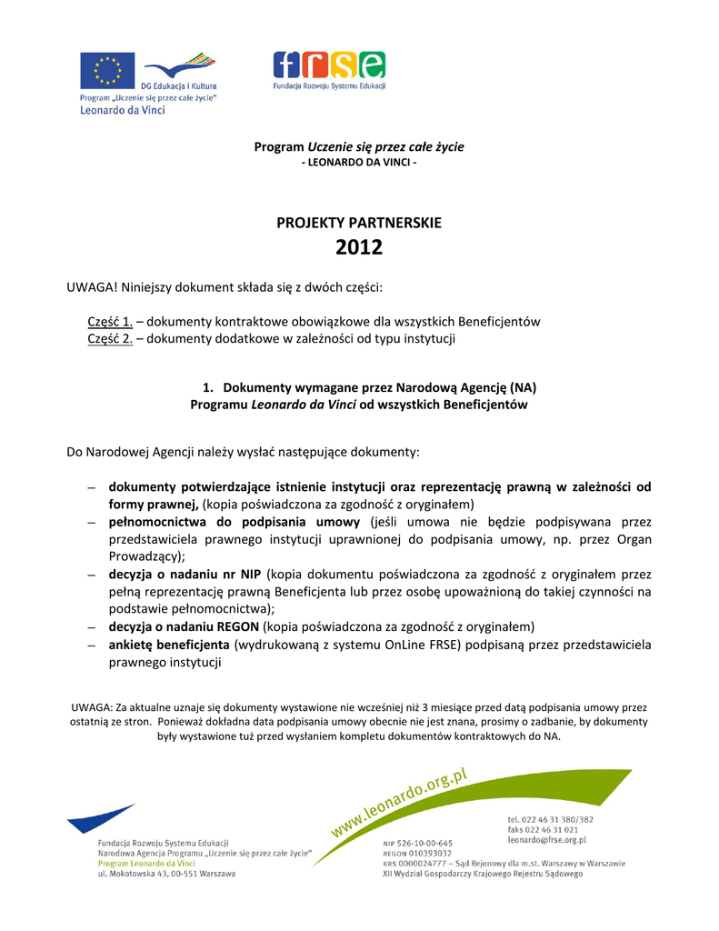 Program Uczenie się przez całe życie - LEONARDO DA VINCI - PROJEKTY PARTNERSKIE 2012 UWAGA! Niniejszy dokument składa się z dwóch części: Część 1. – dokumenty kontraktowe obowiązkowe dla wszystkich Beneficjentów Część 2. – dokumenty dodatkowe w zależności od typu instytucji 1. Dokumenty wymagane przez Narodową Agencję (NA) Programu Leonardo da Vinci od wszystkich Beneficjentów Do Narodowej Agencji należy wysłać następujące dokumenty: dokumenty potwierdzające istnienie instytucji oraz reprezentację prawną w zależności od formy prawnej, (kopia poświadczona za zgodność z oryginałem) pełnomocnictwa do podpisania umowy (jeśli umowa nie będzie podpisywana przez przedstawiciela prawnego instytucji uprawnionej do podpisania umowy, np. przez Organ Prowadzący); decyzja o nadaniu nr NIP (kopia dokumentu poświadczona za zgodność z oryginałem przez pełną reprezentację prawną Beneficjenta lub przez osobę upoważnioną do takiej czynności na podstawie pełnomocnictwa); decyzja o nadaniu REGON (kopia poświadczona za zgodność z oryginałem) ankietę beneficjenta (wydrukowaną z systemu OnLine FRSE) podpisaną przez przedstawiciela prawnego instytucji UWAGA: Za aktualne uznaje się dokumenty wystawione nie wcześniej niż 3 miesiące przed datą podpisania umowy przez ostatnią ze stron. Ponieważ dokładna data podpisania umowy obecnie nie jest znana, prosimy o zadbanie, by dokumenty były wystawione tuż przed wysłaniem kompletu dokumentów kontraktowych do NA. 2. Dokumenty wymagane przez Narodową Agencję (NA) Programu Leonardo da Vinci w zależności od typu instytucji A) Jednostki samorządu terytorialnego oraz ich jednostki budżetowe: Województwo 1. Wyciąg ze statutu województwa**, 2. Dokumenty o wyborze zarządu województwa oraz innych osób upoważnionych do zawarcia i realizacji Umowy (pełnomocnicy, główny księgowy budżetu województwa), 3. Uchwały właściwych organów lub inne akty wewnętrzne wymagane przez statut województwa lub właściwe przepisy do zawarcia i realizacji Umów. Wojewódzkie samorządowe jednostki organizacyjne 1. Wyciąg ze statutu województwa**, 2. Dokumenty o wyborze zarządu województwa oraz innych osób upoważnionych do zawarcia i realizacji Umowy (pełnomocnicy, główny księgowy budżetu województwa), 3. Uchwała sejmiku województwa o utworzeniu wojewódzkiej samorządowej jednostki organizacyjnej, 4. Wyciąg ze statutu wojewódzkiej samorządowej jednostki organizacyjnej**, 5. Dokument o powołaniu kierownika wojewódzkiej samorządowej jednostki organizacyjnej, 6. Pełnomocnictwo dla kierownika wojewódzkiej samorządowej jednostki organizacyjnej udzielone przez zarząd województwa do zawarcia i realizacji Umowy, 7. Uchwały właściwych organów lub inne akty wewnętrzne, jeżeli są wymagane przez statut województwa, statut wojewódzkiej samorządowej jednostki organizacyjnej lub właściwe przepisy do zawarcia i realizacji Umowy. Powiat 1. Dokumenty o wyborze zarządu powiatu oraz innych osób upoważnionych do zawarcia i realizacji Umowy (pełnomocnicy, skarbnik), 2. Uchwały bądź akty wewnętrzne, jeżeli są wymagane przez statut powiatu lub właściwe przepisy do zawarcia i realizacji Umowy. Powiatowe jednostki organizacyjne 1. Dokumenty o wyborze zarządu powiatu oraz innych osób upoważnionych do zawarcia i realizacji Umowy (pełnomocnicy, skarbnik), 2. Uchwały bądź akty wewnętrzne, jeżeli są wymagane przez statut powiatu lub właściwe przepisy do zawarcia i realizacji Umowy, 3. Uchwała rady powiatu o utworzeniu powiatowej jednostki organizacyjnej**, 4. Wyciąg z regulaminu organizacyjnego powiatowej jednostki organizacyjnej, 5. Dokument o powołaniu kierownika powiatowej jednostki organizacyjnej, 6. Pełnomocnictwo dla kierownika powiatowej jednostki organizacyjnej udzielone przez zarząd powiatu do zawarcia i realizacji Umowy, Gmina 1. Dokumenty o wyborze wójta/burmistrza/prezydenta miasta oraz innych osób upoważnionych do zawarcia i realizacji Umowy (zastępcy, skarbnik, pełnomocnicy), 2. Uchwały bądź inne akty wewnętrzne, jeżeli są wymagane przez statut gminy lub właściwe przepisy do zawarcia i realizacji Umowy. Gminne jednostki organizacyjne 1. Dokumenty o wyborze wójta/burmistrza/prezydenta miasta oraz innych osób upoważnionych do zawarcia i realizacji Umowy (zastępcy, skarbnik, pełnomocnicy), 2 2. 3. 4. 5. 6. Uchwały bądź inne akty wewnętrzne, jeżeli są wymagane przez statut gminy lub właściwe przepisy do zawarcia i realizacji Umowy, Uchwała rady gminy o utworzeniu gminnej jednostki organizacyjnej, Wyciąg z regulaminu organizacyjnego gminnej jednostki organizacyjnej, Dokument o powołaniu kierownika gminnej jednostki organizacyjnej, Pełnomocnictwo dla kierownika gminnej jednostki organizacyjnej udzielone przez wójta do zawarcia i realizacji Umowy, B) Uczelnie publiczne 1. Wyciąg ze statutu**, 2. Dokument o powołaniu rektora oraz ewentualnie innych osób uprawnionych do reprezentacji uczelni publicznej, 3. Uchwały właściwych organów lub inne akty wewnętrzne, jeżeli są wymagane przez statut uczelni lub właściwe przepisy do zawarcia i realizacji Umowy. C) Uczelnie niepubliczne * 1. Aktualny wypis z rejestru uczelni niepublicznych, 2. Wyciąg ze statutu uczelni niepublicznej**, 3. Dokument o powołaniu rektora oraz ewentualnie innych osób uprawnionych do reprezentacji uczelni niepublicznej, 4. Określone przez NA dokumenty dotyczące założycieli uczelni niepublicznej. D) Fundacje i stowarzyszenia * 1. Aktualny odpis z Krajowego Rejestru Sądowego (KRS), 2. Statut fundacji lub stowarzyszenia, 3. Uchwały lub inne akty wewnętrzne, jeżeli zgodnie ze statutem organizacji są wymagane do zawarcia Umowy, E) Publiczne ośrodki kultury (lub inne ośrodki kultury, np. biblioteki) 1. Dokument informujący o powołaniu dyrektora, 2. Wyciąg ze statutu**, 3. Wypis z rejestru instytucji kultury prowadzonego przez właściwy miejscowo u