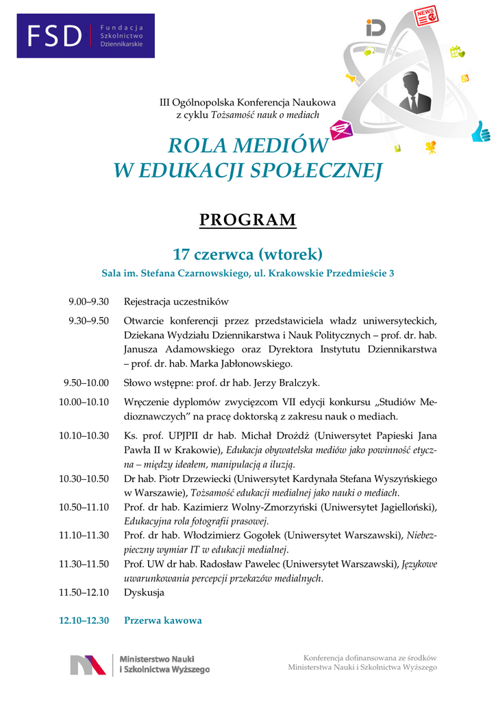 III Ogólnopolska Konferencja Naukowa z cyklu Tożsamość nauk o mediach ROLA MEDIÓW W EDUKACJI SPOŁECZNEJ PROGRAM 17 czerwca (wtorek) Sala im. Stefana Czarnowskiego, ul. Krakowskie Przedmieście 3 9.00–9.30 Rejestracja uczestników 9.30–9.50 Otwarcie konferencji przez przedstawiciela władz uniwersyteckich, Dziekana Wydziału Dziennikarstwa i Nauk Politycznych – prof. dr. hab. Janusza Adamowskiego oraz Dyrektora Instytutu Dziennikarstwa – prof. dr. hab. Marka Jabłonowskiego. 9.50–10.00 Słowo wstępne: prof. dr hab. Jerzy Bralczyk. 10.00–10.10 Wręczenie dyplomów zwycięzcom VII edycji konkursu „Studiów Medioznawczych” na pracę doktorską z zakresu nauk o mediach. 10.10–10.30 11.50–12.10 Ks. prof. UPJPII dr hab. Michał Drożdż (Uniwersytet Papieski Jana Pawła II w Krakowie), Edukacja obywatelska mediów jako powinność etyczna – między ideałem, manipulacją a iluzją. Dr hab. Piotr Drzewiecki (Uniwersytet Kardynała Stefana Wyszyńskiego w Warszawie), Tożsamość edukacji medialnej jako nauki o mediach. Prof. dr hab. Kazimierz Wolny-Zmorzyński (Uniwersytet Jagielloński), Edukacyjna rola fotografii prasowej. Prof. dr hab. Włodzimierz Gogołek (Uniwersytet Warszawski), Niebezpieczny wymiar IT w edukacji medialnej. Prof. UW dr hab. Radosław Pawelec (Uniwersytet Warszawski), Językowe uwarunkowania percepcji przekazów medialnych. Dyskusja 12.10–12.30 Przerwa kawowa 10.30–10.50 10.50–11.10 11.10–11.30 11.30–11.50 Konferencja dofinansowana ze środków Ministerstwa Nauki i Szkolnictwa Wyższego 13.50–14.10 Dr hab. Alicja Jaskiernia (Uniwersytet Warszawski), Edukacja medialna w polityce medialnej oraz Europejskiej Agendzie Cyfrowej Unii Europejskiej w epoce konwergencji. Dr Piotr Drąg (Uniwersytet Jagielloński), Edukacja społeczna przez symbole narodowe. Case study media amerykańskie. Dr Maja Chacińska (Uniwersytet Gdański), Edukacyjna rola szwedzkich mediów publicznych – przykład do naśladowania w edukacji społecznej. Mgr Anna Latos (Uniwersytet Śląski w Katowicach), Sposób użytkowania nowych mediów oraz poziom kompetencji medialnych i informacyjnych młodzieży w Polsce i Niemczech. Dyskusja 14.10–15.20 Obiad 12.30–12.50 12.50–13.10 13.10–13.30 13.30–13.50 PANEL I: Młode pokolenie a przekaz wizualny Sala 2, ul. Krakowskie Przedmieście 3 15.20–15.40 17.40–18.00 Prof. UKSW dr hab. Grzegorz Łęcicki (Uniwersytet Kardynała Stefana Wyszyńskiego w Warszawie), Edukacyjno-wychowawcze aspekty polskich seriali telewizyjnych dla młodzieży z epoki PRL-u. Prof. UMK dr hab. Andrzej Adamski (Uniwersytet Mikołaja Kopernika w Toruniu), Edukacyjny charakter czasopism dla dzieci w Polsce w dwudziestoleciu międzywojennym (1918–1939). Dr Magdalena Trysińska (Uniwersytet Warszawski), Wzorcotwórcza funkcja mediów a edukacja medialna społeczeństwa (na przykładzie filmów animowanych dla dzieci). Dr Dorota Lewandowska-Jaros (Uniwersytet Warszawski), Kształtowanie wizerunku mediów i ich funkcji społecznej w świadomości dzieci – na podstawie obrazu pracy i sylwetki dziennikarza w filmach animowanych z serii »Monster High« i »My Little Pony«. Dr Anna Sugier-Szerega (Katolicki Uniwersytet Lubelski), Edukacyjny wymiar oferty programowej TVP ABC – szanse i zagrożenia. Dr Karina Stasiuk-Krajewska (Uniwersytet Wrocławski), »Reklama skierowana do dzieci« – kody, dyskursy, regulacje. Mgr Anna Kurzak (Politechnika Częstochowska), Stosowanie innowacji informatycznych w mediach na przykładzie działań podejmowanych w reklamie telewizyjnej. Dyskusja 18.30 Uroczysta kolacja (ogrody na tyłach Pałacu Kazimierzowskiego, 15.40–16.00 16.00–16.20 16.20–16.40 16.40–17.00 17.00–17.20 17.20-17.40 ul. Krakowskie Przedmieście 26/28) Konferencja dofinansowana ze środków Ministerstwa Nauki i Szkolnictwa Wyższego PANEL II: Obywatele, państwo, społeczności lokalne Sala 3, ul. Krakowskie Przedmieście 3 15.20–15.40 15.40–16.00 16.00-16.20 16.20–16.40 16.40–17.00 17.00–17.20 17.20–17.40 17.40–18.00 Dr Jacek Wojsław (Uniwersytet Gdański), Tygodnik »Polityka« w 1980 roku: narzędzie edukacji społecznej czy politycznej indoktrynacji? Mgr Michał Alagierski (Uniwersytet Łódzki), Polityka bliskowschodnia w środkach masowego przekazu. Dr Katarzyna Drąg (Uniwersytet Papieski Jana Pawła II w Krakowie), Dziennikarstwo jako „zespolenie ludzkich sił”. J. I. Kraszewski o społecznej misji prasy. Dr Anna Kalinowska-Żeleźnik, dr Anna Lusińska (Uniwersytet Gdański), Rola mediów masowych w edukacji regionalnej. Mgr Katarzyna Rodek (Uniwersytet Warszawski), Rozgłośnie społeczne w Polsce. Ich miejsce i rola w systemie medialnym. Dr Andrzej Kansy (Towarzystwo Naukowe Płockie), Media społecznego ruchu naukowego w służbie upowszechniania nauki – na przykładzie Towarzystwa Naukowego Płockiego. Mgr Krzysztof Drozdowicz (Uniwersytet im. Adama Mickiewicza w Poznaniu), Sprawozdawczość sądowa w postępowaniu cywilnym. Dyskusja 18 czerwca (środa) PANEL I: Telewizja i prasa w edukacji Sala 2, ul. Krakowskie Przedmieście 3 11.00–11.20 Dr hab. Jacek Wasilewski (Uniwersytet Warszawski), Czego i jak uczymy się z telewizji? Dr Karolina Brylska (Uniwersytet Warszawski), Bank informacji czy targowisko opinii? Programy publicystyczne podczas kampanii wyborczej do Parlamentu Europejskiego. Mgr Dominik Borek (Katolicki Uniwersytet Lubelski), Rola mediów publicznych w społecznym odbiorze relacji z widowiska sportowego – walory edukacyjne. Dyskusja 11.20–11.40 Przerwa kawowa 10.00–10.20 10.20–10.40 10.40–11.00 Konferencja dofinansowana ze środków Ministerstwa Nauki i Szkolnictwa Wyższego 11.40–12.00 12.00–12.20 12.20–12.40 12.40–13.00 Dr Mirosław Matosek (Wyższa Szkoła Biznesu i Administracji w Łukowie), Edukacyjna funkcja mediów firmowych. Dr Judyta Perczak (Uniwersytet Jana Kochanowskiego w Kielcach), Nie tylko czary mary. Czy prasa ezoteryczna ma walory edukacyjne? 