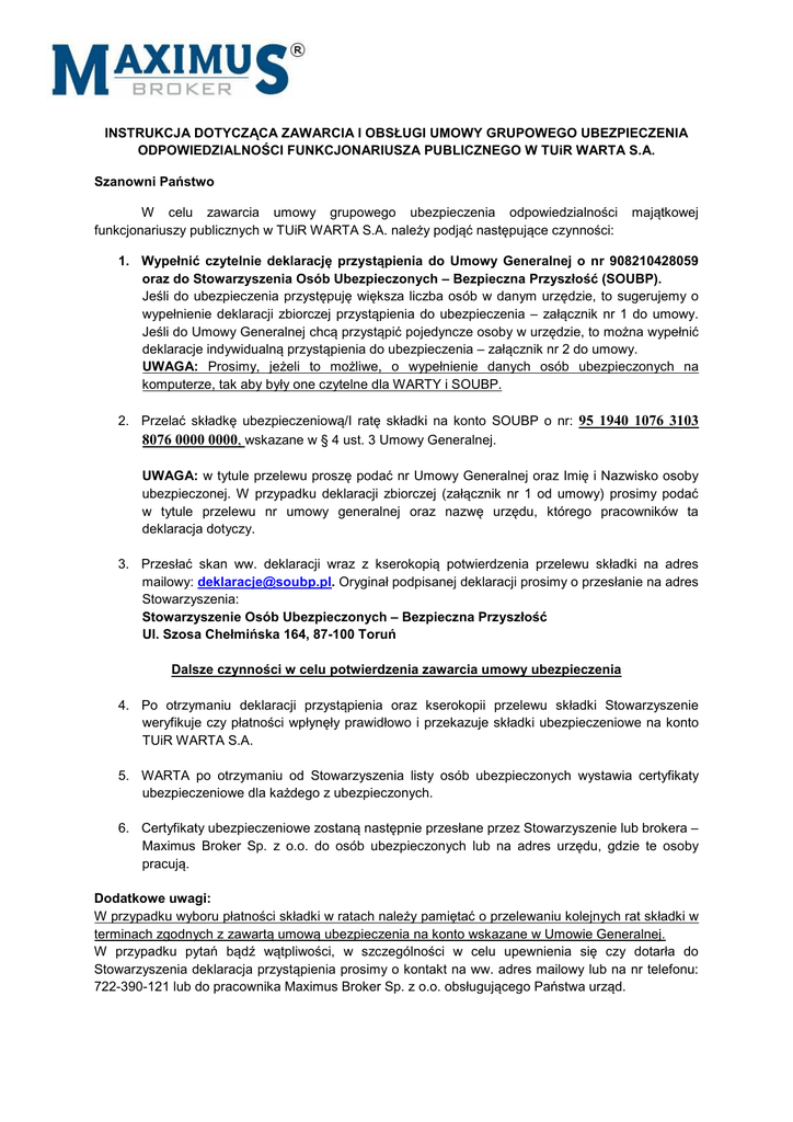 INSTRUKCJA DOTYCZĄCA ZAWARCIA I OBSŁUGI UMOWY GRUPOWEGO UBEZPIECZENIA ODPOWIEDZIALNOŚCI FUNKCJONARIUSZA PUBLICZNEGO W TUiR WARTA S.A. Szanowni Państwo W celu zawarcia umowy grupowego ubezpieczenia odpowiedzialności funkcjonariuszy publicznych w TUiR WARTA S.A. należy podjąć następujące czynności: majątkowej 1. Wypełnić czytelnie deklarację przystąpienia do Umowy Generalnej o nr 908210428059 oraz do Stowarzyszenia Osób Ubezpieczonych – Bezpieczna Przyszłość (SOUBP). Jeśli do ubezpieczenia przystępuję większa liczba osób w danym urzędzie, to sugerujemy o wypełnienie deklaracji zbiorczej przystąpienia do ubezpieczenia – załącznik nr 1 do umowy. Jeśli do Umowy Generalnej chcą przystąpić pojedyncze osoby w urzędzie, to można wypełnić deklaracje indywidualną przystąpienia do ubezpieczenia – załącznik nr 2 do umowy. UWAGA: Prosimy, jeżeli to możliwe, o wypełnienie danych osób ubezpieczonych na komputerze, tak aby były one czytelne dla WARTY i SOUBP. 2. Przelać składkę ubezpieczeniową/I ratę składki na konto SOUBP o nr: 95 1940 1076 3103 8076 0000 0000, wskazane w § 4 ust. 3 Umowy Generalnej. UWAGA: w tytule przelewu proszę podać nr Umowy Generalnej oraz Imię i Nazwisko osoby ubezpieczonej. W przypadku deklaracji zbiorczej (załącznik nr 1 od umowy) prosimy podać w tytule przelewu nr umowy generalnej oraz nazwę urzędu, którego pracowników ta deklaracja dotyczy. 3. Przesłać skan ww. deklaracji wraz z kserokopią potwierdzenia przelewu składki na adres mailowy: [email protected]. Oryginał podpisanej deklaracji prosimy o przesłanie na adres Stowarzyszenia: Stowarzyszenie Osób Ubezpieczonych – Bezpieczna Przyszłość Ul. Szosa Chełmińska 164, 87-100 Toruń Dalsze czynności w celu potwierdzenia zawarcia umowy ubezpieczenia 4. Po otrzymaniu deklaracji przystąpienia oraz kserokopii przelewu składki Stowarzyszenie weryfikuje czy płatności wpłynęły prawidłowo i przekazuje składki ubezpieczeniowe na konto TUiR WARTA S.A. 5. WARTA po otrzymaniu od Stowarzyszenia listy osób ubezpieczonych wystawia certyfikaty ubezpieczeniowe dla każdego z ubezpieczonych. 6. Certyfikaty ubezpieczeniowe zostaną następnie przesłane przez Stowarzyszenie lub brokera – Maximus Broker Sp. z o.o. do osób ubezpieczonych lub na adres urzędu, gdzie te osoby pracują. Dodatkowe uwagi: W przypadku wyboru płatności składki w ratach należy pamiętać o przelewaniu kolejnych rat składki w terminach zgodnych z zawartą umową ubezpieczenia na konto wskazane w Umowie Generalnej. W przypadku pytań bądź wątpliwości, w szczególności w celu upewnienia się czy dotarła do Stowarzyszenia deklaracja przystąpienia prosimy o kontakt na ww. adres mailowy lub na nr telefonu: 722-390-121 lub do pracownika Maximus Broker Sp. z o.o. obsługującego Państwa urząd.