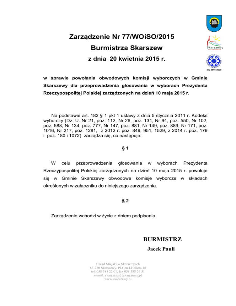Zarządzenie Nr 77/WOiSO/2015 Burmistrza Skarszew
