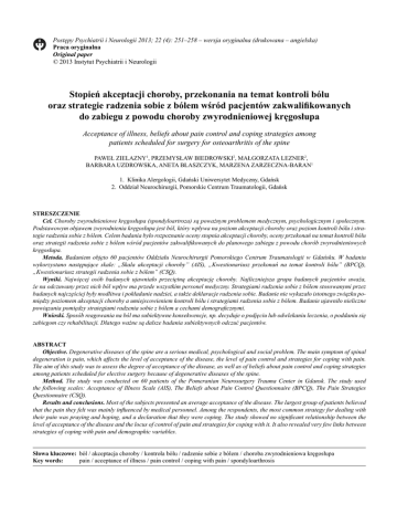 Postępy Psychiatrii i Neurologii 2013; 22 (4): 251‒258 – wersja oryginalna (drukowana – angielska) Praca oryginalna Original paper © 2013 Instytut Psychiatrii i Neurologii Stopień akceptacji choroby, przekonania na temat kontroli bólu oraz strategie radzenia sobie z bólem wśród pacjentów zakwalifikowanych do zabiegu z powodu choroby zwyrodnieniowej kręgosłupa Acceptance of illness, beliefs about pain control and coping strategies among patients scheduled for surgery for osteoarthritis of the spine PAWEŁ ZIELAZNY1, PRZEMYSŁAW BIEDROWSKI2, MAŁGORZATA LEZNER2, BARBARA UZDROWSKA, ANETA BŁASZCZYK, MARZENA ZARZECZNA-BARAN1 1. Klinika Alergologii, Gdański Uniwersytet Medyczny, Gdańsk 2. Oddział Neurochirurgii, Pomorskie Centrum Traumatologii, Gdańsk STRESZCZENIE Cel. Choroby zwyrodnieniowe kręgosłupa (spondyloartroza) są poważnym problemem medycznym, psychologicznym i społecznym. Podstawowym objawem zwyrodnienia kręgosłupa jest ból, który wpływa na poziom akceptacji choroby oraz poziom kontroli bólu i strategie radzenia sobie z bólem. Celem badania było rozpoznanie oceny stopnia akceptacji choroby, oceny przekonań na temat kontroli bólu oraz strategii radzenia sobie z bólem wśród pacjentów zakwalifikowanych do planowego zabiegu z powodu chorób zwyrodnieniowych kręgosłupa. Metoda. Badaniem objęto 60 pacjentów Oddziału Neurochirurgii Pomorskiego Centrum Traumatologii w Gdańsku. W badaniu wykorzystano następujące skale: „Skala akceptacji choroby” (AIS), „Kwestionariusz przekonań na temat kontroli bólu” (BPCQ), „Kwestionariusz strategii radzenia sobie z bólem” (CSQ). Wyniki. Najwięcej osób badanych ujawniało przeciętną akceptację choroby. Najliczniejsza grupa badanych pacjentów uważa, że na odczuwany przez nich ból wpływ ma przede wszystkim personel medyczny. Strategiami radzenia sobie z bólem stosowanymi przez badanych najczęściej były modlitwa i pokładanie nadziei, a także deklaracje radzenia sobie. Badanie nie wykazało istotnego związku pomiędzy poziomem akceptacji choroby a umiejscowieniem kontroli bólu i strategiami radzenia sobie z bólem. Badanie ujawniło nieliczne powiązania pomiędzy strategiami radzenia sobie z bólem a cechami demograficznymi. Wnioski. Sposób reagowania na ból ma subiektywne konsekwencje, np. decyduje o podjęciu lub odwlekaniu leczenia, o poddaniu się zabiegom czy rehabilitacji. Dlatego ważne są dalsze badania subiektywnych odczuć pacjentów. ABSTRACT Objective. Degenerative diseases of the spine are a serious medical, psychological and social problem. The main symptom of spinal degeneration is pain, which affects the level of acceptance of the disease, the level of pain control and strategies for coping with pain. The aim of this study was to assess the degree of acceptance of the disease, as well as of beliefs about pain control and coping strategies among patients scheduled for elective surgery because of degenerative diseases of the spine. Method. The study was conducted on 60 patients of the Pomeranian Neurosurgery Trauma Center in Gdansk. The study used the following scales: Acceptance of Illness Scale (AIS), The Beliefs about Pain Control Questionnaire (BPCQ), The Pain Strategies Questionnaire (CSQ). Results and conclusions. Most of the subjects presented an average acceptance of the disease. The largest group of patients believed that the pain they felt was mainly influenced by medical personnel. Among the respondents, the most common strategy for dealing with their pain was praying and hoping, and a declaration that they were coping. The study showed no significant relationship between the level of acceptance of the disease and the locus of control of pain and strategies for coping with it. It also revealed very few links between strategies of coping with pain and demographic variables. Słowa kluczowe: ból / akceptacja choroby / kontrola bólu / radzenie sobie z bólem / choroba zwyrodnieniowa kręgosłupa Key words: pain / acceptance of illness / pain control / coping with pain / spondyloarthrosis 252 Paweł Zielazny, Przemysław Biedrowski, Małgorzata Lezner, Barbara Uzdrowska, Aneta Błaszczyk, Marzena Zarzeczna-Baran Bóle kręgosłupa są jedną z najczęstszych przyczyn zgłoszeń do lekarza pierwszego kontaktu. Ocenia się, że około 70% osób po 30 roku życia przynajmniej raz doświadczyło dolegliwości bólowych kręgosłupa. Spondyloza jest chorobą kompleksową obejmującą całą jednostkę ruchową kręgosłupa (discovertebral unit, disco-somatic unit), na którą składają się: krążki międzykręgowe, trzony kręgowe, stawy międzykręgowe, więzadła żółte, więzadła podłużne. Zmiany zwyrodnieniowe rozpoczynają się zwykle od krążka międzykręgowego, następnie zajmują blaszki graniczne i przylegające części trzonów kręgowych, po czym stopniowo obejmują pozostałe struktury segmentu ruchowego. Typowe zmiany zwyrodnieniowe w stawach to: pogrubienie kształtu stawów, tarcie lub trzaski w stawie przy ruchu, ograniczenie zakresu ruchu w stawie, ból przy obciążaniu stawów, brak zesztywnienia stawów, zanik mięśni. Zmiany w odcinku lędźwiowym występują najczęściej na poziomie L4-L5 i L5-S1. Choroba zwyrodnieniowa kręgosłupa jest poważnym problemem medycznym, psychologicznym i społecznym, dlatego też w polskim Narodowym Programie Zdrowia na lata 2007–2015 jednym ze strategicznych celów (cel nr 5) jest „zmniejszenie przedwczesnej zachorowalności i ograniczanie negatywnych skutków przewlekłych schorzeń układu kostno-stawowego”, w tym również chorób zwyrodnieniowych kręgosłupa. Chory somatycznie doświadcza wielu negatywnych emocji, trudności i ograniczeń spowodowanych chorobą. Choroba wpływa na dotychczasowy styl życia, zagraża podstawowym wartościom i życiu człowieka, pełnieniu ról społecznych a także posiadanej koncepcji świata i własnej tożsamości. Zakłóca równowagę między za