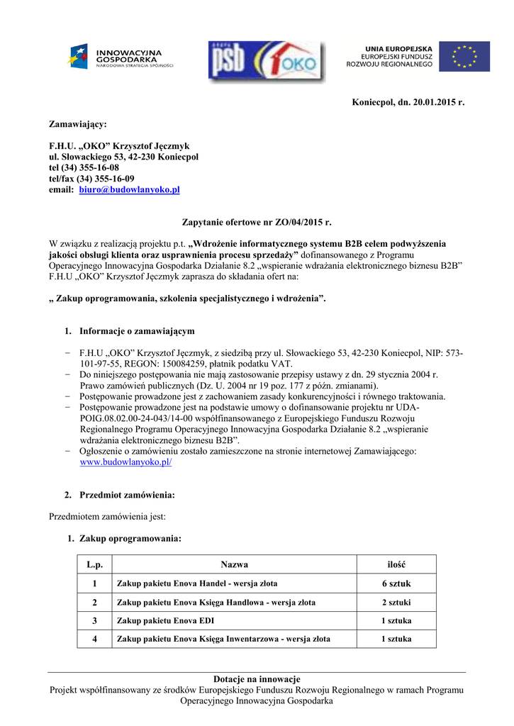 Koniecpol, dn. 20.01.2015 r. Zamawiający: F.H.U. „OKO” Krzysztof Jęczmyk ul. Słowackiego 53, 42-230 Koniecpol tel (34) 355-16-08 tel/fax (34) 355-16-09 email: [email protected] Zapytanie ofertowe nr ZO/04/2015 r. W związku z realizacją projektu p.t. „Wdrożenie informatycznego systemu B2B celem podwyższenia jakości obsługi klienta oraz usprawnienia procesu sprzedaży” dofinansowanego z Programu Operacyjnego Innowacyjna Gospodarka Działanie 8.2 „wspieranie wdrażania elektronicznego biznesu B2B” F.H.U „OKO” Krzysztof Jęczmyk zaprasza do składania ofert na: „ Zakup oprogramowania, szkolenia specjalistycznego i wdrożenia”. 1. Informacje o zamawiającym − F.H.U „OKO” Krzysztof Jęczmyk, z siedzibą przy ul. Słowackiego 53, 42-230 Koniecpol, NIP: 573101-97-55, REGON: 150084259, płatnik podatku VAT. − Do niniejszego postępowania nie mają zastosowanie przepisy ustawy z dn. 29 stycznia 2004 r. Prawo zamówień publicznych (Dz. U. 2004 nr 19 poz. 177 z późn. zmianami). − Postępowanie prowadzone jest z zachowaniem zasady konkurencyjności i równego traktowania. − Postępowanie prowadzone jest na podstawie umowy o dofinansowanie projektu nr UDAPOIG.08.02.00-24-043/14-00 współfinansowanego z Europejskiego Funduszu Rozwoju Regionalnego Programu Operacyjnego Innowacyjna Gospodarka Działanie 8.2 „wspieranie wdrażania elektronicznego biznesu B2B”. − Ogłoszenie o zamówieniu zostało zamieszczone na stronie internetowej Zamawiającego: www.budowlanyoko.pl/ 2. Przedmiot zamówienia: Przedmiotem zamówienia jest: 1. Zakup oprogramowania: L.p. Nazwa ilość 1 Zakup pakietu Enova Handel - wersja złota 6 sztuk 2 Zakup pakietu Enova Księga Handlowa - wersja złota 2 sztuki 3 Zakup pakietu Enova EDI 1 sztuka 4 Zakup pakietu Enova Księga Inwentarzowa - wersja złota 1 sztuka Dotacje na innowacje Projekt współfinansowany ze środków Europejskiego Funduszu Rozwoju Regionalnego w ramach Programu Operacyjnego Innowacyjna Gospodarka 5 Zakup pakietu Enova Analizy Wielowymiarowe - wersja złota 1 sztuka 6 Zakup aplikacji: Inwentaryzacja na kolektor 1 sztuka 7 Zakup pakietu Enova CRM - wersja złota 2 sztuki 8 Zakup pakietu Enova Komunikacja z drukarkami kodów kreskowych ZEBRA 1 sztuka 9 Zakup pakietu Enova 365 Handel 4 sztuki 10 Zakup pakietu Enova 365 netZamówienia 1-50 użytkowników 1 sztuka 11 Zakup pakietu Enova 365 netCRM 1-50 użytkowników 1 sztuka 12 Wykonanie platformy webowej z e-sklep wraz z integracją Platformy z systemem ENOVA 1 komplet Wymagany termin realizacji: Od dnia podpisania umowy do dnia 20.02.2015 r. II. Szkolenie specjalistyczne: L.p. 1 Nazwa Szkolenie specjalistyczne (szkolenie wdrożeniowe). ilość 50 godzin szkoleniowych Wymagany termin realizacji: Od dnia 01.03.2015 do dnia 30.04.2015 r. III. Wdrożenie: L.p. Nazwa ilość 1 Wdrożenie modułu Enova - wdrożenie enova365 netZamówienia. 18 rbh 2 Wdrożenie Enova modułu księgowość. 48 rbh 3 Wdrożenie Enova - systemu obsługi procesów magazynowych. 48 rbh 4 Enova - migracja danych do modułów systemu. 48 rbh 5 Enova wdrożenie modułu Handel. 36 rbh 6 Enova wdrożenie modułu CRM. 24 rbh 7 Enova wdrożenie modułu enova365 netCRM. 18 rbh 8 Wdrożenie Enova - instalacja i konfiguracja oprogramowania serwerowego i bazodanowego. 9 Enova wdrożenie modułu Analizy wielowymiarowe. 42 rbh 10 wykonanie i wdrożenie platformy webowej z esklep wraz z integracją Platformy z systemem ENOVA. 90 rbh 11 Optymalizacja systemu B2B. 36 rbh 12 Enova wdrożenie modułu EDI. 42 rbh 1 komplet Dotacje na innowacje Projekt współfinansowany ze środków Europejskiego Funduszu Rozwoju Regionalnego w ramach Programu Operacyjnego Innowacyjna Gospodarka 13 Enova wdrożenie modułu Księga inwentarzowa. Enova wdrożenie modułu ewidencja środków pieniężnych. RAZEM (rhb) RBH - roboczogodzina 14 18 rbh 12 rbh 480 Wymagany termin realizacji: od dnia podpisania umowy do dnia 31.10.2015 r. 2. Kryteria oceny oferty: Oferta wybrana zostanie wg następujących kryteriów: − cena netto za realizację usług i dostawę 50% − doświadczenie Oferenta: 50% (rozumiane jako doświadczenie kluczowych ekspertów w branży wdrożeń informatycznych, liczba zrealizowanych projektów wdrożeniowych). W przypadku złożenia więcej niż jednej oferty na tę samą wartość oceny zostanie wybrana oferta złożona jako pierwsza. Zamawiający może unieważnić postępowanie ofertowe lub nie wybrać oferty bez podania przyczyny. 3. Miejsce i termin składania ofert: Oferty należy składać w siedzibie Zamawiającego w terminie do 5 dni roboczych licząc od dnia 21.01.2015 r. pocztą, osobiście lub za pomocą poczty elektronicznej. Za datę złożenia oferty uznana zostanie data wpływu oferty do Zamawiającego. 4. Osoba uprawniona do kontaktu w sprawie zapytania ofertowego: Krzysztof Jęczmyk – Właściciel, tel (34) 355-16-08, tel/fax (34) 355-16-09 email: [email protected] Załączniki: Wzór formularza oferty załącznik nr 1. Dotacje na innowacje Projekt współfinansowany ze środków Europejskiego Funduszu Rozwoju Regionalnego w ramach Programu Operacyjnego Innowacyjna Gospodarka Załącznik nr 1 do zapytania ofertowego nr Nr ZO/03/2014 Formularz oferty (wzór) Wykonawca/nazwa firmy: ………………………………………………. Adres firmy: ………………………………………………………………. Numer telefonu: ……………………………. Numer Fax: …………………………………. e-mail: ……………………………………….. OFERTA Odpowiadając na zapytanie ofertowe dotyczące wykonania usług doradczych dla Zamawiającego F.H.U „OKO” Krzysztof Jęczmyk w zakresie zakupu oprogramowania związanego z projektem p.t.. „Wdrożenie informatycznego systemu B2B celem podwyższenia jakości obsługi klienta oraz usprawnienia procesu sprzedaży” dofinansowanego z Programu Operacyjnego Innowacyjna Gospodarka Działanie 8.2 „Wspieranie wdra
