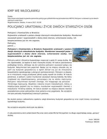 KMP WE WŁOCŁAWKU Źródło: http://www.wloclawek.kujawsko-pomorska.policja.gov.pl/kb4/informacje/wiadomosci/48741,Policjanci-uratowali-zycie-dwochstarszych-osob.html Wygenerowano: Sobota, 4 marca 2017, 02:09 POLICJANCI URATOWALI ŻYCIE DWÓCH STARSZYCH OSÓB Policjanci z Komisariatu w Brześciu Kujawskim uratowali z pożaru dwoje starszych mieszkańców budynku. Mundurowi zauważyli pożar i wyprowadzili z domu dwie starsze, schorowane osoby. Ich bezpieczeństwu już nic nie zagraża. Policyjny patrol ... Policjanci z Komisariatu w Brześciu Kujawskim uratowali z pożaru dwoje starszych mieszkańców budynku. Mundurowi zauważyli pożar i wyprowadzili z domu dwie starsze, schorowane osoby. Ich bezpieczeństwu już nic nie zagraża. Policyjny patrol z Brześcia Kujawskiego rozpoczął o godz.21 swoją służbę. Nic nie zapowiadało, że będzie to dość niezwykła służba. W trakcie patrolowania podległego terenu, zbliżając się do Lubrańca policjanci zauważyli palący się budynek. Natychmiast tam pojechali. Będąc już na miejscu okazało się, że palił się budynek gospodarczy a ogień zbliżał się już do mieszkania bezpośrednio sąsiadującego z płonącym pomieszczeniem. Policjanci w obawie, że w mieszkaniu mogą przebywać jakieś osoby wpadli do środka. W trakcie penetracji, w jednym z pokoi mundurowi zauważyli starszą kobietę. Na łóżku znajdował się niepełnosprawny, poruszający się na wózku mężczyzna. Policjanci natychmiast wynieśli chorego, nie mogącego się poruszać 78-letniego mężczyznę. Wspólnie z dwoma innymi mieszkańcami, którzy w międzyczasie pojawili się na miejscu mundurowi wyprowadzili również z mieszkania 74-letnią kobietę. W trakcie działań na miejsce dotarła również powiadomiona przez policjantów straż pożarna oraz pogotowie. Na szczęście nie było potrzeby hospitalizacji starszych państwa. Na skutek pożaru całkowitemu spaleniu uległ drewniany budynek gospodarczy oraz część ściany szczytowej sąsiedniego budynku. Na szczęście wszystko skończyło się dobrze. Z całą pewnością sierż.sztab.Dawid Roj oraz sierż.sztab.Michał Skrzypiński na długo zapamiętają swoją „gorącą” służbę. Autor: 566164 Publikacja: 566164 Ocena: 0/5 (0) Tweetnij
