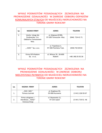 WYKAZ PODMIOTÓW POSIADAJĄCYCH ZEZWOLENIA NA PROWADZENIE DZIAŁALNOŚCI W ZAKRESIE ODBIORU ODPADÓW KOMUNALNYCH STAŁYCH OD WŁAŚCICIELI NIERUCHOMOŚCI NA TERENIE GMINY ROKICINY Lp. NAZWA FIRMY ADRES TELEFON 1. Veolia Usługi dla Środowiska S.A. Oddział w Tomaszowie Maz. ul. Majowa 87/89, 97-200 Tomaszów Maz. (044) 724 41 71 ,, JUKO ‘’ Sp. z.o.o. ul. Topolowa 1, 97-300 Piotrków Tryb. (044) 732 69 63 Firma SITA Radom Sp. z o.o, ul. Witosa 76 , 26-600 Radom +48 ( 48) 35 92 26 2. 3. WYKAZ PODMIOTÓW POSIADAJĄCYCH ZEZWOLENIA NA PROWADZENIE DZIAŁALNOŚCI W ZAKRESIE ODBIORU NIECZYSTOSCI PŁYNNYCH OD WŁAŚCICIELI NIERUCHOMOŚCI NA TERENIE GMINY ROKICINY Lp. NAZWA FIRMY ADRES TELEFON 1. ,, EKO- WIR ’’ Tomasz Łażniak ul. Rządowa 59, 95-006 Kurowice ( 0 42 ) 226 93 67 Firma usługowo – Handlowa ,, ISASZ’’ Ireneusz Knap ul. Reymonta 11, 97-225 Ujazd ( 0 44 ) 719 51 46 2. JUKO SP. Z O.O. uprzejmie informuje, że w 2012 roku odbiór odpadów komunalnych z Paostwa Posesji odbywał się będzie w następujących terminach: ODBIÓR ODPADÓW KOMUNALNYCH CISÓW, KOLONIA ŁAZNÓW, ŁAZNÓW, ŁAZNOWSKA WOLA, MICHAŁÓW, MIKOŁAJÓW, NOWE CHRUSTY, POGORZAŁE ŁUGI, ROKICINY KOLONIA, STARE CHRUSTY, STEFANÓW czwartek co cztery tygodnie 19 Styczeń 16 Luty 15 Marzec 12 Kwiecień 10 Maj 07 Czerwiec 05 Lipiec 02 Sierpień 30 Sierpień 27 Wrzesień 25 Październik 22 Listopad 20 Grudzień Uwaga: Przypomina się mieszkaocom o wystawieniu pojemników przed furtką lub bramą posesji od godz. 6.00! JUKO SP. Z O.O. uprzejmie informuje, że w 2012 roku odbiór odpadów komunalnych - selektywnych z Paostwa Posesji odbywał się będzie w następujących terminach: ODBIÓR ODPADÓW SELEKTYWNYCH GMINA ROKICINY czwartek co cztery tygodnie 05 Styczeń 02 Luty 01 Marzec 29 Marzec 26 Kwiecień 24 Maj 21 Czerwiec 19 Lipiec 16 Sierpień 13 Wrzesień 11 Październik 08 Listopad 06 Grudzień PUNKTY SELEKTYWNEGO ZBIERANIA ODPADÓW NA TERENIE GMINY ROKICINY 1. Łaznów - koło szkoły podstawowej komplet złożony z: pojemnika 2,5 m3 „siatkowca" na butelkę PET (HDS) pojemnika 1,5 m3 na szkło kolorowe 2. Rokiciny - koło remizy OSP komplet złożony z: pojemnika 2,5 m3 „siatkowca" na butelkę PET (HDS) pojemnika 1,5 m3 na szkło kolorowe 3. Rokiciny Kolonia - koło stacji kolejowej komplet złożony z: 2 pojemników 2,5 m3 „siatkowca" na butelkę PET (HDS) pojemnika 1,5 m3 na szkło kolorowe 4. Rokiciny Kolonia - koło sklepu „MIAZEK" komplet złożony z: pojemnika 2,5 m3 „siatkowca" na butelkę PET (HDS) pojemnika 1,5 m3 na szkło kolorowe 5. Nowe Chrusty - koło sklepu przy stacji kolejowej komplet złożony z: 2 pojemników 2,5 m3 „siatkowca" na butelkę PET (HDS) pojemnika 1,5 m3na szkło kolorowe 6. Janków - koło remizy OSP złożony z: pojemnika 2,5 m3 „siatkowca" na butelkę PET (HDS) pojemnika 1,5 m3 na szkło kolorowe 7. Łaznowska Wola - koło sklepu na skrzyżowaniu drogi wojewódzkiej NR 713 z ul. Północną komplet złożony z: pojemnika 2,5 m3 „siatkowca" na butelkę PET (HDS) pojemnika 1,5 m3 na szkło kolorowe 8. Popielawy - koło gimnazjum komplet złożony z: pojemnika 2,5 m3 „siatkowca" na butelkę PET (HDS) pojemnika 1,5 m3 na szkło kolorowe 9. Stare Chrusty - koło remizy OSP złożony z : pojemnika 2,5 m3 „siatkowca" na butelkę PET (HDS) pojemnika 1,5 m3 na szkło kolorowe 10. Maksymilianów - koło sołtysa złożony z : pojemnika 2,5 m3 „siatkowca" na butelkę PET (HDS) pojemnika 1,5 m3 na szkło kolorowe 11. Wilkucice Duże - koło remizy OSP złożone z : pojemnika 2,5 m3 „siatkowca" na butelkę PET (HDS) pojemnika 1,5 m3 na szkło kolorowe 12. Michałów- koło stacji PKP złożony z: pojemnika 2,5 m3 „siatkowca" na butelkę PET (HDS) pojemnika 1,5 m3na szkło kolorowe 13. Eminów- koło sołtysa złożony z : pojemnika 2,5 m3 „siatkowca" na butelkę PET (HDS) pojemnika 1,5 m3 na szkło kolorowe W sumie w Gminie Rokiciny ustawiono 28 pojemników służących do selektywnej zbiórki odpadów, w tym: 15 pojemników 2,5 m3 „siatkowców" na butelkę PET (HDS) 13 pojemników 1,5 m3 na szkło kolorowe Odbiorem odpadów z punktów selektywnej zbiórki zajmuje się Firma ,, JUKO’’ Sp. z.o.o, ul. Topolowa 1, 97- 300 Piotrków Tryb., tel. (0 44) 732 69 63 PUNKTY ZBIÓRKI ZUŻYTYCH BATERII 1. Siedziba Urzędu Gminy, wejście C pojemnik na baterie o pojemności 25 kg 2. Szkoła Podstawowa w Rokicinach pojemnik na baterie o pojemności 25 kg 3. Szkoła Podstawowa w Łaznowie pojemnik na baterie o pojemności 25 kg