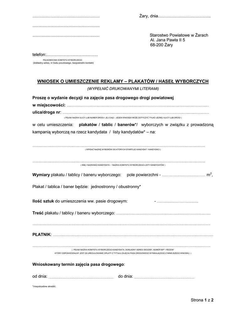 ………………………………………… śary, dnia……………………………….. ………………………………………… ………………………………………… Starostwo Powiatowe w śarach Al. Jana Pawła II 5 68-200 śary telefon:.……………………………… PEŁNOMOCNIK KOMITETU WYBORCZEGO (dokładny adres, nr kodu pocztowego, bezpośredni kontakt) WNIOSEK O UMIESZCZENIE REKLAMY – PLAKATÓW / HASEŁ WYBORCZYCH (WYPEŁNIĆ DRUKOWANYMI LITERAMI) Proszę o wydanie decyzji na zajęcie pasa drogowego drogi powiatowej w miejscowości: ……………………………………………………………………………………………………….……………….… ulica/droga nr: ……………………………………………………………………………………………………………………………… ( PEŁNA NAZWA ULICY LUB NUMER DROGI I JEJ CIĄG – JEDEN WNIOSEK MOśE DOTYCZYĆ TYLKO JEDNEJ ULICY LUB DROGI ) w celu umieszczenia: plakatów / tablic / banerów*/ wyborczych w związku z prowadzoną kampanią wyborczą na rzecz kandydata / listy kandydatów* – na: …………………………………………………………………………………………………………………………………………………….. ( WPISAĆ NAZWĘ WYBORÓW DO KTÓRYCH STARTUJE KANDYDAT / KANDYDACI ) …………………………………………………………………………………………………………………………………………………….. ( IMIĘ I NAZWISKO KANDYDATA / NAZWA KOMITETU WYBORCZEGO LISTY KANDYDATÓW ) Wymiary plakatu / tablicy / baneru wyborczego: pole powierzchni - ……………………….…………… m2, Plakat / tablica / baner będzie: jednostronny / obustronny* Ilość sztuk do umieszczenia ww. pasie drogowym: - ………………………………….. Treść plakatu / tablicy / baneru wyborczego: ………………………………………………………………………………… …………………………………………………………………………………………………………………………………………………………. PŁATNIK: ……………………………………………………..…………………………………………………………………………………… …………………………………………………………………………………………………………………………………………………………. ( PEŁNA NAZWA KOMITETU WYBORCZEGO KANDYDATA, DOKŁADNY ADRES SIEDZIBY, NUMER NIP* / REGON* KTÓRY ODPOWIEDZIALNY JEST ZA UREGULOWANIE OPŁATY Z TYTUŁU ZAJĘCIA PASA DROGOWEGO WYNIKAJĄCEGO Z NINIEJSZEGO WNIOSKU ) Wnioskowany termin zajęcia pasa drogowego: od dnia: do dnia: */niepotrzebne skreślić. Strona 1 z 2 Jednocześnie oświadczam, Ŝe: 1. Zapoznałem się z treścią art. 40 ust. 12 ustawy z dnia 21 marca 1985 roku o drogach publicznych (Dz. U. z 2007r. Nr 19, poz. 115 ze zm.), tj. za zajęcia pasa drogowego: bez zezwolenia zarządcy drogi; z przekroczeniem terminu zajęcia określonego w zezwoleniu zarządcy drogi; o powierzchni większej niŜ określona w zezwoleniu zarządcy drogi – zarządca drogi wymierzy, w drodze decyzji administracyjnej, karę pienięŜną w wysokości 10-krotnej opłaty ustalonej w zezwoleniu, a osobą / podmiotem, zobowiązanym do uregulowania opłaty wynikającej z nałoŜonej kary będzie „Płatnik” wskazany we wniosku. 2. W przypadku podania we wniosku błędnych danych co do powierzchni, ilości czy miejsca umieszczania plakatów / tablic / banerów wyborczych, ponoszę pełną odpowiedzialność materialną za konsekwencje wynikłe z takiego oświadczenia. 3. Plakaty / tablice / banery wyborcze, o których mowa we wniosku, zostaną umieszczone w pasie drogowym, dopiero po uzyskaniu zezwolenia zarządcy drogi na zajęcie pasa drogowego. 4. Plakaty / tablice / banery wyborcze, o których mowa we wniosku, zostaną umieszczone w pasie drogowym, w sposób niestwarzający zagroŜenia bezpieczeństwa ruchu drogowego, w tym nie będą imitować znaków drogowych i urządzeń bezpieczeństwa ruchu drogowego oraz nie będą umieszczane na konstrukcjach wsporczych znaków drogowych i urządzeń BRD. 5. Zajmujący pas drogowy jest obowiązany dbać o naleŜyty stan umieszczonych plakatów / tablic / banerów wyborczych i przywrócić pas drogowy do poprzedniego stanu uŜyteczności w terminie określonym w zezwoleniu zarządcy drogi. 6. Przyjmuję do wiadomości, Ŝe w przypadku nie usunięcia plakatów / tablic / banerów wyborczych oraz urządzeń ogłoszeniowych w terminach określonych w pkt. 5, Starosta śarski zleci ich usunięcie na koszt obowiązanych do ich usunięcia lub dokona zgłoszenia na Policję. Pouczenie: 1. ZłoŜony do rozpatrzenia wniosek o umieszczenie reklamy – plakatów / haseł wyborczych, z pustymi miejscami do wypełnienia lub podaniem nie pełnych – wymaganych wnioskiem – danych, informacji, spowoduje Ŝe wniosek będzie pozostawiony bez rozpatrzenia, do czasu uzupełnienia braków. 2. W przypadku składania ww. wniosku przez Pełnomocnika, do wniosku naleŜy dołączyć: pełnomocnictwo lub jego kopię potwierdzoną za zgodność z oryginałem oraz dowód wniesienia opłaty skarbowej za pełnomocnictwo w wysokości 17 zł. ( CZYTELNY PODPIS SKŁADAJĄCEGO WNIOSEK ) Strona 2 z 2