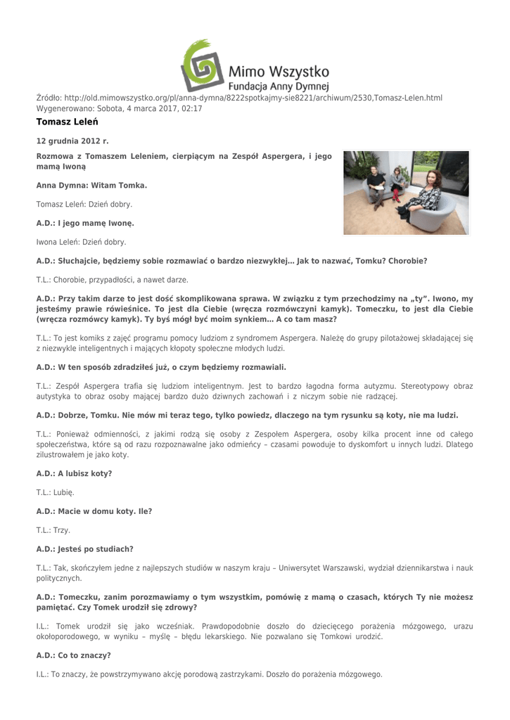 Źródło: http://old.mimowszystko.org/pl/anna-dymna/8222spotkajmy-sie8221/archiwum/2530,Tomasz-Lelen.html Wygenerowano: Sobota, 4 marca 2017, 02:17 Tomasz Leleń 12 grudnia 2012 r. Rozmowa z Tomaszem Leleniem, cierpiącym na Zespół Aspergera, i jego mamą Iwoną Anna Dymna: Witam Tomka. Tomasz Leleń: Dzień dobry. A.D.: I jego mamę Iwonę. Iwona Leleń: Dzień dobry. A.D.: Słuchajcie, będziemy sobie rozmawiać o bardzo niezwykłej… Jak to nazwać, Tomku? Chorobie? T.L.: Chorobie, przypadłości, a nawet darze. A.D.: Przy takim darze to jest dość skomplikowana sprawa. W związku z tym przechodzimy na „ty”. Iwono, my jesteśmy prawie rówieśnice. To jest dla Ciebie (wręcza rozmówczyni kamyk). Tomeczku, to jest dla Ciebie (wręcza rozmówcy kamyk). Ty byś mógł być moim synkiem… A co tam masz? T.L.: To jest komiks z zajęć programu pomocy ludziom z syndromem Aspergera. Należę do grupy pilotażowej składającej się z niezwykle inteligentnych i mających kłopoty społeczne młodych ludzi. A.D.: W ten sposób zdradziłeś już, o czym będziemy rozmawiali. T.L.: Zespół Aspergera trafia się ludziom inteligentnym. Jest to bardzo łagodna forma autyzmu. Stereotypowy obraz autystyka to obraz osoby mającej bardzo dużo dziwnych zachowań i z niczym sobie nie radzącej. A.D.: Dobrze, Tomku. Nie mów mi teraz tego, tylko powiedz, dlaczego na tym rysunku są koty, nie ma ludzi. T.L.: Ponieważ odmienności, z jakimi rodzą się osoby z Zespołem Aspergera, osoby kilka procent inne od całego społeczeństwa, które są od razu rozpoznawalne jako odmieńcy – czasami powoduje to dyskomfort u innych ludzi. Dlatego zilustrowałem je jako koty. A.D.: A lubisz koty? T.L.: Lubię. A.D.: Macie w domu koty. Ile? T.L.: Trzy. A.D.: Jesteś po studiach? T.L.: Tak, skończyłem jedne z najlepszych studiów w naszym kraju – Uniwersytet Warszawski, wydział dziennikarstwa i nauk politycznych. A.D.: Tomeczku, zanim porozmawiamy o tym wszystkim, pomówię z mamą o czasach, których Ty nie możesz pamiętać. Czy Tomek urodził się zdrowy? I.L.: Tomek urodził się jako wcześniak. Prawdopodobnie doszło do dziecięcego porażenia mózgowego, urazu okołoporodowego, w wyniku – myślę – błędu lekarskiego. Nie pozwalano się Tomkowi urodzić. A.D.: Co to znaczy? I.L.: To znaczy, że powstrzymywano akcję porodową zastrzykami. Doszło do porażenia mózgowego. A.D.: Od razu o tym wiedziałaś, kiedy wypisali Cię ze szpitala? I.L.: Nie, broń Boże. Tomek bardzo szybko przybierał na wadze. Przez dwa lata o niczym nie wiedziałam. Aż zaczęło mnie martwić, że nie chodzi i nie mówi. A.D.: Wtedy pojechałaś do lekarza. I.L.: Do specjalistów. A.D.: I jak się Tomek rozwijał, kiedy był już zdiagnozowany? Mijały lata, odbywała się rehabilitacja… I.L.: Przez to, że miał niedowład spastyczny nóg, trafił do Konstancina na operację wydłużenia ścięgien Achillesa – bo chodził na palcach, przewracał się ciągle. Po długim okresie chodzenia w gipsie aż do ud, okazało się, że ten chód nie jest tak idealny, jak sobie myśleliśmy wszyscy: że Tomek będzie zasuwał. Chodził na przygiętych nogach. To jest widoczne do dzisiaj, tego nie udało się zmienić. Pierwsza diagnoza była: mózgowe porażenie dziecięce. I nic więcej. A.D.: A jak rozwijał się intelektualnie? Zaczął mówić? I.L.: Przez to, że nieustająco z nim rozmawiałam, i cała rodzina, stwierdzono u niego echolalię. Echolalia to jest powtarzanie, jakby bezwiedne, pewnych słów. Specjalnie się tym nie przejmowałam. W końcu my też powtarzamy słowa, na przykład wtedy, gdy nad czymś się zastanawiamy albo o czymś rozmyślamy. Ale były inne rzeczy niepokojące: na przykład lubił bawić się sam, miał swój własny świat, z dziećmi to różnie bywało. Przede wszystkim – autoagresja. A.D.: A co mówili Ci lekarze? Że skąd się to bierze? I.L.: Nie mówili. Natomiast mówili, co mam robić: wziąć gazetę, zrobić dziurkę w środku i nie reagować, kiedy Tomek, na przykład, walił głową w ścianę. T.L.: Zmiana sytuacji wywoływała we mnie wielki szok. Gdy, zamiast ulubionej nauczycielki, zjawiała się pani dyrektor, uderzałem w ławkę i mówiłem: „Pani nie może uczyć!”. To jest sztywność myślenia i zachowań – jeden z filarów Zespołu Aspergera. A.D.: A jak czułeś się w szkole? Bo nagle zostałeś otoczony rówieśnikami. Miałeś wcześniej kontakt z dziećmi? T.L.: Najlepsze były pierwsze dwa lata. W następnych czterech – z powodu niezrozumienia, wielu sytuacji w szkole – zachowywałem się agresywnie i niepokojąco. A.D.: A co Cię drażniło? T.L.: Nie wiadomo, co. Na tym polega Zespół Aspergera, że coś na świecie, pewne wydarzenia wywołują negatywne emocje czy też emocje radosne w nieodpowiedniej chwili. A.D.: Dziwnie się zachowywałeś. A jak na to reagowali Twoi koledzy: spokojnie czy też byli agresywni? T.L.: Byli agresywni. Zaczęli się szybciej rozwijać w końcu podstawówki.... Zdarzały mi się różne nieciekawe sytuacje. Było bardzo dużo znęcania się… I, na przykład, kolega, który mnie pchnął na parapet „załatwił” mi tydzień, dwa tygodnie spokoju od szkoły. Bo już miałem fobię szkolną. I.L.: No i miałeś pęknięte żebra. T.L.: Dzięki temu miałem dwa tygodnie odpoczynku od szkoły. A.D.: A dobrze się uczyłeś, lubiłeś się uczyć? T.L.: Miałem same piątki, czwórki. Tróje – z matematyki. A.D.: Czyli nie masz umysłu ścisłego? T.L.: Nie mam. Z matematyką niezbyt sobie radziłem. A.D.: Iwono, a jak szkoła reagowała na jego zachowania? Często byłaś wzywana przez nauczycieli? I.L.: Tak, tak, usiłowano „wcisnąć” Tomkowi nauczycielka do domu, odbywa się bardzo współplemieńców, że tak się wyrażę. Udałam Psychologiczna, prowadziła ją doktor Korczak, indywidualne nauczanie. Co to oznaczało? Że przychodzi bardzo miła pani przyjemna lekcja. I sobie idzie. A Tome