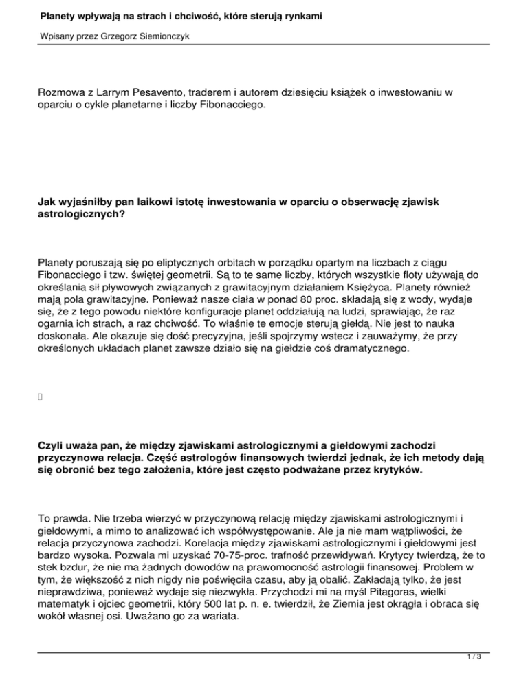 Planety wpływają na strach i chciwość, które sterują rynkami Wpisany przez Grzegorz Siemionczyk Rozmowa z Larrym Pesavento, traderem i autorem dziesięciu książek o inwestowaniu w oparciu o cykle planetarne i liczby Fibonacciego. Jak wyjaśniłby pan laikowi istotę inwestowania w oparciu o obserwację zjawisk astrologicznych? Planety poruszają się po eliptycznych orbitach w porządku opartym na liczbach z ciągu Fibonacciego i tzw. świętej geometrii. Są to te same liczby, których wszystkie floty używają do określania sił pływowych związanych z grawitacyjnym działaniem Księżyca. Planety również mają pola grawitacyjne. Ponieważ nasze ciała w ponad 80 proc. składają się z wody, wydaje się, że z tego powodu niektóre konfiguracje planet oddziałują na ludzi, sprawiając, że raz ogarnia ich strach, a raz chciwość. To właśnie te emocje sterują giełdą. Nie jest to nauka doskonała. Ale okazuje się dość precyzyjna, jeśli spojrzymy wstecz i zauważymy, że przy określonych układach planet zawsze działo się na giełdzie coś dramatycznego. Czyli uważa pan, że między zjawiskami astrologicznymi a giełdowymi zachodzi przyczynowa relacja. Część astrologów finansowych twierdzi jednak, że ich metody dają się obronić bez tego założenia, które jest często podważane przez krytyków. To prawda. Nie trzeba wierzyć w przyczynową relację między zjawiskami astrologicznymi i giełdowymi, a mimo to analizować ich współwystępowanie. Ale ja nie mam wątpliwości, że relacja przyczynowa zachodzi. Korelacja między zjawiskami astrologicznymi i giełdowymi jest bardzo wysoka. Pozwala mi uzyskać 70-75-proc. trafność przewidywań. Krytycy twierdzą, że to stek bzdur, że nie ma żadnych dowodów na prawomocność astrologii finansowej. Problem w tym, że większość z nich nigdy nie poświęciła czasu, aby ją obalić. Zakładają tylko, że jest nieprawdziwa, ponieważ wydaje się niezwykła. Przychodzi mi na myśl Pitagoras, wielki matematyk i ojciec geometrii, który 500 lat p. n. e. twierdził, że Ziemia jest okrągła i obraca się wokół własnej osi. Uważano go za wariata. 1/3 Planety wpływają na strach i chciwość, które sterują rynkami Wpisany przez Grzegorz Siemionczyk Jakie są najważniejsze zależności między zjawiskami astrologicznymi a rynkami? Jednym z najważniejszych aspektów (układów planet), którym towarzyszą przełomowe zjawiska rynkowe, jest koniunkcja Słońca Merkurego (z perspektywy Ziemi odległość kątowa między tymi ciałami wynosi zero stopni). Dotąd jednak mówi pan głównie o analizie cykli planetarnych. Na tym jednak astrologia finansowa się nie kończy. Niektórzy analitycy stawiają horoskopy spółkom, krajom i indeksom... Ja nie używam takich metod. Patrzę tylko na cykle planetarne, ponieważ sprowadza się to do liczb. Stawianie horoskopów wymaga przyjęcia wyimaginowanego podziału ekliptyki na znaki zodiaku. Tacy analitycy muszą też dokonywać wielu założeń i interpretacji, podczas gdy ja analizuję wyłącznie liczby. Czy astrologia finansowa ma kiedykolwiek szanse wejść do głównego nurtu prognostyki finansowej, czy zawsze będzie jej towarzyszył silny sceptycyzm? Według mnie ten typ analizy już staje się popularny. Artykuły na ten temat pisane są na MIT i innych prestiżowych uczelniach. Poza tym podczas kryzysu tradycyjni analitycy w większości się mylili, stawiali rozbieżne prognozy itd. Ich niepowodzenia mogą sprawić, że zaufanie do astrologów finansowych wzrośnie. 2/3 Planety wpływają na strach i chciwość, które sterują rynkami Wpisany przez Grzegorz Siemionczyk Czy analiza astrologiczna jest komplementarna wobec innych typów analizy giełdowej, czy raczej wyklucza się z nimi? Ja stosuję analizę astrologiczną w połączeniu z techniczną, która również ma związek z cyklami na giełdzie. Nie zajmuję się natomiast analizą fundamentalną. 3/3
