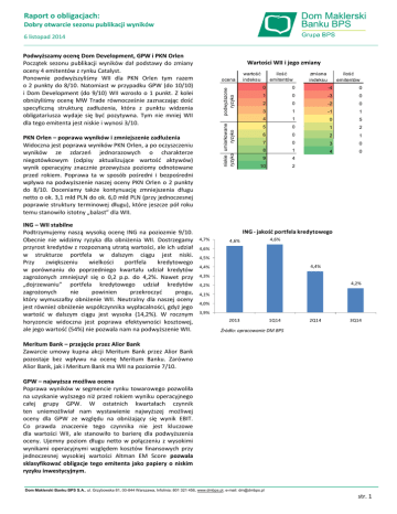 Raport o obligacjach: Dobry otwarcie sezonu publikacji wyników y, r. 6 listopad 2014 Podwyższamy ocenę Dom Development, GPW i PKN Orlen Początek sezonu publikacji wyników dał podstawy do zmiany oceny 4 emitentów z rynku Catalyst. Ponownie podwyższyliśmy WII dla PKN Orlen tym razem o 2 punkty do 8/10. Natomiast w przypadku GPW (do 10/10) i Dom Development (do 9/10) WII wzrosło o 1 punkt. Z kolei obniżyliśmy ocenę MW Trade równocześnie zaznaczając dośd specyficzną strukturę zadłużenia, która z punktu widzenia obligatariusza wydaje się byd pozytywna. Tym nie mniej WII dla tego emitenta jest niskie i wynosi 3/10. Wartości WII i jego zmiany niskie umiarkowane ryzyko ryzyko podwyższone ryzyko ocena PKN Orlen – poprawa wyników i zmniejszenie zadłużenia Widoczna jest poprawa wyników PKN Orlen, a po oczyszczeniu wyników ze zdarzeo jednorazowych o charakterze niegotówkowym (odpisy aktualizujące wartośd aktywów) wynik operacyjny znacznie przewyższa poziomy odnotowane przed rokiem. Poprawa ta w sposób pośredni i bezpośredni wpływa na podwyższenie naszej oceny PKN Orlen o 2 punkty do 8/10. Doceniamy także kontynuację zmniejszenia długu netto o ok. 3,1 mld PLN do ok. 6,0 mld PLN (przy jednoczesnej poprawie struktury terminowej długu), które jeszcze pół roku temu stanowiło istotny „balast” dla WII. ING – WII stabilne Podtrzymujemy naszą wysoką ocenę ING na poziozmie 9/10. Obecnie nie widzimy ryzyka dla obniżenia WII. Dostrzegamy przyrost kredytów z rozpoznaną utratą wartości, ale ich udział w strukturze portfela w dalszym ciągu jest niski. Przy zwiększeniu wielkości portfela kredytowego w porównaniu do poprzedniego kwartału udział kredytów zagrożonych zmniejszył się o 0,2 p.p. do 4,2%. Nawet przy „dojrzewaniu” portfela kredytowego udział kredytów zagrożonych nie powinien przekroczyd progu, który wymuszałby obniżenie WII. Neutralny dla naszej oceny jest również obniżenie współczynnika wypłacalności, gdyż jego wartośd w dalszym ciągu jest wysoka (14,2%). W rocznym horyzoncie widoczna jest poprawa efektywności kosztowej, ale jego wartośd (54%) nie pozwala nam na podwyższenie WII. wartość indeksu ilość emitentów ilość emitentów zmiana indeksu 0 0 -4 0 1 0 -3 0 2 0 -2 0 3 1 -1 1 4 1 0 5 5 0 1 2 6 0 2 1 7 0 3 0 8 1 4 0 9 4 10 2 ING - jakośd portfela kredytowego 4,7% 4,6% 4,6% 4,6% 4,5% 4,4% 4,4% 4,3% 4,2% 4,2% 4,1% 4,0% 3,9% 2013 1Q14 2Q14 3Q14 Źródło: opracowanie DM BPS Meritum Bank – przejęcie przez Alior Bank Zawarcie umowy kupna akcji Meritum Bank przez Alior Bank pozostaje bez wpływu na ocenę Meritum Banku. Zarówno Alior Bank, jak i Meritum Bank ma WII na poziomie 7/10. GPW – najwyższa możliwa ocena Poprawa wyników w segmencie rynku towarowego pozwoliła na uzyskanie wyższego niż przed rokiem wyniku operacyjnego całej grupy GPW. W ostatnich kwartałach czynnik ten uniemożliwiał nam wystawienie najwyższej możliwej oceny dla GPW ze względu na obniżający się wynik EBIT. Co prawda znaczenie tego czynnika nie jest kluczowe dla wartości WII, ale stanowiło to barierę dla podwyższenia oceny. Ujemny poziom długu netto w połączeniu z wysokimi wynikami operacyjnymi względem kosztów finansowych przy jednoczesnej wysokiej wartości Altman EM Score pozwala sklasyfikowad obligacje tego emitenta jako papiery o niskim ryzyku inwestycyjnym. Dom Maklerski Banku BPS S.A., ul. Grzybowska 81, 00-844 Warszawa, Infolinia: 801 321 456, www.dmbps.pl, e-mail: [email protected] str. 1 Raport o obligacjach: Dobry otwarcie sezonu publikacji wyników y, r. 6 listopad 2014 Robyg - zapadalnośd obligacji 100 90 80 70 60 50 40 30 20 10 0 planowane 1Q18 4Q17 3Q17 2Q17 1Q17 4Q18 3Q16 2Q16 1Q16 4Q15 3Q15 2Q15 1Q15 możliwy przedterminowy wykup 4Q14 Robyg – rośnie ryzyko przedterminowego wykupu Robyg przeprowadził emisję niezabezpieczonych obligacji serii L o łącznej wartości nominalnej 60 mln PLN. Oprocentowanie tych papierów jest oparte na stawce WIBOR 6M powiększone o marżę, która publicznie nie jest jeszcze znana. Z kolei cel emisji tych obligacji nie został określony. Mając na uwadze dotychczasową praktykę emitenta oraz wbudowane w obligacje serii E, F, G i H opcję przedterminowego wykupu, przypuszczamy że Robyg może skorzystad z przysługującego mu prawa. W przypadku obligacji serii E i F wykup tych papierów w grudniu br. nie wiązałby się z koniecznością wypłaty premii. Podobnie jest w przypadku serii G i H w styczniu 2015. Mając na uwadze wysokie marżę serii F i H (480-490 pb.; obie serie niezabezpieczone) oraz możliwośd uwolnienia zabezpieczenia z obligacji serii E i G to realizacja scenariusza zakładającego przedterminowy wykup jest dośd prawdopodobna. Łączna wartośd nominalna wszystkich 4 serii obligacji tego emitenta wynosi 65 mln PLN wobec 60 mln PLN, które Robyg pozyskał w drodze emisji obligacji serii L. Przedterminowy wykup prawdopodobnie pozwoli ograniczyd koszty obsługi długu tym bardziej, że poprzednie emisja niezabezpieczonych obligacji Robyga miała marżę 400 pb. (można spodziewad się, że teraz była jeszcze niższa), a średnioważona (wartością nominalną) marża obligacji serii E, F, G i H wynosi 424 pb. Źródło: opracowanie DM BPS ED Invest – korekta w dół prognozy ED Invest to jedna z tych spółek, która wskaźnikowo wygląda dobrze, ale za sprawą skali działalności i faktu prowadzenia projektowej działalności nie pozwala wysoko pozycjonowad obligacji tego emitenta ze względu na ryzyko opóźnienia realizacji projektu, które może spowodowad trudności z terminowym wykupieniem obligacji. Wskaźniki zadłużenia są na niskim poziomie, a poziom osiąganych zysków stara prognoza operacyjnych pozwala na swobodne pełne pokrycie kosztów ED Invest na 2014 finansowych. Jednakże niewielka skala działalności powoduje 11,6 dużą zależnośd osiąganych wyników od realizacji EBIT poszczególnych projektów, czego p