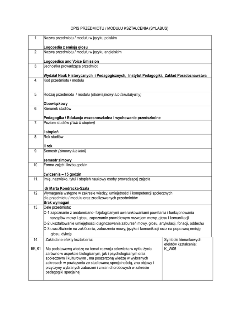 OPIS PRZEDMIOTU / MODUŁU KSZTAŁCENIA (SYLABUS) 1. Nazwa przedmiotu / modułu w języku polskim 2. Logopedia z emisją głosu Nazwa przedmiotu / modułu w języku angielskim 3. Logopedics and Voice Emission Jednostka prowadząca przedmiot 4. Wydział Nauk Historycznych i Pedagogicznych, Instytut Pedagogiki, Zakład Poradoznawstwa Kod przedmiotu / modułu 5. Rodzaj przedmiotu / modułu (obowiązkowy lub fakultatywny) 6. Obowiązkowy Kierunek studiów 7. Pedagogika / Edukacja wczesnoszkolna i wychowanie przedszkolne Poziom studiów (I lub II stopień) 8. I stopień Rok studiów 9. II rok Semestr (zimowy lub letni) 10. semestr zimowy Forma zajęć i liczba godzin 11. ćwiczenia – 15 godzin Imię, nazwisko, tytuł / stopień naukowy osoby prowadzącej zajęcia dr Marta Kondracka-Szala 12. Wymagania wstępne w zakresie wiedzy, umiejętności i kompetencji społecznych dla przedmiotu / modułu oraz zrealizowanych przedmiotów Brak wymagań 13. Cele przedmiotu: C-1 zapoznanie z anatomiczno- fizjologicznymi uwarunkowaniami powstania i funkcjonowania narządów mowy i głosu, zapoznanie prawidłowym rozwojem mowy, głosu i komunikacji C-2 ukształtowanie umiejętności diagnozowania zaburzeń mowy, głosu, artykulacji, fonacji, oddechu C-3 uwrażliwienie na zakłócenia, zaburzenia mowy, języka i komunikacji oraz na poprawną emisję głosu, dykcję 14. Zakładane efekty kształcenia: Symbole kierunkowych efektów kształcenia: EK_01 Ma podstawową wiedzę na temat rozwoju człowieka w cyklu życia K_W05 zarówno w aspekcie biologicznym, jak i psychologicznym oraz społecznym i kulturowym , ma poszerzoną wiedzę w wybranych zakresach w powiązaniu ze studiowaną specjalnością, zna objawy i przyczyny wybranych zaburzeń i zmian chorobowych w zakresie pedagogiki specjalnej EK_02 Ma elementarną wiedzę o bezpieczeństwie i higienie pracy w instytucjach edukacyjnych, rehabilitacyjnych, opiekuńczych, kulturalnych i pomocowych w powiązaniu ze studiowaną specjalnością K_W19 EK_03 Zna funkcje, prawidłowości i patologie narządów mowy K_W26 EK_04 Ma elementarną wiedzę dotyczącą procesów komunikowania interpersonalnego i społecznego, ich prawidłowości i zakłóceń. K_W08 EK_05 Zna metody diagnozowania dziecka w wieku przedszkolnym i wczesnoszkolnym w stopniu z uwzględnieniem specjalnych potrzeb edukacyjnych dzieci z zaburzeniami w rozwoju K_W24 EK_06 Podejmuje działania na rzecz promocji zdrowia i propagowania zdrowego trybu życia K_U18 EK_07 W zakresie emisji głosu ma wykształcone prawidłowe nawyki posługiwania się narządem mowy. K_U15 EK_08 15. 16. K_U22 Ma świadomość poziomu swojej wiedzy i umiejętności, rozumie potrzebę ciągłego dokształcania się zawodowego i rozwoju osobistego, dokonuje samooceny własnych kompetencji i doskonali umiejętności w trakcie prowadzenia działalności praktycznej, określa warunki własnego rozwoju i kształcenia. Treści programowe: 1. Wprowadzenie. Problemy terminologiczne i definicyjne. 2. Zarys budowy anatomicznej i funkcji narządu głosu, fonacji i artykulacji 3. Prawidłowy rozwój mowy dziecka 4. Opóźnienie rozwoju mowy (ORM) 5. Dyslalia 6. Afazja dzieci i dorosłych 7. Jąkanie 8. Emisja glosu Zalecana literatura (podręczniki) Literatura podstawowa: Kataryńczuk- Mania L., Kowalkowska I. (red.),Profilaktyka i rehabilitacja głosu, mowy, Zielona Góra 2006. Pruszewicz A., Foniatria kliniczna, Warszawa 1992. Śliwińska- Kowalska M., Głos narzędziem pracy, Łódż 1999. Pawłowski Z.(red.), Emisja głosu. Struktura, funkcja, diagnostyka, pedagogizacja, Warszawa 2008. Kręcicka-Zalesska M.,.Kręcicki T, Wierzbicka E., Głos i jego zaburzenia. Zagadnienia higieny i emisji głosu, Warszawa 2004 . Gałkowski T., Jastrzębowska G. (red.), Logopedia. Pytania i odpowiedzi. Podręcznik akademicki, T.2, Zaburzenia komunikacji językowej u dzieci i osób dorosłych, Opole 2003. Gałkowski T., Szeląg E. (red.), Podstawy neurologopedii. Podręcznik akademicki, Opole 2005. Kurcz I. (red.), Psychologiczne aspekty dwujęzyczności, Gdańsk 2007. Porayski-Pomsty J. (red.), Diagnoza i terapia w logopedii, Warszawa 2008 Pluta- Wojciechowska D., Mowa dzieci z rozszczepem wargi i podniebienia, Kraków 2011. Tarasiewicz B., Mówię i śpiewam świadomie, Kraków 2006 Walencik – Topiłko A., Głos jako narzędzie, Gdańsk 2009. Toczyska B., Elementarne ćwiczenia dykcji, Gdańsk 2003. Literatura uzupełniająca: Walczak – Deleżyńska M., Aby język giętki…. Wybór ćwiczeń artykulacyjnych od J. Tennera do B. Toczyskiej, Wrocław 2001. 17. Forma zaliczenia poszczególnych komponentów przedmiotu / modułu, sposób sprawdzenia osiągnięcia zamierzonych efektów kształcenia: − − − − ocena nabytej przez studenta wiedzy z zakresu przedmiotu – EK_01, EK_02, EK_03, EK_04 umiejętność diagnozowania dziecka w wieku przedszkolnym i wczesnoszkolnym z uwzględnieniem specjalnych potrzeb edukacyjnych – EK_05 umiejętność stosowania zasad poprawnej emisji głosu, higieny głosu itp. - EK_06, EK_07 umiejętność planowania rozwoju zawodowego i osobistego – EK_06 Kryteria oceny: − ocena bardzo dobra – student ma ugruntowaną wiedzę z zakresu przedmiotu (logopedia i emisja głosu), opanował umiejętność planowania, organizowania, realizacji i modyfikacji pracy dydaktycznej, w sposób zasadny przy tym dobiera i wykorzystuje formy, metody i narzędzia pracy z dziećmi, z uwzględnieniem specjalnych potrzeb edukacyjnych; zna i stosuje zasady prawidłowej emisji głosu, poddaje refleksji własne działania edukacyjne, dokonuje diagnozy popełnianych błędów z jednoczesną umiejętnością planowania rozwoju zawodowego i osobistego; − ocena dobra –student ma wystarczającą wiedzę z zakresu przedmiotu (logopedia i emisja głosu), opanował na dobrym poziomie umiejętność planowania, organizowania, realizacji i modyfikacji pracy dydaktycznej, w sposób właściwy dobiera i wykorzystuje formy, metody i narzędzia p