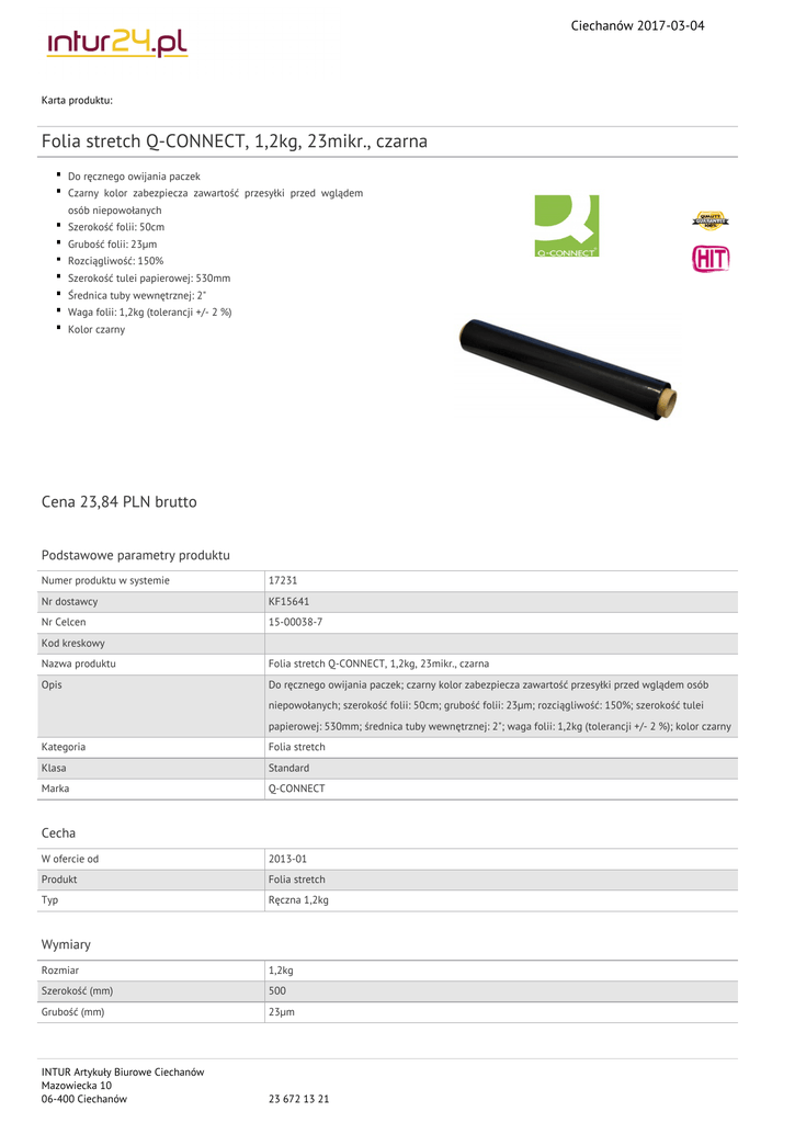 Ciechanów 2017-03-04 Karta produktu: Folia stretch Q-CONNECT, 1,2kg, 23mikr., czarna Do ręcznego owijania paczek Czarny kolor zabezpiecza zawartość przesyłki przed wglądem osób niepowołanych Szerokość folii: 50cm Grubość folii: 23μm Rozciągliwość: 150% Szerokość tulei papierowej: 530mm Średnica tuby wewnętrznej: 2" Waga folii: 1,2kg (tolerancji +/- 2 %) Kolor czarny Cena 23,84 PLN brutto Podstawowe parametry produktu Numer produktu w systemie 17231 Nr dostawcy KF15641 Nr Celcen 15-00038-7 Kod kreskowy Nazwa produktu Folia stretch Q-CONNECT, 1,2kg, 23mikr., czarna Opis Do ręcznego owijania paczek; czarny kolor zabezpiecza zawartość przesyłki przed wglądem osób niepowołanych; szerokość folii: 50cm; grubość folii: 23μm; rozciągliwość: 150%; szerokość tulei papierowej: 530mm; średnica tuby wewnętrznej: 2"; waga folii: 1,2kg (tolerancji +/- 2 %); kolor czarny Kategoria Folia stretch Klasa Standard Marka Q-CONNECT Cecha W ofercie od 2013-01 Produkt Folia stretch Typ Ręczna 1,2kg Wymiary Rozmiar 1,2kg Szerokość (mm) 500 Grubość (mm) 23µm INTUR Artykuły Biurowe Ciechanów Mazowiecka 10 06-400 Ciechanów 23 672 13 21 Ciechanów 2017-03-04 Karta katalogowa produktu cd. Folia stretch Q-CONNECT, 1,2kg, 23mikr., czarna Wspólny słownik zamówień CPV 39290000-1 Wyposażenie różne Certyfikaty Nowy produkt w ofercie Standard Hit Standard Kolor Kolor Czarny Serdecznie zapraszamy do współpracy INTUR Artykuły Biurowe Ciechanów zespół. INTUR Artykuły Biurowe Ciechanów Mazowiecka 10 06-400 Ciechanów 23 672 13 21