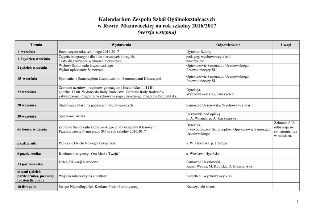Kalendarium Zespołu Szkół Ogólnokształcących w Rawie Mazowieckiej na rok szkolny 2016/2017 (wersja wstępna) Termin Wydarzenia Odpowiedzialni Uwagi Rozpoczęcie roku szkolnego 2016/2017 Zajęcia integracyjne dla klas pierwszych i drugich. Testy diagnozujące w klasach pierwszych Wybory Samorządu Uczniowskiego Wybór opiekunów Samorządu Dyrektor Szkoły pedagog, wychowawcy klas I nauczyciele Opiekunowie Samorządu Uczniowskiego, Przewodniczący SU 15 września Spotkanie z Samorządem Uczniowskim i Samorządami Klasowymi Opiekunowie Samorządu Uczniowskiego, Przewodniczący SU 22 września Zebranie uczniów i rodziców gimnazjum i liceum klas I, II i III godzina 17.00. Wybory do Rady Rodziców. Zebranie Rady Rodziców – zatwierdzenie Programu Wychowawczego i Szkolnego Programu Profilaktyki. Dyrekcja, Wychowawcy klas, nauczyciele 28 września Ślubowanie klas I na godzinach wychowawczych Samorząd Uczniowski, Wychowawcy klas I 30 września Sprzątanie świata Uczniowie pod opieką p. A. Wilanek, p. A. Kaczmarska do końca września Zebranie Samorządu Uczniowskiego z Samorządami Klasowymi. Przedstawienie Planu pracy SU na rok szkolny 2016/2017 Zebrania S.U. Dyrekcja, odbywają się Przewodniczący Samorządów, Opiekunowie Samorządu co najmniej raz Uczniowskiego w miesiącu. październik Papieskie Dzieło Nowego Tysiąclecia s. W. Hyzińska p. J. Sroga 6 października Konkurs plastyczny „Oto Matka Twoja” s. Wiesława Hyzińska Dzień Edukacji Narodowej Samorząd Uczniowski, Kamil Wrona, M. Kubicka, D. Błażejewska ostatni tydzień października, pierwszy tydzień listopada Wyjścia młodzieży na cmentarz Katecheci, Wychowawcy klas 10 listopada Święto Niepodległości. Konkurs Pieśni Patriotycznej Nauczyciele historii 1 września 1-2 tydzień września 2 tydzień września 13 października 1 18 listopada Dzień Patronki Szkoły p. J. Bors, p. W. Lewnadowska - Walczak, p. M. Kubicka 24 listopada Śródokresowe zebrania z rodzicami uczniów klas I, II, III liceum i gimnazjum – informacja o postępach w nauce i zachowaniu. Zapoznanie rodziców z regulaminem egzaminu maturalnego i gimnazjalnego. Dyrektor Szkoły, Wychowawcy, listopad IV Powiatowy Konkurs Recytatorski im. Karola Wojtyły s. Wiesława Hyzińska listopad Matura próbna z „Operonem”. Próbny egzamin gimnazjalny. Dyrekcja, Wychowawcy klas III listopad Wieczór Poezji s. Wiesława, p. A. Wróbel, p. A. Prejs Listopad/grudzień Powiatowy Konkurs Wiedzy o HIV/AIDS. 23 grudnia 23.12. 2016 – 31.12.2016 styczeń Wigilia Bożego Narodzenia – Wigilia szkolna 10 stycznia 13 stycznia Ks. Jakub, J. Sroga, Kamil Wrona Zimowa przerwa świąteczna. Dyskoteka dla gimnazjum i liceum Klasyfikacyjne posiedzenie Rady Pedagogicznej dla klas I, II,III liceum oraz I, II i III gimnazjum. Wywiadówka kończąca I semestr w klasach I, II,III liceum oraz I, II i III gimnazjum. Opiekunowie SU, nauczyciele Dyrektor Szkoły Wychowawcy klas 13 stycznia Koniec I części roku szkolnego I, II,III liceum oraz I, II i III gimnazjum. 16.01-29.01.2017 Ferie zimowe Luty Dzień Języków Obcych marzec /kwiecień Dzień Otwarty marzec Targi Edukacyjne kwiecień Pielgrzymka maturzystów na Jasna Górę s. Wiesława Hyzińska, ks. Jakub Świerczyński kwiecień Festiwal Miniatur Teatralnych Samorząd Uczniowski, Nauczyciele poloniści, nauczyciele języków obcych Samorząd Uczniowski, A. Chylak, D.Błażejewska Samorząd Uczniowski, p. D. Błażejewska, p. L. Gruntowska p. M. Hoffman, p. R. Janeczek 2 2 marca 27 marca Święto szkoły (72 –lecie). Turniej tenis stołowy puchar prezesa Stowarzyszenia SWGiLO. Zebranie rodziców klas I, II, III liceum oraz I, II i III gimnazjum. (Poinformowanie rodziców uczniów klas III LO o przewidywanych ocenach niedostatecznych w klasach III). Dyrekcja, nauczyciele historii i wychowania fizycznego, p. Kamil Wrona Wychowawcy klas 29 marca Ostateczny termin poinformowania uczniów klas trzecich i ich rodziców o przewidywanych dla uczniów ocenach rocznych niedostatecznych. Wychowawcy klas 12 kwiecień Uroczystość Wielkanocna s. Wiesława, p. A. Prejs, p. Kamil Wrona 13.04.-18.04.2017 Wiosenna przerwa świąteczna 11 kwietnia Poinformowanie uczniów i rodziców o ocenach końcowo rocznych w klasach III. Wychowawcy klas III 19-21 kwietnia Egzaminy gimnazjalne. Dyrekcja Szkoły 26 kwietnia Posiedzenie Rady Pedagogicznej. Klasyfikacja klas III liceum. Dyrektor Szkoły 28 kwietnia Zakończenie zajęć w klasach III liceum. Pożegnanie klas III. 27 kwietnia Święto Konstytucji 3. Maja 27 kwietnia Przygotowanie sal na maturę pisemną 4,5,8 maja Dni wolne od zajęć dydaktycznych – matury pisemne 4 - 24 maja Egzamin maturalny- sesja egzaminów pisemnych Dyrektor Szkoły 4 - 27 maja Egzaminy ustne - języki obce nowożytne Dyrektor Szkoły 8-20 maja Egzaminy ustne - język polski 24 maja Poinformowanie rodziców i uczniów klas I, II liceum oraz I, II i III gimnazjum o przewidywanych rocznych ocenach niedostatecznych. 8 czerwca Poinformowanie uczniów i ich rodziców o ocenach końcoworocznych w klasach I, Wychowawcy klas I –III II liceum oraz I, II i III gimnazjum 21 czerwca Posiedzenie klasyfikacyjne Rady Pedagogicznej Dyrekcja Szkoły, Samorząd Uczniowski, Wychowawcy klas III p. L. Gruntowska, p. D. Błażejewska, K. Wrona Wychowawcy klas II Wychowawcy klas I, II liceum oraz I, II i III gimnazjum Dyrektor Szkoły 3 23czerwca Uroczyste zakończenie roku szkolnego 2015/2016. Podsumowanie roku szkolnego Dyrektor Szkoły 2016/2017. 24 czerwca - 31 sierpnia 2017 Ferie letnie cały rok Preorientacja zawodowa. Współpraca z Mobilnym Centrum Informacji i Planowania Kariery Zawodowej w Skierniewicach. Zajęcia psychoedukacyjne oraz testy zawodowe. Współpraca z Powiatowym Urzędem Pracy i Młodzieżowym Centrum Kariery. Współpraca z OHP – Mobilnym Centrum Informacji Zawodowej. Współpraca z Powiatową Komendą Policji w Rawie Maz. Dyrekcja, Pedagog Szkolny, Wychowawcy klas II i III, Psycholog Szkolny ca