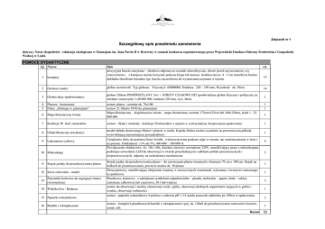 Załącznik nr 1 Szczegółowy opis przedmiotu zamówienia dotyczy: Nasze ekopodróże - edukacja ekologiczna w Gimnajum im. Jana Pawła II w Drzewicy w ramach konkursu organizowanego przez Wojewódzki Fundusz Ochrony Środowiska i Gospodarki Wodnej w Łodzi. POMOCE DYDAKTYCZNE Lp Nazwa Opis precyzyjna busola zamykana – obudowa odporna na warunki atmosferyczne, chroni przed zarysowaniem, czy zniszczeniem.; z kompasu można korzystać podczas biegu lub marszu. średnica tarczy: 4 - 5 cm umożliwia bardzo dokładne określenie kierunku typ: busola soczewkowa do wyznaczania azymutu w terenie szt. 15 1 kompasy 2 Globusy (małe) globus uczniowski Typ globusa: Fizyczny1: 60000000, Średnica: 220 – 250 mm, Wysokość: ok. 30cm 14 3 Globus duzy (podświetlany) globus 320mm PODŚWIETLANY 2w1 + STREFY CZASOWE HIT (podświetlany globus fizyczny i polityczny ze strefami czasowymi) 1:40 000 000; średnica 320 mm, wys. 48cm. 1 4 5 Plansze - kontynenty Filmy „Ekologia w gimnazjum” 6 Mapa klimatyczna świata 7 zestaw plansz - rozmiar ok. 70x100 zestaw 21 filmów DVD do gimnazjum Mapa klimatyczna - krajobrazowa świata – mapa dwustronna, rozmiar 175cmx125cm lub 160x120cm, skala 1 : 22 000 000 1 1 Kolekcja 50 skał i minerałów zestaw - Skały i minerały - kolekcja 50 minerałów z opisem w wytrzymałym, bezpiecznym opakowaniu 1 8 Układ Słoneczny (ruchomy) model układu słonecznego Słońce i planety w ruchu. Kopułę Słońca można wymienić na przezroczystą półkulę wyświetlającą najważniejsze gwiazdozbiory. 1 9 Luksomierz cyfrowy 10 Mikroskopy 11 Stojak jezdny do przechowywania plansz 12 Serce człowieka - model 13 Pojemniki kolorowe do segregacji śmieci (wewnętrzne) 14 Walizka Eco - Badacza 15 Papierki wskaźnikowe 16 Butelki z wkraplaczami Urządzenie służy do pomiaru ilości światła , wykorzystywane podczas zajęć w terenie, np. nasłonecznienie w lesie i na polanie. Dokładność: ±3% do 5%; 400 000 – 500 000 Ix Powiększenie obiektywów: 4x, 10x i 40x, Zasilacz sieciowy zewnętrzny 220V, umożliwiający prace z mikroskopem, podwójne oświetlenie LED do obserwacji w świetle przechodzącym i odbitym próbek przezroczystych i nieprzezroczystych, odporny na uszkodzenia mechaniczne Stojak jezdny do przechowywania plansz – do zawieszania plansz ściennych o formacie 70 cm x 100 cm. Stojak na kółkach do przemieszczania, powiesic można ok. 30 plansz Dwuczęściowy, umożliwiający obejrzenie wnętrza, w rzeczywistych wymiarach, wykonany z tworzywa sztucznego, na podstawie Plastikowe, kolorowe , z naklejkami symbolami odpadów(żółte – plastik, niebieskie – papier, białe – szkło), zamykane całkowicie lub częściowo, 50 l lub większe zestaw do obserwacji i analizy chemicznej wody i gleby, obserwacji drobnych organizmów żyjących w glebie i wodzie, obserwacji roślinności zestaw - papierki wskaźnikowe 4-polowe o zakresie pH 1-14, każdy paseczek oddzielny po 100szt w opakowaniu. zestaw - komplet 6 plastikowych butelek z wkraplaczami o poj. ok. 120ml do przechowywania roztworów kwasów, zasad, soli. Razem 1 4 5 1 1 3 1 2 1 53