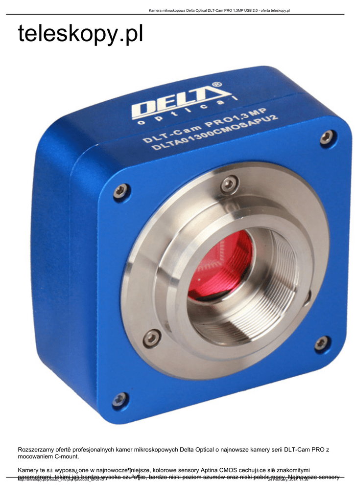 Kamera mikroskopowa Delta Optical DLT-Cam PRO 1,3MP USB 2.0 - oferta teleskopy.pl teleskopy.pl Rozszerzamy ofertê profesjonalnych kamer mikroskopowych Delta Optical o najnowsze kamery serii DLT-Cam PRO z mocowaniem C-mount. Kamery te s± wyposa¿one w najnowocze¶niejsze, kolorowe sensory Aptina CMOS cechuj±ce siê znakomitymi parametrami, takimi jak bardzo wysoka czu³o¶æ, bardzo niski poziom szumów oraz niski pobór24mocy. sensory http://teleskopy.pl/product_info.php?products_id=3740 February,Najnowsze 2017, 17:36 Kamera mikroskopowa Delta Optical DLT-Cam PRO 1,3MP USB 2.0 - oferta teleskopy.pl CMOS, w porównaniu z dotychczas stosowanymi matrycami CCD, maj± znacznie poprawione odwzorowanie kolorów oraz pobór mocy. Ogranicza to nagrzewanie siê kamery i upraszcza zasilanie - wystarcza pobór mocy wprost z gniazda USB komputera. Do ka¿dej kamery do³±czone s± sterowniki oraz autorskie oprogramowanie w jêzyku polskim Delta Optical DLT-Cam Viewer, s³u¿±ce do przechwytywania zdjêæ i nagrañ video z kamery DLT-Cam PRO. Oprogramowanie jest intuicyjne i posiada du¿e mo¿liwo¶ci, takie jak regulacja czasu ekspozycji, balansu bieli oraz rozdzielczo¶ci i jasno¶ci obrazu. Program umo¿liwia te¿ przeprowadzanie pomiarów oraz posiada wiele funkcji edycji uzyskanych zdjêæ. Kamera DLT-Cam PRO 1,3 MP USB 2.0 jest najbardziej ekonomiczn± kamer± w¶ród serii DLT-Cam PRO, zachowuj±c nisk± cenê przy rozs±dnej rozdzielczo¶ci i du¿ej szybko¶ci rejestrowanego obrazu. Jej du¿e piksele oferuj± niezwykle wysok± czu³o¶æ i bardzo wysok± dynamikê tonaln±. Parametry techniczne • sensor: Aptina CMOS MT9M001 (kolor) • przek±tna sensora: 1/2 • rozmiar sensora: 6,66 x 5,32 mm • rozmiar piksela: 5,2 x 5,2 mikrometrów • czu³o¶æ: 2,1 V • dynamika: 68,2 dB • odstêp sygna³u od szumu: 45 dB • maksymalna rozdzielczo¶æ: 1280 x 1024 pix • szybko¶æ pracy: 20 FPS @ 1280 x 1024 pix • czas ekspozycji: 0,14 500 ms • zakres widmowy: 380 650 nm (filtr IR) • balans bieli: ROI/manualny • rejestrowane pliki: zdjêcia (JPEG)/film video (AVI) • interfejs: USB 2.0 • zasilanie: 5VDC/500 mA (z gniazda USB) • ch³odzenie: pasywne • zakres temperatury pracy: -10/+50 st. C • wymiary: 58 x 58 x 36,4 mm (z mocowaniem C-mount) Elementy zestawu http://teleskopy.pl/product_info.php?products_id=3740 24 February, 2017, 17:36 Kamera mikroskopowa Delta Optical DLT-Cam PRO 1,3MP USB 2.0 - oferta teleskopy.pl • kamera • ³±cznik optyczny do tubusów 23,2 mm • adaptery 30 mm i 30,5 mm • kabel zasilaj±cy USB • p³yta CD z oprogramowaniem Gwarancja 2 lata http://teleskopy.pl/product_info.php?products_id=3740 24 February, 2017, 17:36
