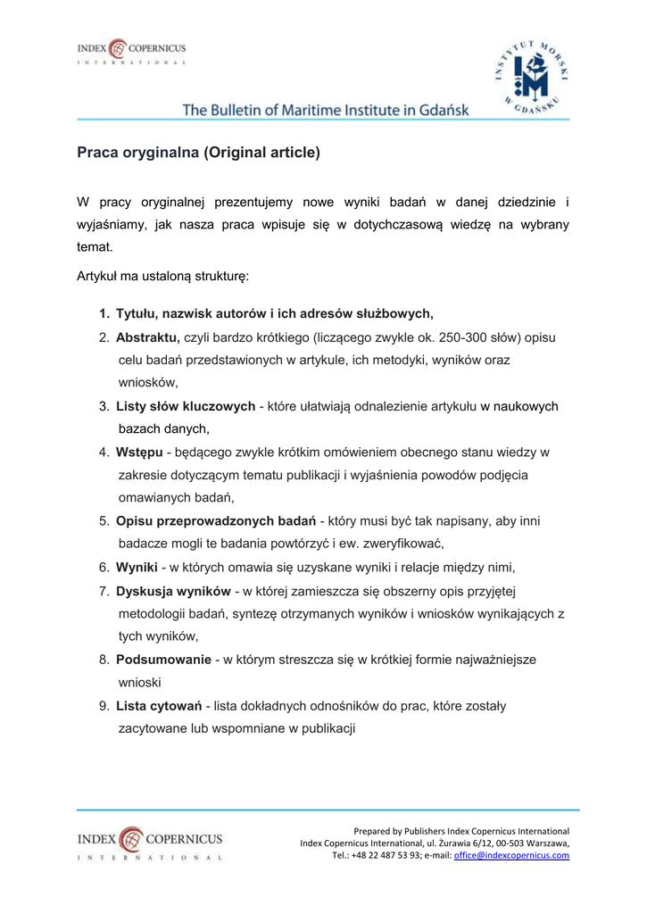 Praca oryginalna (Original article) W pracy oryginalnej prezentujemy nowe wyniki badań w danej dziedzinie i wyjaśniamy, jak nasza praca wpisuje się w dotychczasową wiedzę na wybrany temat. Artykuł ma ustaloną strukturę: 1. Tytułu, nazwisk autorów i ich adresów służbowych, 2. Abstraktu, czyli bardzo krótkiego (liczącego zwykle ok. 250-300 słów) opisu celu badań przedstawionych w artykule, ich metodyki, wyników oraz wniosków, 3. Listy słów kluczowych - które ułatwiają odnalezienie artykułu w naukowych bazach danych, 4. Wstępu - będącego zwykle krótkim omówieniem obecnego stanu wiedzy w zakresie dotyczącym tematu publikacji i wyjaśnienia powodów podjęcia omawianych badań, 5. Opisu przeprowadzonych badań - który musi być tak napisany, aby inni badacze mogli te badania powtórzyć i ew. zweryfikować, 6. Wyniki - w których omawia się uzyskane wyniki i relacje między nimi, 7. Dyskusja wyników - w której zamieszcza się obszerny opis przyjętej metodologii badań, syntezę otrzymanych wyników i wniosków wynikających z tych wyników, 8. Podsumowanie - w którym streszcza się w krótkiej formie najważniejsze wnioski 9. Lista cytowań - lista dokładnych odnośników do prac, które zostały zacytowane lub wspomniane w publikacji Prepared by Publishers Index Copernicus International Index Copernicus International, ul. Żurawia 6/12, 00-503 Warszawa, Tel.: +48 22 487 53 93; e-mail: [email protected]