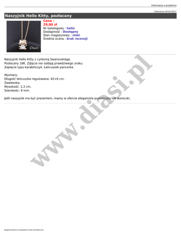 Informacje o produkcie Utworzono 04-03-2017 Naszyjnik Hello Kitty, pozłacany Cena : 29,00 zł Naszyjnik Hello Kitty z cyrkonią Swarovskiego. Pozłacany 18K. Zdjęcia nie oddają prawdziwego uroku. Zapięcie typu karabińczyk. Łańcuszek pancerka. Wymiary: Długość łańcuszka regulowana: 42+6 cm. Zawieszka: Wysokość: 1,3 cm. Szerokośc: 9 mm. si .p l Nr katalogowy : hello Dostępność : Dostępny Stan magazynowy : niski Średnia ocena : brak recenzji w w w .d ia Jeśli naszyjnik ma być prezentem, mamy w ofercie eleganckie pudełeczka lub woreczki. Wygenerowano w programie www.oscGold.com