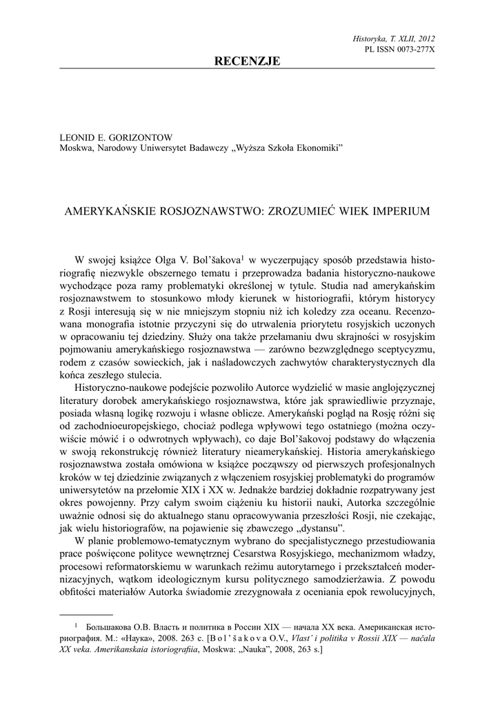 RECENZJE Historyka, T. XLII, 2012 PL ISSN 0073-277X LEONID E. GORIZONTOW Moskwa, Narodowy Uniwersytet Badawczy „Wyższa Szkoła Ekonomiki” AMERYKAŃSKIE ROSJOZNAWSTWO: ZROZUMIEĆ WIEK IMPERIUM W swojej książce Olga V. Bol’šakova1 w wyczerpujący sposób przedstawia historiografię niezwykle obszernego tematu i przeprowadza badania historyczno-naukowe wychodzące poza ramy problematyki określonej w tytule. Studia nad amerykańskim rosjoznawstwem to stosunkowo młody kierunek w historiografii, którym historycy z Rosji interesują się w nie mniejszym stopniu niż ich koledzy zza oceanu. Recenzowana monografia istotnie przyczyni się do utrwalenia priorytetu rosyjskich uczonych w opracowaniu tej dziedziny. Służy ona także przełamaniu dwu skrajności w rosyjskim pojmowaniu amerykańskiego rosjoznawstwa — zarówno bezwzględnego sceptycyzmu, rodem z czasów sowieckich, jak i naśladowczych zachwytów charakterystycznych dla końca zeszłego stulecia. Historyczno-naukowe podejście pozwoliło Autorce wydzielić w masie anglojęzycznej literatury dorobek amerykańskiego rosjoznawstwa, które jak sprawiedliwie przyznaje, posiada własną logikę rozwoju i własne oblicze. Amerykański pogląd na Rosję różni się od zachodnioeuropejskiego, chociaż podlega wpływowi tego ostatniego (można oczywiście mówić i o odwrotnych wpływach), co daje Bol’šakovoj podstawy do włączenia w swoją rekonstrukcję również literatury nieamerykańskiej. Historia amerykańskiego rosjoznawstwa została omówiona w książce począwszy od pierwszych profesjonalnych kroków w tej dziedzinie związanych z włączeniem rosyjskiej problematyki do programów uniwersytetów na przełomie XIX i XX w. Jednakże bardziej dokładnie rozpatrywany jest okres powojenny. Przy całym swoim ciążeniu ku historii nauki, Autorka szczególnie uważnie odnosi się do aktualnego stanu opracowywania przeszłości Rosji, nie czekając, jak wielu historiografów, na pojawienie się zbawczego „dystansu”. W planie problemowo-tematycznym wybrano do specjalistycznego przestudiowania prace poświęcone polityce wewnętrznej Cesarstwa Rosyjskiego, mechanizmom władzy, procesowi reformatorskiemu w warunkach reżimu autorytarnego i przekształceń modernizacyjnych, wątkom ideologicznym kursu politycznego samodzierżawia. Z powodu obfitości materiałów Autorka świadomie zrezygnowała z oceniania epok rewolucyjnych, 1 Большакова О.В. Власть и политика в России XIX — начала XX века. Американская историография. М.: «Наука», 2008. 263 с. [B o l ’ š a k o v a O.V., Vlast’ i politika v Rossii XIX — načala XX veka. Amerikanskaia istoriografiia, Moskwa: „Nauka”, 2008, 263 s.] 216 Leonid E. Gorizontow koncentrując się na okresach względnej stabilności. Za ramy chronologiczne posłużył „długi” wiek XIX, obejmujący prawie cały okres imperialny. Jego charakterystyczną cechę w Rosji stanowi ogromna rola państwa, które kierowało się przy formułowaniu kursu politycznego zarówno względami podtrzymywania porządku społecznego, jak i interesami skarbu oraz imperatywami obrony. Chodzi zatem o kluczową problematykę dla rozumienia okresu imperium. W ślad za amerykańskimi rosjoznawcami Bol’šakova przydziela centralne miejsce Wielkim reformom i następującym po nich kontrreformom. Mniej jest materiału z pierwszej połowy XIX wieku, na którą przypadają przekształcenia Aleksandra I i mikołajowskie „przedreformy”. Nie uniknęła wszakże Autorka wypraw w głąb XVIII wieku. Osobny rozdział zawiera analizę ocen politycznej działalności Stołypina, podczas gdy polityka Wittego została scharakteryzowana bardzo krόtko. Reformy rozpatrywane są jako proces rozciągnięty na wiele dziesięcioleci i postrzegany, mimo jego fragmentaryczności, jako ciągły. Na początek jednak o twórcach obrazu przedrewolucyjnej Rosji. Biorąc pod uwagę ludzki wymiar nauki historycznej, Bol’šakova przedstawia czytelnikowi filary dyscypliny (M.Karpovič, M Raeff, R. Pipes i in.), zbiorowy portret przedstawicieli zawodu oraz charakterystykę ukształtowanych szkół naukowych. Ze względu na istotne dla rozwoju nauki stosunki wzajemne nauczyciela i ucznia, przedmiotem badań w książce uczyniono trzy generacje badaczy. Przy tym Autorka rozumie, że źródło dynamiki zawiera się nie tylko w zmianie, ale i we współistnieniu generacji uczonych, a także w obecności postaci niezwykłych, wykraczających poza powszechny format. Rzeczywistymi założycielami rosjoznawczych badań na Zachodzie byli historycy emigranci z Rosji, przede wszystkim nosiciele liberalnej tradycji historiograficznej, dla której po rewolucji zabrakło miejsca w kraju. W studiowaniu problematyki XIX i początku XX wieku oraz przygotowywaniu kadr badaczy najbardziej wyraźny ślad pozostawili przedstawiciele pierwszej fali emigracji, którzy byli naocznymi świadkami i uczestnikami politycznego życia w okresie późnego cesarstwa. Znaczący wkład do amerykańskiego rosjoznawstwa włożyli także stronnicy narodnictwa, a szczególnie marksizmu, do którego sympatie wzrosły na fali lewicowych nastrojów lat 60. XX wieku. Nawet w czasach maccartyzmu wśród rosjoznawców pracowało niemało ludzi sympatyzujących ze Związkiem Radzieckim. W książce zwrócono także uwagę na taki czynnik, jak ogólne rytmy politycznego i intelektualnego życia Zachodu. W rozwoju amerykańskiego rosjoznawstwa Bol’šakova słusznie odnotowuje znaczącą rolę uchodźców z Polski i Niemiec. Wpływ rosyjskiej historiografii za oceanem nie ograniczał się do „ucieczki mózgów”. Wszelkie wyłomy w „żelaznej kurtynie” — w tym wymiany kulturalne — były wykorzystywane przez historyków w celu wzajemnych kontaktów w czasie „odwilży”, odprężenia i pierejstrojki. Dla Amerykanów niezbędny był dostęp do literatury i źródeł, szczególnie archiwa