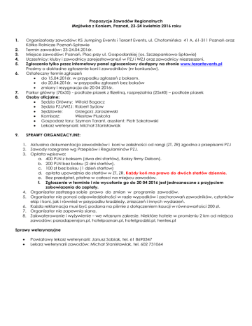 Propozycje Zawodów Regionalnych Majówka z Koniem, Poznań, 23-24 kwietnia 2016 roku Organizatorzy zawodów: KS Jumping Events i Tarant Events, ul. Chotomińska 41 A, 61-311 Poznań oraz Kółko Rolnicze Poznań-Spławie Termin zawodów: 23-24.04.2016r. Miejsce zawodów: Poznań, Plac przy ul. Gospodarskiej (os. Szczepankowo-Spławie) Uczestnicy: kluby i zawodnicy zarejestrowane/i w PZJ i WZJ oraz zawodnicy niezrzeszeni. Zgłoszenia tylko przez internetowy panel zgłoszeniowy dostępny na stronie www.tarantevents.pl Prosimy o dokładne zgłoszenie koni i zawodników (nr konkursów). Ostateczny termin zgłoszeń • do 15.04.2016r. w przypadku zgłoszeń z boksem. • do 20.04.2016r. w przypadku zgłoszeń bez boksów • zmiany i rezygnacja do 20 04 2016r. Parkur główny (70x35) - podłoże piasek z flizeliną, rozprężalnia (25x40) – podłoże piasek Osoby oficjalne: • Sędzia Główny: Witold Bogacz • Sędzia PZJ/WZJ: Robert Sydow • Sędziowie: Grzegorz Jaroszewski • Komisarz: Wiesław Pluskota • Gospodarz toru: Szymon Tarant, asystent: Piotr Sokołowski • Lekarz weterynarii: Michał Stanisławiak 1. 2. 3. 4. 5. 6. 7. 8. 9. SPRAWY ORGANIZACYJNE: 1. Aktualna dokumentacja zawodników i koni w zależności od rangi (ZT, ZR) zgodna z przepisami PZJ 2. Zawody rozegrane wg Przepisów i Regulaminów PZJ. 3. Opłata wpisowa: a. 400 PLN z boksem (dwa dni startów), Boksy firmy Debon). b. 200 PLN bez boksu (2 dni startów), c. 100 zł bez boksu (1 dzień startow) d. opłata upoważnia do startów w ZT, ZR. Każdy koń ma prawo do dwóch startów dziennie. e. Bez przedpłat, płatne w całosci na miejscu zawodów. f. Zgłoszenie w terminie i nie wycofanie go do 20 04 2016 jest jednoznaczne z przyjęciem zobowiazania do zapłaty. 4. Organizator zastrzega sobie prawo do zmian w programie zawodów. 5. Organizator nie ponosi odpowiedzialności w razie wypadków i zachorowań zawodników, członków ekip i koni, jak i również w przypadku kradzieży, zniszczeń i innych wydarzeń. 6. Każda reklamacja musi być podana na piśmie z dołączeniem kaucji w równowartości 200 zł. 7. Organizator nie zapewnia siana. 8. Zakwaterowanie i wyżywienie – we własnym zakresie. Niektóre hotele w promieniu 2 km od miejsca zawodów: paradapensjon.pl, hotelpoznan.pl, hotelgrodzki.pl, henlex.pl Sprawy weterynaryjne • • Powiatowy lekarz weterynarii: Janusz Sobiak, tel. 61 8690347 Lekarz weterynarii zawodów: Michał Stanisławiak, tel. 602 731064 10. PROGRAM Sobota 23 kwietnia 2016 r. 8.00 • Konkurs 1T (LL) i 2T (L – Grand Prix Amatorów) – patrz oddzielne propozycje zawodów Towarzyskich ok. 10.30 • Konkurs nr 3 – klasy L, dokładności, art. 238.1.1, możliwy dwukrotny start • Konkurs nr 4 – klasa P, dwufazowy art. 274.5.3 • Konkurs nr 5 – klasa N, zwykły art. 238.2.1 • Konkurs nr 6 – klasa C – dwufazowy art. 274.5.5 20.00 • Konkurs 7T - dla kucy – patrz oddzielne propozycje • Konkurs nr 8 – klasa C – barier art. 262.3 Niedziela 24 kwietnia 2016 r. 8.00 lub 9.00 (w zależności od liczby zgłoszeń) • Konkurs nr 9 – klasa L, dwufazowy art.274.5.3 • Konkurs nr 10 – klasa P, zwykły art. 238.2.1 12.00 • Konkurs nr 11 – klasa N, szybkości art. 263 14.00 • • Konkurs 12T – dla kucy – patrz oddzielne propozycje ZT konkurs nr 13 – klasa C1 Grand Prix, art. 238.2.2, (maksymalnie 2 konie na zawodnika). Godziny rozpoczęcia konkursów mogą ulec zmianie. Szczegółowe godziny rozpoczęcia konkursów, listy startowe, wyniki będą do wglądu na www.majowkazkoniem.pl i www.tarantevents.pl Sobota 2T 4 5 6 L P N C CBariery 8 Niedziela 9 10 11 12T 13 L P N1 kuce C1 - GP I II II IV Nagrody rzeczowe za miejsca 1-3 300 zł 200 zł 150 zł 100 zł 400 zł 300 zł 100 zł 600 zł 600 zł 400 zł 200 zł 1 000 zł 2 000 zł 1 000 zł V 100 zł 100 zł 100 zł VI VII VIII RAZEM 50 zł 100 zł 100 zł 900 zł 1 600 zł 2 400 zł 100 zł 100 zł 50 zł 100 zł 3 500 zł 0 zł 0 zł 900 zł 2 700 zł 700 zł 500 zł 500 zł Nagrody rzeczowe za miejsca 1-3 200 zł 150 zł 100 zł 300 zł 1 200 zł 700 zł 500 zł 100 zł Nagrody rzeczowe za miejsca 1-3 4 200 zł* 2 800 zł 2 000 zł 1 400 zł 200 zł 200 zł PULA - 12 000 zł 24 000 zł *skrzynia na sprzęt firmy Alfako o wartości 1200 zł + nagroda pieniężna 3000 zł Propozycje zatwierdzone przez WZJ w dniu 22.03.2016 – Ryszard Szymoniak Serdecznie zapraszamy W imieniu Komitetu Organizacyjnego - Szymon Tarant I Prezes KJ Jumping Events – Grzegorz Jaroszewski Kodeks postępowania zgodnego z dobrem konia FEI wymaga, od wszystkich osób zaangażowanych w jakikolwiek sposób w międzynarodowy sport jeździecki, przestrzegania Kodeksu Postępowania z Koniem oraz uznania i zaakceptowania zasady, że dobro konia zawsze jest najważniejsze i nigdy nie może być podporządkowane rywalizacji sportowej ani wpływom komercyjnym. 1. Dobro konia jest wartością nadrzędną ponad wszelkimi innymi wymaganiami na wszystkich etapach treningu i przygotowań konia do startu w zawodach. a) Prawidłowe postępowanie z koniem Warunki stajenne, karmienie i trening muszą być zgodne z zasadami prawidłowego postępowania z koniem oraz nie mogą zaburzać jego dobrostanu. Nie będzie tolerowane jakiekolwiek postępowanie, które może spowodować cierpienie fizyczne lub psychiczne konia podczas trwania zawodów lub poza nimi. b) Metody treningowe Konie mogą być poddawane jedynie takiemu treningowi, który odpowiada ich możliwościom fizycznym i poziomowi dojrzałości do danej dyscypliny. Nie mogą być poddawane żadnym metodom szkoleniowym, które są brutalne i powodują strach, lub do których konie nie zostały odpowiednio przygotowane. c) Kucie i sprzęt Dbałość o kopyta i kucie musi spełniać wysokie standardy. Sprzęt musi być tak zaprojektowany i dopasowany, aby uniknąć ryzyka uszkodzenia ciała. d) Transport Podczas transportu konie muszą być w pełni zabezpieczone przed urazami i innymi zagrożeniami 