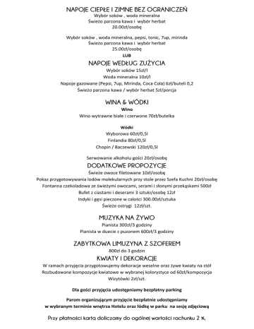 NAPOJE CIEPŁE I ZIMNE BEZ OGRANICZEŃ Wybór soków , woda mineralna Świeżo parzona kawa i wybór herbat 20.00zł/osobę Wybór soków , woda mineralna, pepsi, tonic, 7up, mirinda Świeżo parzona kawa i wybór herbat 25.00zł/osobę LUB NAPOJE WEDŁUG ZUŻYCIA Wybór soków 15zł/l Woda mineralna 10zł/l Napoje gazowane (Pepsi, 7up, Mirinda, Coca Cola) 6zł/buteli 0,2 Świeżo parzona kawa / wybór herbat 5zł/porcja WINA & WÓDKI Wino Wino wytrawne białe i czerwone 70zł/butelka Wódki Wyborowa 60zł/0,5l Finlandia 80zł/0,5l Chopin / Baczewski 120zł/0,5l Serwowanie alkoholu gości 20zł/osobę DODATKOWE PROPOZYCJE Świeże owoce filetowane 10zł/osobę Pokaz przygotowywania lodów molekularnych przy stole przez Szefa Kuchni 20zł/osobę Fontanna czekoladowa ze świeżymi owocami, serami i słonymi przekąskami 500zł Bufet z ciastami i deserami 3 sztuki/osobę 12zł Indyki i gęsi pieczone w calości 300.00zł/sztuka Świeże ostrygi 12zł/szt. MUZYKA NA ŻYWO Pianista 300zł/3 godziny Pianista w duecie z puzonem 600zł/3 godziny ZABYTKOWA LIMUZYNA Z SZOFEREM 800zł do 3 godzin KWIATY I DEKORACJE W ramach przyjęcia przygotowujemy dekoracje weselne oraz żywe kwiaty na stół Rozbudowane kompozycje kwiatowe w wybranej kolorystyce od 60zł/kompozycja Wizytówki 2zł/szt. Dla gości przyjęcia udostępniamy bezpłatny parking Parom organizującym przyjęcie bezpłatnie udostępniamy w wybranym terminie wnętrza Hotelu oraz łódkę w parku na sesję zdjęciową Przy płatności kartą doliczamy do ogólnej wartości rachunku 2 %,