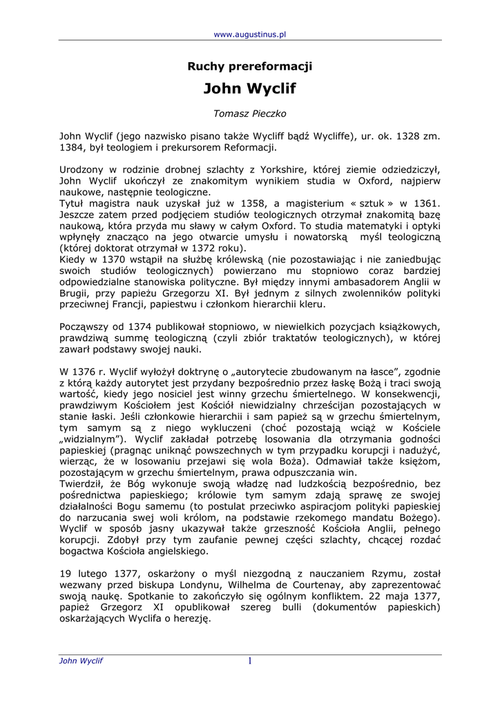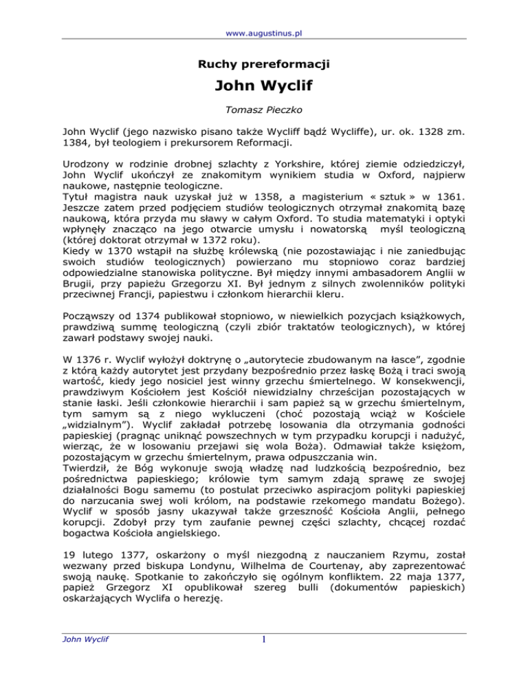 www.augustinus.pl Ruchy prereformacji John Wyclif Tomasz Pieczko John Wyclif (jego nazwisko pisano także Wycliff bądź Wycliffe), ur. ok. 1328 zm. 1384, był teologiem i prekursorem Reformacji. Urodzony w rodzinie drobnej szlachty z Yorkshire, której ziemie odziedziczył, John Wyclif ukończył ze znakomitym wynikiem studia w Oxford, najpierw naukowe, następnie teologiczne. Tytuł magistra nauk uzyskał już w 1358, a magisterium « sztuk » w 1361. Jeszcze zatem przed podjęciem studiów teologicznych otrzymał znakomitą bazę naukową, która przyda mu sławy w całym Oxford. To studia matematyki i optyki wpłynęły znacząco na jego otwarcie umysłu i nowatorską myśl teologiczną (której doktorat otrzymał w 1372 roku). Kiedy w 1370 wstąpił na służbę królewską (nie pozostawiając i nie zaniedbując swoich studiów teologicznych) powierzano mu stopniowo coraz bardziej odpowiedzialne stanowiska polityczne. Był między innymi ambasadorem Anglii w Brugii, przy papieżu Grzegorzu XI. Był jednym z silnych zwolenników polityki przeciwnej Francji, papiestwu i członkom hierarchii kleru. Począwszy od 1374 publikował stopniowo, w niewielkich pozycjach książkowych, prawdziwą summę teologiczną (czyli zbiór traktatów teologicznych), w której zawarł podstawy swojej nauki. W 1376 r. Wyclif wyłożył doktrynę o „autorytecie zbudowanym na łasce”, zgodnie z którą każdy autorytet jest przydany bezpośrednio przez łaskę Bożą i traci swoją wartość, kiedy jego nosiciel jest winny grzechu śmiertelnego. W konsekwencji, prawdziwym Kościołem jest Kościół niewidzialny chrześcijan pozostających w stanie łaski. Jeśli członkowie hierarchii i sam papież są w grzechu śmiertelnym, tym samym są z niego wykluczeni (choć pozostają wciąż w Kościele „widzialnym”). Wyclif zakładał potrzebę losowania dla otrzymania godności papieskiej (pragnąc uniknąć powszechnych w tym przypadku korupcji i nadużyć, wierząc, że w losowaniu przejawi się wola Boża). Odmawiał także księżom, pozostającym w grzechu śmiertelnym, prawa odpuszczania win. Twierdził, że Bóg wykonuje swoją władzę nad ludzkością bezpośrednio, bez pośrednictwa papieskiego; królowie tym samym zdają sprawę ze swojej działalności Bogu samemu (to postulat przeciwko aspiracjom polityki papieskiej do narzucania swej woli królom, na podstawie rzekomego mandatu Bożego). Wyclif w sposób jasny ukazywał także grzeszność Kościoła Anglii, pełnego korupcji. Zdobył przy tym zaufanie pewnej części szlachty, chcącej rozdać bogactwa Kościoła angielskiego. 19 lutego 1377, oskarżony o myśl niezgodną z nauczaniem Rzymu, został wezwany przed biskupa Londynu, Wilhelma de Courtenay, aby zaprezentować swoją naukę. Spotkanie to zakończyło się ogólnym konfliktem. 22 maja 1377, papież Grzegorz XI opublikował szereg bulli (dokumentów papieskich) oskarżających Wyclifa o herezję. John Wyclif 1 www.augustinus.pl Jesienią tego samego roku parlament angielski zwrócił się do niego z zapytaniem o ocenę legalności zakazu, jakim obłożono Kościół angielski w jego wywozie dóbr za granicę (działania dokonywanego na rozkaz papieski). Wyclif potwierdził legalność takiej decyzji parlamentu, co doprowadziło go do ponowniego doprowadzenia przed biskupa Londynu oraz arcybiskupa Canterbury (oczywiście podporządkowanych praktyce papieskiej). Dzięki swoim dobrym kontaktom z dworem królewskim, Wyclif został tylko „napomniany”... W roku 1378, Wyclif i jego przyjaciele z Oxfordu podjęli się tłumaczenia Biblii na język angielski (Biblia była dla Wyclifa naczelnym autorytetem), działając tym samym wbrew zakazowi papieskiemu, zabraniającemu takich praktyk (dążącemu tym samym do ograniczenia czytelników Biblii). Kiedy jednak w 1379 Wyclif odrzucił katolicką doktrynę o transsubstancjacji, utracił tym samym szereg swoich zwolenników. Począwszy od 1380 Wyclif wysyłał swoich uczniów, nazywanych ubogimi kaznodziejami, którzy na gnębionej przez szlachtę wsi angielskiej głosili idee równości wszystkich ludzi przed Bogiem. „Dwanaście Konkluzji” nauczania Lollardów (jaki nazywano owych kaznodziei) potępiały Kościół stanowiony, sakramenty, modlitwy za zmarłych, spowiedź. Lollardzi chcieli praktykować wiarę prostą i „ewangeliczną”: każdy człowiek ma mieć wolny dostęp do Pisma Świętego, w swoim własnym języku. To Lollardom zawdzięcza się dwa tłumaczenia Biblii po angielsku. W 1401 dekret angielski skaże heretyków lollardzkich na stos... Ponieważ kaznodzieje ci znajdowali szerokie zainteresowanie, oskarżono Wyclifa o sianie zamętu społecznego. Jednakże, kiedy w 1381 wybuchło powstanie chłopskie, a chłopi z Sussex i Kent, masakrując szlachtę i kler, napadli na Londyn w 1381, Wyclif nie zaangażował się w nie w sposób bezpośredni; był zdecydowanie bardziej mistykiem, niż działaczem społecznym, a teologia miała dla niego wymiar przede wszystkim moralny. Niemniej, można z dużym prawdopodobieństwem stwierdzić, że głoszone przezeń nauki miały pośredni wpływ na powstańców. Powstanie to zostało przez władze twardo zdławione... Kiedy w 1382, jego dawny nieprzyjaciel, biskup Londynu, został arcybiskupem Canterbury, zwołany został przeciw Wyclifowi trybunał kościelny, skazujący go jako heretyka i ogłaszający jego wygnanie z Oxfordu. Wyclif poddał się tej decyzji, osiadając w niewielkiej parafii. Myśl Wyclifa prezentuje całkowite zerwanie z Kościołem, w wymiarze, kiedy ten pretenduje do pośredniczenia w relacji Boga i wiernych. Wyclif podkreślał bezpośredniość takiej relacji, bez pośrednictwa księży. Zgodnie z nauczaniem Pisma Świętego, Wyclif myślał, że chrześcijanie mogą sami wziąć ich życie w swoje ręce, bez „pomocy” papieża i prałatów. Także wiele praktyk kościelnych Wyclif określał, jako sprzecznych z Pismem Świętym. Potępiał niewolnictwo i