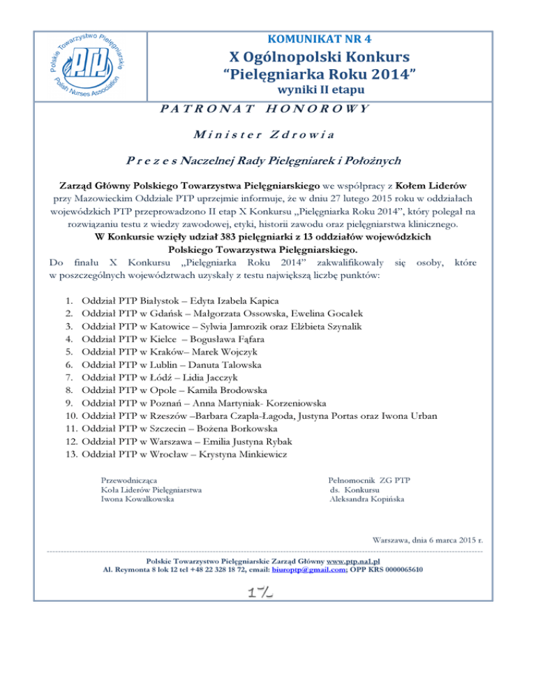 KOMUNIKAT NR 4 X Ogólnopolski Konkurs “Pielęgniarka Roku 2014” wyniki II etapu PATRONAT HONOROWY Minister Zdrowia P r e z e s Naczelnej Rady Pielęgniarek i Położnych Zarząd Główny Polskiego Towarzystwa Pielęgniarskiego we współpracy z Kołem Liderów przy Mazowieckim Oddziale PTP uprzejmie informuje, że w dniu 27 lutego 2015 roku w oddziałach wojewódzkich PTP przeprowadzono II etap X Konkursu „Pielęgniarka Roku 2014”, który polegał na rozwiązaniu testu z wiedzy zawodowej, etyki, historii zawodu oraz pielęgniarstwa klinicznego. W Konkursie wzięły udział 383 pielęgniarki z 13 oddziałów wojewódzkich Polskiego Towarzystwa Pielęgniarskiego. Do finału X Konkursu „Pielęgniarka Roku 2014” zakwalifikowały się osoby, które w poszczególnych województwach uzyskały z testu największą liczbę punktów: 1. 2. 3. 4. 5. 6. 7. 8. 9. 10. 11. 12. 13. Oddział PTP Białystok – Edyta Izabela Kapica Oddział PTP w Gdańsk – Małgorzata Ossowska, Ewelina Gocałek Oddział PTP w Katowice – Sylwia Jamrozik oraz Elżbieta Szynalik Oddział PTP w Kielce – Bogusława Fąfara Oddział PTP w Kraków– Marek Wojczyk Oddział PTP w Lublin – Danuta Talowska Oddział PTP w Łódź – Lidia Jacczyk Oddział PTP w Opole – Kamila Brodowska Oddział PTP w Poznań – Anna Martyniak- Korzeniowska Oddział PTP w Rzeszów –Barbara Czapla-Łagoda, Justyna Portas oraz Iwona Urban Oddział PTP w Szczecin – Bożena Borkowska Oddział PTP w Warszawa – Emilia Justyna Rybak Oddział PTP w Wrocław – Krystyna Minkiewicz Przewodnicząca Koła Liderów Pielęgniarstwa Iwona Kowalkowska Pełnomocnik ZG PTP ds. Konkursu Aleksandra Kopińska Warszawa, dnia 6 marca 2015 r. ----------------------------------------------------------------------------------------------------------------------------------------------------------Polskie Towarzystwo Pielęgniarskie Zarząd Główny www.ptp.na1.pl Al. Reymonta 8 lok 12 tel +48 22 328 18 72, email: [email protected]; OPP KRS 0000065610