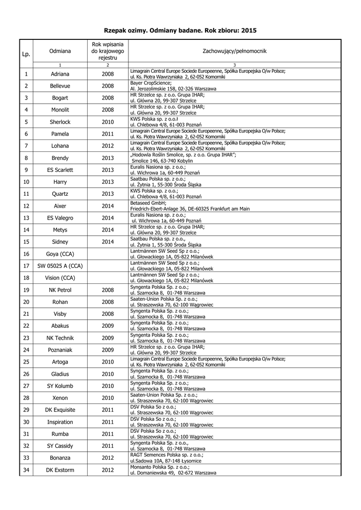 Rzepak ozimy. Odmiany badane. Rok zbioru: 2015 Lp. Odmiana Rok wpisania do krajowego rejestru 1 2 1 Adriana 2008 2 Bellevue 2008 3 Bogart 2008 4 Monolit 2008 5 Sherlock 2010 6 Pamela 2011 7 Lohana 2012 8 Brendy 2013 9 ES Scarlett 2013 10 Harry 2013 11 Quartz 2013 12 Aixer 2014 13 ES Valegro 2014 14 Metys 2014 15 Sidney 2014 16 Goya (CCA) 17 SW 05025 A (CCA) 18 Vision (CCA) 19 NK Petrol 2008 20 Rohan 2008 21 Visby 2008 22 Abakus 2009 23 NK Technik 2009 24 Poznaniak 2009 25 Artoga 2010 26 Gladius 2010 27 SY Kolumb 2010 28 Xenon 2010 29 DK Exquisite 2011 30 Inspiration 2011 31 Rumba 2011 32 SY Cassidy 2011 33 Bonanza 2012 34 DK Exstorm 2012 Zachowujący/pełnomocnik 3 Limagrain Central Europe Sociede Europeenne, Spółka Europejska O/w Polsce; ul. Ks. Piotra Wawrzyniaka 2, 62-052 Komorniki Bayer CropScience; Al. Jerozolimskie 158, 02-326 Warszawa HR Strzelce sp. z o.o. Grupa IHAR; ul. Główna 20, 99-307 Strzelce HR Strzelce sp. z o.o. Grupa IHAR; ul. Główna 20, 99-307 Strzelce KWS Polska sp. z o.o.ł ul. Chlebowa 4/8, 61-003 Poznań Limagrain Central Europe Sociede Europeenne, Spółka Europejska O/w Polsce; ul. Ks. Piotra Wawrzyniaka 2, 62-052 Komorniki Limagrain Central Europe Sociede Europeenne, Spółka Europejska O/w Polsce; ul. Ks. Piotra Wawrzyniaka 2, 62-052 Komorniki „Hodowla Roślin Smolice, sp. z o.o. Grupa IHAR”; Smolice 146, 63-740 Kobylin Euralis Nasiona sp. z o.o.; ul. Wichrowa 1a, 60-449 Poznań Saatbau Polska sp. z o.o.; ul. Żytnia 1, 55-300 Środa Śląska KWS Polska sp. z o.o.; ul. Chlebowa 4/8, 61-003 Poznań Betaseed GmbH; Friedrich-Ebert-Anlage 36, DE-60325 Frankfurt am Main Euralis Nasiona sp. z o.o.; ul. Wichrowa 1a, 60-449 Poznań HR Strzelce sp. z o.o. Grupa IHAR; ul. Główna 20, 99-307 Strzelce Saatbau Polska sp. z o.o., ul. Żytnia 1, 55-300 Środa Śląska Lantmännen SW Seed Sp z o.o.; ul. Głowackiego 1A, 05-822 Milanówek Lantmännen SW Seed Sp z o.o.; ul. Głowackiego 1A, 05-822 Milanówek Lantmännen SW Seed Sp z o.o.; ul. Głowackiego 1A, 05-822 Milanówek Syngenta Polska Sp. z o.o.; ul. Szamocka 8, 01-748 Warszawa Saaten-Union Polska Sp. z o.o.; ul. Straszewska 70, 62-100 Wągrowiec Syngenta Polska Sp. z o.o.; ul. Szamocka 8, 01-748 Warszawa Syngenta Polska Sp. z o.o.; ul. Szamocka 8, 01-748 Warszawa Syngenta Polska Sp. z o.o.; ul. Szamocka 8, 01-748 Warszawa HR Strzelce sp. z o.o. Grupa IHAR; ul. Główna 20, 99-307 Strzelce Limagrain Central Europe Sociede Europeenne, Spółka Europejska O/w Polsce; ul. Ks. Piotra Wawrzyniaka 2, 62-052 Komorniki Syngenta Polska Sp. z o.o.; ul. Szamocka 8, 01-748 Warszawa Syngenta Polska Sp. z o.o.; ul. Szamocka 8, 01-748 Warszawa Saaten-Union Polska Sp. z o.o.; ul. Straszewska 70, 62-100 Wągrowiec DSV Polska So z o.o.; ul. Straszewska 70, 62-100 Wągrowiec DSV Polska So z o.o.; ul. Straszewska 70, 62-100 Wągrowiec DSV Polska So z o.o.; ul. Straszewska 70, 62-100 Wągrowiec Syngenta Polska Sp. z o.o., ul. Szamocka 8, 01-748 Warszawa RAGT Semences Polska sp. z o.o.; ul.Sadowa 10A, 87-148 Łysomice Monsanto Polska Sp. z o.o.; ul. Domaniewska 49, 02-672 Warszawa 35 Marathon 2012 36 Marcopolos 2012 37 Sherpa 2012 38 SY Carlo 2012 39 Tores 2012 40 Arsenal 2013 41 DK Exclusiv 2013 42 DK Impressio CL 2013 473 Garou 2013 44 Mercedes 2013 45 Minerva 2013 46 SY Marten 2013 47 Arango 2014 48 DK Exssence 2014 49 Graf 2014 50 Oriolus 2014 51 Popular 2014 52 Shrek 2014 53 SY Polana 2014 54 SY Samoa 2014 55 SY Saveo 2014 56 Trumpf 2014 57 Atenzo (CCA) 58 Alabaster (CCA) 59 Albatros (CCA) 60 DK Excellium (CCA) 61 DK Explicit (CCA) 62 Hybrirock (CCA) 63 Kodiak (CCA) 64 NK Caravel (CCA) 65 NK Linus (CCA) 66 PR 46 W 20 (CCA) 67 68 69 PR 46 W 24 (CCA) PR 46 W 26 (CCA) PT213 (CCA) DSV Polska So z o.o., ul. Straszewska 70, 62-100 Wągrowiec KWS Polska sp. z o.o., ul. Chlebowa 4/8, 61-003 Poznań Saaten-Union Polska Sp. z o.o.; ul. Straszewska 70, 62-100 Wągrowiec Syngenta Polska Sp. z o.o., ul. Szamocka 8, 01-748 Warszawa Syngenta Polska Sp. z o.o., ul. Szamocka 8, 01-748 Warszawa Limagrain Central Europe Sociede Europeenne, Spółka Europejska O/w Polsce; ul. Ks. Piotra Wawrzyniaka 2, 62-052 Komorniki Monsanto Polska Sp. z o.o.; ul. Domaniewska 49, 02-672 Warszawa DSV Polska So z o.o., ul. Straszewska 70, 62-100 Wągrowiec Saaten-Union Polska Sp. z o.o.; ul. Straszewska 70, 62-100 Wągrowiec Saaten-Union Polska Sp. z o.o.; ul. Straszewska 70, 62-100 Wągrowiec DSV Polska So z o.o.; ul. Straszewska 70, 62-100 Wągrowiec Syngenta Polska Sp. z o.o., ul. Szamocka 8, 01-748 Warszawa Saaten-Union Polska Sp. z o.o.; ul. Straszewska 70, 62-100 Wągrowiec Monsanto Polska Sp. z o.o.; ul. Domaniewska 49, 02-672 Warszawa Monsanto Polska Sp. z o.o.; ul. Domaniewska 49, 02-672 Warszawa DSV Polska So z o.o.; ul. Straszewska 70, 62-100 Wągrowiec DSV Polska So z o.o.; ul. Straszewska 70, 62-100 Wągrowiec Saaten-Union Polska Sp. z o.o.; ul. Straszewska 70, 62-100 Wągrowiec Syngenta Polska Sp. z o.o.; ul. Szamocka 8, 01-748 Warszawa Syngenta Polska Sp. z o.o.; ul. Szamocka 8, 01-748 Warszawa Syngenta Polska Sp. z o.o.; ul. Szamocka 8, 01-748 Warszawa Saaten-Union Polska Sp. z o.o.; ul. Straszewska 70, 62-100 Wągrowiec Limagrain Central Europe Sociede Europeenne, Spółka Europejska O/w Polsce; ul. Ks. Piotra Wawrzyniaka 2, 62-052 Komorniki Limagrain Central Europe Sociede Europeenne, Spółka Europejska O/w Polsce; ul. Ks. Piotra Wawrzyniaka 2, 62-052 Komorniki Limagrain Central Europe Sociede Europeenne, Spółka Europejska O/w Polsce; ul. Ks. Piotra Wawrzyniaka 2, 62-052 Komorniki Monsanto Polska Sp. z o.o.; ul. Domaniewska 49, 02-672 Warszawa Monsanto Polska Sp. z o.o.; ul. Domaniewska 49, 02-672 Warszawa KWS Polska sp. z o.o.; ul. Chlebowa 4/8, 61-003 Poznań KWS Polska sp. z o.o.; ul. Chlebowa 4/8, 61-003 Poznań Syngenta Polska Sp. z o.o.; ul. Szamocka 8, 01-748 Warszawa Syngenta Polska Sp. z o.o.; ul. Szamocka 8, 01-748 Warszawa Pioneer Hi-Bred Northem Europe Sales Division GmbH Oddz. w Polsce, Swadzim; ul. Poznańska 16, 62-080 Tarnowo 