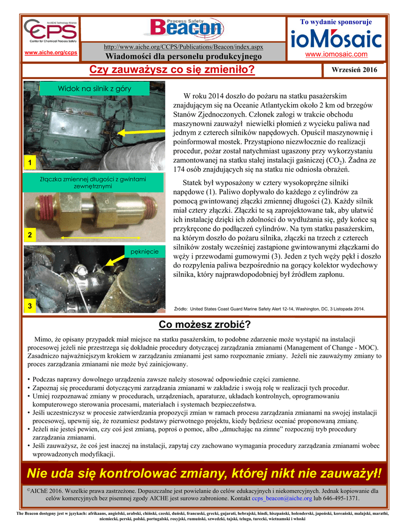 To wydanie sponsoruje www.aiche.org/ccps http://www.aiche.org/CCPS/Publications/Beacon/index.aspx Wiadomości dla personelu produkcyjnego Czy zauważysz co się zmieniło? Widok na silnik z góry Wrzesień 2016 W roku 2014 doszło do pożaru na statku pasażerskim znajdującym się na Oceanie Atlantyckim około 2 km od brzegów Stanów Zjednoczonych. Członek załogi w trakcie obchodu maszynowni zauważył niewielki płomień z wycieku paliwa nad jednym z czterech silników napędowych. Opuścił maszynownię i poinformował mostek. Przystąpiono niezwłocznie do realizacji procedur, pożar został natychmiast ugaszony przy wykorzystaniu zamontowanej na statku stałej instalacji gaśniczej (CO2). Żadna ze 174 osób znajdujących się na statku nie odniosła obrażeń. 1 Złączka zmiennej długości z gwintami zewnętrznymi 2 pęknięcie 3 www.iomosaic.com Statek był wyposażony w cztery wysokoprężne silniki napędowe (1). Paliwo dopływało do każdego z cylindrów za pomocą gwintowanej złączki zmiennej długości (2). Każdy silnik miał cztery złączki. Złączki te są zaprojektowane tak, aby ułatwić ich instalację dzięki ich zdolności do wydłużania się, gdy końce są przykręcone do podłączeń cylindrów. Na tym statku pasażerskim, na którym doszło do pożaru silnika, złączki na trzech z czterech silników zostały wcześniej zastąpione gwintowanymi złączkami do węży i przewodami gumowymi (3). Jeden z tych węży pękł i doszło do rozpylenia paliwa bezpośrednio na gorący kolektor wydechowy silnika, który najprawdopodobniej był źródłem zapłonu. Źródło: United States Coast Guard Marine Safety Alert 12-14, Washington, DC, 3 Listopada 2014. Co możesz zrobić? Mimo, że opisany przypadek miał miejsce na statku pasażerskim, to podobne zdarzenie może wystąpić na instalacji procesowej jeżeli nie przestrzega się dokładnie procedury dotyczącej zarządzania zmianami (Management of Change - MOC). Zasadniczo najważniejszym krokiem w zarządzaniu zmianami jest samo rozpoznanie zmiany. Jeżeli nie zauważymy zmiany to proces zarządzania zmianami nie może być zainicjowany. • Podczas naprawy dowolnego urządzenia zawsze należy stosować odpowiednie części zamienne. • Zapoznaj się procedurami dotyczącymi zarządzania zmianami w zakładzie i swoją rolę w realizacji tych procedur. • Umiej rozpoznawać zmiany w procedurach, urządzeniach, aparaturze, układach kontrolnych, oprogramowaniu komputerowego sterowania procesami, materiałach i systemach bezpieczeństwa. • Jeśli uczestniczysz w procesie zatwierdzania propozycji zmian w ramach procesu zarządzania zmianami na swojej instalacji procesowej, upewnij się, że rozumiesz podstawy pierwotnego projektu, kiedy będziesz oceniać proponowaną zmianę. • Jeżeli nie jesteś pewien, czy coś jest zmianą, poproś o pomoc, albo „dmuchając na zimne” rozpocznij tryb procedury zarządzania zmianami. • Jeśli zauważysz, że coś jest inaczej na instalacji, zapytaj czy zachowano wymagania procedury zarządzania zmianami wobec wprowadzonych modyfikacji. Nie uda się kontrolować zmiany, której nikt nie zauważył! ©AIChE 2016. Wszelkie prawa zastrzeżone. Dopuszczalne jest powielanie do celów edukacyjnych i niekomercyjnych. Jednak kopiowanie dla celów komercyjnych bez pisemnej zgody AICHE jest surowo zabronione. Kontakt [email protected] lub 646-495-1371. The Beacon dostępny jest w językach: afrikaans, angielski, arabski, chiński, czeski, duński, francuski, grecki, gujarati, hebrajski, hindi, hiszpański, holenderski, japoński, koreański, malajski, marathi, niemiecki, perski, polski, portugalski, rosyjski, rumuński, szwedzki, tajski, telugu, turecki, wietnamski i włoski