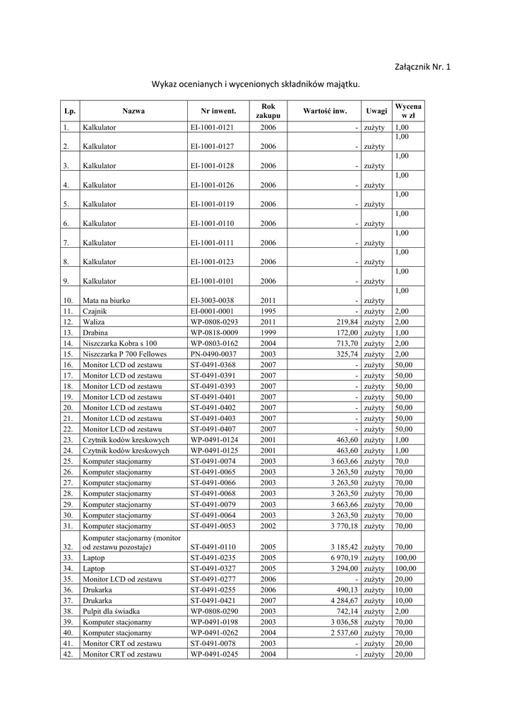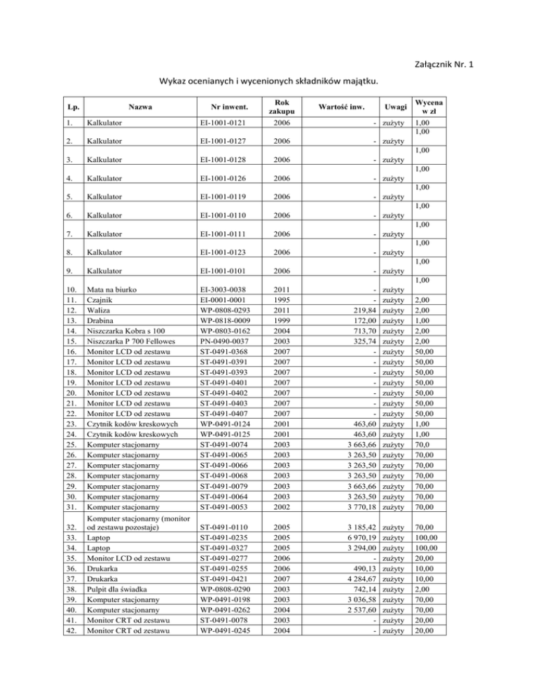 Załącznik Nr. 1 Wykaz ocenianych i wycenionych składników majątku. Lp. Nazwa Nr inwent. Rok zakupu Wartość inw. Uwagi Wycena w zł 1. Kalkulator EI-1001-0121 2006 - zużyty 2. Kalkulator EI-1001-0127 2006 - zużyty 3. Kalkulator EI-1001-0128 2006 - zużyty 4. Kalkulator EI-1001-0126 2006 - zużyty 5. Kalkulator EI-1001-0119 2006 - zużyty 6. Kalkulator EI-1001-0110 2006 - zużyty 7. Kalkulator EI-1001-0111 2006 - zużyty 8. Kalkulator EI-1001-0123 2006 - zużyty 9. Kalkulator EI-1001-0101 2006 - zużyty 10. 11. 12. 13. 14. 15. 16. 17. 18. 19. 20. 21. 22. 23. 24. 25. 26. 27. 28. 29. 30. 31. Mata na biurko Czajnik Waliza Drabina Niszczarka Kobra s 100 Niszczarka P 700 Fellowes Monitor LCD od zestawu Monitor LCD od zestawu Monitor LCD od zestawu Monitor LCD od zestawu Monitor LCD od zestawu Monitor LCD od zestawu Monitor LCD od zestawu Czytnik kodów kreskowych Czytnik kodów kreskowych Komputer stacjonarny Komputer stacjonarny Komputer stacjonarny Komputer stacjonarny Komputer stacjonarny Komputer stacjonarny Komputer stacjonarny EI-3003-0038 EI-0001-0001 WP-0808-0293 WP-0818-0009 WP-0803-0162 PN-0490-0037 ST-0491-0368 ST-0491-0391 ST-0491-0393 ST-0491-0401 ST-0491-0402 ST-0491-0403 ST-0491-0407 WP-0491-0124 WP-0491-0125 ST-0491-0074 ST-0491-0065 ST-0491-0066 ST-0491-0068 ST-0491-0079 ST-0491-0064 ST-0491-0053 2011 1995 2011 1999 2004 2003 2007 2007 2007 2007 2007 2007 2007 2001 2001 2003 2003 2003 2003 2003 2003 2002 219,84 172,00 713,70 325,74 463,60 463,60 3 663,66 3 263,50 3 263,50 3 263,50 3 663,66 3 263,50 3 770,18 zużyty zużyty zużyty zużyty zużyty zużyty zużyty zużyty zużyty zużyty zużyty zużyty zużyty zużyty zużyty zużyty zużyty zużyty zużyty zużyty zużyty zużyty 2,00 2,00 1,00 2,00 2,00 50,00 50,00 50,00 50,00 50,00 50,00 50,00 1,00 1,00 70,0 70,00 70,00 70,00 70,00 70,00 70,00 32. 33. 34. 35. 36. 37. 38. 39. 40. 41. 42. Komputer stacjonarny (monitor od zestawu pozostaje) Laptop Laptop Monitor LCD od zestawu Drukarka Drukarka Pulpit dla świadka Komputer stacjonarny Komputer stacjonarny Monitor CRT od zestawu Monitor CRT od zestawu ST-0491-0110 ST-0491-0235 ST-0491-0327 ST-0491-0277 ST-0491-0255 ST-0491-0421 WP-0808-0290 WP-0491-0198 WP-0491-0262 ST-0491-0078 WP-0491-0245 2005 2005 2005 2006 2006 2007 2003 2003 2004 2003 2004 3 185,42 6 970,19 3 294,00 490,13 4 284,67 742,14 3 036,58 2 537,60 - zużyty zużyty zużyty zużyty zużyty zużyty zużyty zużyty zużyty zużyty zużyty 70,00 100,00 100,00 20,00 10,00 10,00 2,00 70,00 70,00 20,00 20,00 1,00 1,00 1,00 1,00 1,00 1,00 1,00 1,00 1,00 1,00 43. 44. 45. 46. 47. 48. 49. 50. 51. 52. 53. 54. 55. 56. 57. 58. 59. 60. 61. 62. 63. 64. 65. 66. 67. 68. 69. 70. 71. 72. 73. 74. Monitor CRT od zestawu Komputer stacjonarny Komputer stacjonarny Fax Ricoh Afficio Pendrive 2 GB Pendrive 2 GB Pendrive 2 GB Pendrive 512 MB Monitor CRT od zestawu Monitor CRT od zestawu Monitor CRT od zestawu Monitor CRT od zestawu Monitor CRT od zestawu Komputer stacjonarny Komputer stacjonarny Monitor CRT od zestawu Monitor CRT od zestawu Monitor CRT od zestawu Monitor CRT od zestawu Monitor CRT od zestawu Monitor LCD Monitor CRT Monitor CRT Monitor LCD od zestawu Monitor LCD od zestawu Monitor LCD od zestawu UPS UPS UPS UPS UPS Drukarka Samsung ML 3561 WP-0491-0247 WP-0491-0196 ST-0491-0063 ST-0803-0023 WP-0491-0270 WP-0491-0271 WP-0491-0272 WP-0491-0223 ST-0491-0080 ST-0491-0076 WP-0491-0246 WP-0491-0247 WP-0491-0245 WP-0491-0188 WP-0491-0142 WP-0491-0261 WP-0491-0248 WP-0491-0247 WP-0491-0246 WP-0491-0245 WP-0491-0231 WP-0491-0173 WP-0491-0170 ST-0491-0269 ST-0491-0268 ST-0491-0267 WP-0491-0656 WP-0491-0658 WP-0491-0661 EI-1005-0012 EI-1005-0013 WP-0491-0453 2004 2003 2003 1999 2006 2006 2006 2003 2003 2003 2004 2004 2004 2003 2003 2004 2004 2004 2004 2004 2003 2003 2003 2006 2006 2006 2005 2005 2005 2007 3 036,58 3 263,50 6 405,00 386,74 386,74 386,74 691,74 3 036,58 2 094,74 2 022,76 467,26 467,26 - zużyty zużyty zużyty zużyty zużyty zużyty zużyty zużyty zużyty zużyty zużyty zużyty zużyty zużyty zużyty zużyty zużyty zużyty zużyty zużyty zużyty zużyty zużyty zużyty zużyty zużyty zużyty zużyty zużyty zużyty zużyty zużyty 20,00 70,00 70,00 80,00 2,00 2,00 2,00 2,00 50,00 50,00 50,00 50,00 50,00 70,00 70,00 50,00 50,00 50,00 50,00 50,00 50,00 50,00 50,00 50,00 50,00 50,00 1,00 1,00 1,00 1,00 1,00 30,00 75. Urządzenie wielofunkcyjne HPLJ 3200 WP-0491-0225 2003 2 537,60 zużyty 40,00 76. 77. 78. 79. 80. 81. 82. 83. 84. 85. 86. Urządzenie wielofunkcyjne HPLJ 3200 Drukarka HPLJ 1100 Drukarka HPLJ 1220C Drukarka Samsung ML2250 Drukarka Samsung ML2250 Drukarka Samsung ML2250 Drukarka Kyocera FS 1020 Drukarka HPLJ 4200 Drukarka HPLJ 4000 Komputer stacjonarny Komputer stacjonarny WP-0491-0162 WP-0491-0152 WP-0491-0134 ST-0491-0263 ST-0491-0255 ST-0491-0247 ST-0491-0150 ST-0491-0070 ST-0491-0017 WP-0491-0250 WP-0491-0144 2003 2003 2002 2006 2006 2006 2005 2003 1999 2004 2003 2 586,40 1 055,30 1 561,60 490,13 490,13 490,13 1 732,40 8 497,30 7 675,02 2 562,00 2 094,74 zużyty zużyty zużyty zużyty zużyty zużyty zużyty zużyty zużyty zużyty zużyty 40,00 20,00 20,00 20,00 20,00 20,00 20,00 20,00 70,00 70,00 70,00 87. Komputer stacjonarny od zestawu(monitor zostaje) ST-0491-0439 2007 4 609,16 zużyty 70,00 88. Komputer stacjonarny od zestawu (monitor zostaje)_ ST-0491-0431 2007 4 609,16 zużyty 70,00 89. Komputer stacjonarny od zestawu (monitory zostają) ST-0491-0273 2006 4 956,07 zużyty 70,00 90. Komputer stacjonarny od zestawu (monitor zostaje) ST-0491-0115 2005 3 041,46 zużyty 70,00 91. Komputer stacjonarny od zestawu (monitor zostaje) ST-0491-0112 2005 3 185,42 zużyty 70,00 170,80 170,80 170,80 1 323,70 92. Komputer stacjonarny od zestawu (monitor zostaje) ST-0491-0113 2005 3 041,46 zużyty 70,00 93. Komputer stacjonarny od zestawu (monitor zostaje) ST-0491-0115 2005 3 041,46 zużyty 70,00 94. Komputer stacjonarny od zestawu (monitor zostaje) ST-0491-0282 2006 4 956,07 zużyty 70,00 95. Komputer