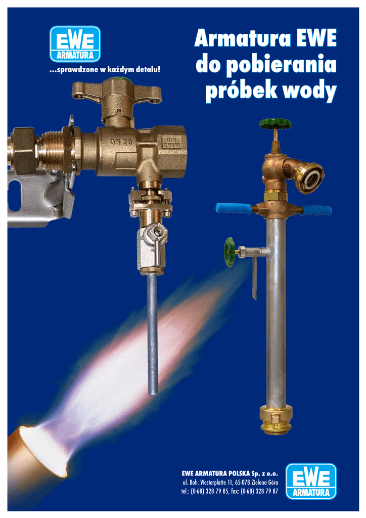 ...sprawdzone w każdym detalu! Armatura EWE do pobierania próbek wody EWE ARMATURA POLSKA Sp. z o.o. ul. Boh. Westerplatte 11, 65-078 Zielona Góra tel.: (0-68) 328 79 85, fax: (0-68) 328 79 87 Opalany zawór spustowy EWE Opalany kurek kulowy EWE Opalany zawór spustowy EWE Umożliwia zastępcze opalanie próbek wody w miejce zaworu czerpalnego EWE do poboru próbek, dostępny z gwintem zewnętrznym 1/4“ oraz 3/8“, wyposażony w uszczelkę typu o-ring, opalana jest rurka ze stali nierdzewnej o średnicy Ø 10 mm i długości ok. 100 mm. Gwint zewnętrzny G 1/4“ G 3/8“ Numer katalogowy 3372448 3372449 Opalany kurek kulowy EWE z mocowaniem Umożliwia zastępcze opalanie próbek wody w zestawach wodomierzowych EWE ze zintegrowanym zaworem spustowym, opalana jest rurka ze stali nierdzewnej o średnicy Ø 10 mm i długości ok, 100 mm, z kluczem imbusowym do mocowania. Numer katalogowy 3372447 Przykład zastosowania: Zestaw akcesoriów EWE do opalania do uniwersalnego zastosowania w prawie każdym punkciepoboru próbek. Praktyczna walizka z niebieskiego tworzywa zawiera opalany zawór spustowy EWE z gwintem G 1/4“ oraz z gwintem G 3/8“, opalany zawór kulowy EWE z rurką ze stali nierdzewnej (jako zawór spustowy), opalany zawór kulowy EWE bez rurki z gwintem wewnętrznym Rp 1/4“. Dodatkowo dołączony jest klucz imbusowy do zaworu kulowego oraz manometr do pomiaru ciśnienia wody w sieci do 16 atm. W celu zabezpieczenia akcesiriów przed uszkodzeniami podczas transportu oraz zapewnienia ich higienicznego przechowywania walizkę wyłożono materiałem piankowym. Numer katalogowy 3372499 Zawór czerpalny EWE do poboru próbek wody 1/2“ umożliwia pobieranie próbek wody po uprzednim opaleniu,wykonany ze stali nierdzewnej, opalana jest rurka ze stali nierdzewnej o średnicy Ø 10 mm i długości ok. 100 mm. Numer katalogowy 02 0051012 Zestawy wodomierzowe EWE z kurkiem ze stali nierdzewnej do pobierania próbek wody Rozporządzenie Ministra Zdrowia z dnia19.11.2002 (Dz. U. Nr 203, poz. 1718 z dnia 5.12.2002) dotyczące jakości wody przeznaczonej do spożycia reguluje sposób i częstotliwość badań wody. W wyniku rozporządzenia wzrasta ilość próbek wody pobieranych do badań bakteriologicznych. Również coraz bardziej istotne staje się miejsce dokonywania poboru próbek. Od lat sprawdzone zestawy wodomierzowe EWE Qn 2,5 oraz Qn 6 w połączeniu z zaworem czerpalnym ze stali nierdzewnej stwarzają niezawodną i trwałą armaturę do poboru próbek wody. Ogólne zalety: - zawór czerpalny (kurek) ze stali nierdzewnej - przystosowany do opalania - zestawy wodomierzowe w różnych wersjach armatury wodociągowej - pobór próbek bezpośrednio na granicy sprzedaży wody Zestaw wodomierzowy EWE PN 10, 90°C w komplecie z zaworem czerpalnym ze stali nierdzewnej do poboru próbek, z kulowym zaworem odcinającym oraz z zaworem skośnym z wbudowanym zaworem antyskażeniowym. Poziomy montaż wodomierza Wymiary wodomierza Przyłącza gwintowe Rp Qn mm Wejście Wyjście 2,5 190 1 1 1 2,5 190 1 1/4 2,5 190 1 1/4 1 1/4 1 6 260 1 /4 1 1/4 1 6 260 1 /2 1 1/2 Przy zamówieniu prosimy o podanie kierunku przepływu! Konsola niebieska Numer katalogowy 3239613 3239616 3239617 3239633 3239636 Konsola nierdzewna Numer katalogowy 3839613 3839616 3839617 3839633 3839636 Zestaw wodomierzowy EWE PN 10, 90°C w komplecie z zaworem czerpalnym ze stali nierdzewnej do poboru próbek, ze skośnym zaworem odcinającym oraz z zaworem skośnym z wbudowanym zaworem antyskażeniowym. Poziomy montaż wodomierza Wymiary wodomierza Przyłącza gwintowe Rp Qn mm Wejście Wyjście 2,5 190 1 1 1 1 2,5 190 1 /4 2,5 190 1 1/4 1 1/4 1 6 260 1 /4 1 1/4 6 260 1 1/2 1 1/2 Przy zamówieniu prosimy o podanie kierunku przepływu! Konsola niebieska Numer katalogowy 3139613 3139616 3139617 3139633 3139636 Konsola nierdzewna Numer katalogowy 3739613 3739616 3739617 3739633 3739636 03 Stojak hydrantowy EWE z zaworem czerpalnym ze stali nierdzewnej do pobierania próbek Stojak hydrantowy EWE z zaworem czerpalnym ze stali nierdzewnej do pobierania próbek Zawór stojakowy z mosiężnym, obrotowym przyłączem C (do węży strażackich), część górna stojaka z ruchomą głowicą. Mocowanie uchwytów wykonane z brązu o solidnej budowie. Uchwyty do obracania kolumny wykonane z mosiądzu, z rękojeściami z tworzywa sztucznego. Kolumna rurowa ze stali szlachetnej o średnicy DN 80 mm. Zawór czerpalny (kurek kulowy) ze stali nierdzewnej, metalicznie uszczelniony i przystosowany do opalania (termicznej dezynfekcji). Złączka stopy stojaka z mosiądzu prasowanego w solidnym, ciężkim wykonaniu, z mosiężnym pierścieniem ślizgowym i gumową uszczelką. Stojak hydrantowy EWE do pobierania próbek wody nie jest wyposażony w sito oraz w zawór zwrotny. Może być używany wyłącznie w celu przepłukiwania i pobierania próbek wody! Numer katalogowy 1170950 Wykaz norm i rozporządzeń dotyczących tematyki pobierania próbek wody: PN-EN 25667-2;1999. PN-ISO 5667-5. Jakość wody - Pobieranie próbek - Wytyczne dotyczące technik pobierania próbek. Jakość wody - Pobieranie próbek –Część 5: Wytyczne dotyczące pobierania próbek wody do picia i wody używanej do produkcji żywności i napojów. Dz. U. Nr 203, poz.1718 z dnia 5.12.2002. - Rozporządzenie Ministra Zdrowia z dnia 19 listopada 2002 r. w sprawie wymagań dotyczących jakości wody przeznaczonej do spożycia przez ludzi. Skrzynka transportowa z wodoodpornego drewna o wymiarach 940 x 400 x 140 mm. Numer katalogowy 04 6121498