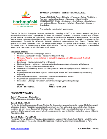 BHUTAN (Thimphu Tsechu) - BANGLADESZ Trasa: (BHUTAN) Paro – Thimphu – Punakha – Dolina Phobjikha – Trongsa – Jakar (Bumthang) – Wangdue – Ramthangkha (BANGLADESZ) Dhaka – Cottogram – Cox's Bazar – Bandarban – rejs statkiem Rocket Steamer – Hularhat – Bagerhat – Mongla – Sundarban Typ wyjazdu: zwiedzanie i wypoczynek Tsechu (w języku dzongkha oznacza dosłownie: „dziesiąty dzień”) - to nazwa festiwali religijnych, obchodzonych w każdym z dystryktów Bhutanu. Ich data jest ruchoma i odmienna dla każdego z miejsc, jednak zawsze przypada na 10-ty dzień miesiąca w tybetańskim kalendarzu księżycowym. Bhutan jest wyznaniowym państwem buddyjskim, więc wszystkie uroczystości religijne są wielkimi przedsięwzięciami państwowymi. Spośród 24 głównych festiwali religijnych najważniejszy jest Thimpu Tsechu, który gromadzi rodzinę królewską, rząd, Je Kenpo (zwierzchnik buddyjskiej szkoły drukpa, dominującej w Bhutanie), mnichów i wiele tysięcy miejscowych widzów. To cztery dni tańców religijnych, przedstawień, feeria barw, mistyczne rytuały, kolorowe stroje, maski... Największe atrakcje: Bhutan – Królestwo Grzmiącego Smoka Punakha, przełęcz Dochu La i trzepot modlitewnych flag Thimphu Tsechu – uczestnictwo w najważniejszym spośród bhutańskich festiwali religijnych Bumthang – najpiękniejsza dolina w Bhutanie Simtoka Dzong – najstarszy i jeden z najbardziej malowniczych dzongów w Królestwie Gniazdo Tygrysa – klasztor na skalnej półce Cottogram – największy port morski Bangladeszu i jedna z największych na świecie stoczni złomowych Rajska plaża w Cox's Bazar – jedno z nielicznych miejsc na Ziemi nieskażonych masową turystyką Niedostępny Bandarban i spotkanie z plemionami Marma i Chakma Rejs statkiem pasażerskim Rocket Steamer Sundarban - „dżungla na wodzie”, dom królewskiego tygrysa bengalskiego Termin: 24.09 – 11.10.2017r. Cena: 7748 zł + 3469 USD PROGRAM WYJAZDU Dzień 1 Warszawa – Dhaka (-/-/-) Wylot z Warszawy, przelot do Dhaki. Dzień 2 Dhaka (S/L/K) Przylot do stolicy Bangladeszu, Dhaki. Nocleg. Po śniadaniu zwiedzanie miasta - niezwykle kolorowego i tętniącego życiem. Podczas zwiedzania zobaczymy m. in.: Fort Lalbagh z czasów królestwa Mughal, położony tuż przy rzece Sadarghat, Shaheed Minar i Curzon Hall - części zabytkowego uniwersytetu, świątynię Dhakawashari oraz ogromny budynek parlamentu - cud architektury autorstwa Louisa I. Kahna. Kolacja i nocleg. Dzień 3 Dhaka – Paro (S/L/K) Przelot do Paro w Bhutanie. Po przylocie zwiedzanie: Muzeum Narodowe, Paro Dzong - ufortyfikowany klasztor, wzniesiony nieopodal miasta, Nymezampa - tradycyjny, drewniany most. Nocleg w Paro. www.lachmanski.pl ŁACHMAŃSKI TRAVEL Dzień 4 Paro – Thimphu – Punakha (S/L/K) Zwiedzanie Thimphu z kolorową zabudową, będącego ostoją kultury i majestatu monarchii bhutańskiej. Zwiedzimy King's Memorial Chorten - poświęcony pamięci trzeciego Króla Bhutanu, Tashi Chodzong (z zewnątrz), Instytut Sztuki i Rzemiosła, Kuensel Phodrang, Takin, wizyta na lokalnym bazarze. Zwiedzanie Simtoka Dzong, będącego najstarszym i zarazem jednym z najbardziej malowniczych dzongów - czyli warownych klasztorów Bhutanu. Przejazd przez przełęcz Dochula (3140 m n.p.m.) do Punakha (1250 m n.p.m.), dawnej stolicy Bhutanu. Będziemy mijać wioski Lumitsawa i Thinleygang, docierając do Doliny Lobesa, gdzie udamy się na wędrówkę do XV-wiecznej świątyni Chimi Lhakhang. Odwiedzimy także widowiskowy Punakha Dzong, na wyspie pomiędzy rzekami Pho (mężczyzna) i Mo (kobieta). W programie także krótkie zwiedzanie okolicy, ze zwróceniem uwagi na elementy architektoniczne, w tym posągi: Buddy, Guru Rinpoche i Shabdrunga Namgyala. Dzień 5 Punakha – Dolina Phobjikha – Trongsa (S/L/K) Wyjazd do Trongsa. Będziemy przejeżdżać przez malowniczą Dolinę Phobjikha, gdzie zatrzymamy się na chwilę, by odwiedzić klasztor Gangtey. Kontynuując podróż, pokonamy przełęcze: Youto La oraz Pele La (3300 - 3400 m n.p.m.). Kolejny postój zrealizujemy przy stupie Chendebji Chorten, zbudowanej wstylu nepalskim w XVIII w. Dalej, przejazd malowniczą, górską drogą do Trongsa Dzong, jednego z najciekawszych klasztorów w Bhutanie, mieszczącego w sobie labirynt przejść i korytarzy oraz 23 świątynie poświęcone bóstwom tantrycznym. Wizyta w Ta Dong, ciekawym muzeum założonym w wieży obserwacyjnej z 1652 r. Nocleg w Trongsa. Dzień 6 Trongsa – Jakar (Bumthang) (S/L/K) Po dotarciu do Jakar – krótkie zwiedzanie miasta, malowniczo usytuowanego na równinie, będącego administracyjną stolicą regionu. Znajduje się tu piękny Dzong Białego Ptaka, będący siedzibą władz administracyjnych dystryktu i wspólnoty zakonnej oraz zespół świątyń Kurjey Lhakhang, pochodzących z XIV w. Dalsza eksploracja najpiękniejszej doliny Bhutanu – Bumthang, stanowiącej centrum buddyzmu bhutańskiego. Wizyta w klasztorze Tamshing z 1501 r., gdzie zachowały się najstarsze w Bhutanie freski, a prawdziwą perełką jest licząca 500 lat i ważąca 50 kg metalowa kolczuga, która odpuszcza grzechy, gdy obejdzie się z nią na plecach klasztor trzy razy dookoła. Następnie, udamy się do słynnego klasztoru Jambey Lhakhang. Nocleg w Jakar. Dzień 7 Bumthang – Wangdue – Thimphu (S/L/K) Po śniadaniu wyruszymy w drogę powrotną do Thimphu. Po drodze zatrzymamy się w zabytkowym Wangdue, miasteczku z XVII w., leżącym na styku trzech regionów, które odegrało kluczową rolę w jednoczeniu państwa. Na miejscu – transfer do hotelu, zakwaterowanie. Czas wolny. Kolacja w lokalnej restauracji. Dzień 8 Thimphu Tsechu - Paro (S/L/K) Dzień spędzimy w stolicy Bhutanu, Thimphu. Będziemy uczestniczyć w barwnych obchodach festiwalu Tsechu. Pod wieczór przejazd do Paro. Zakwaterowanie, nocleg. Dzień 9 Paro – Ramthangkha (Taktsang) (S/L/K) Wyjazd do Ramthangkha i trekking do klasztoru Taktsang, zb