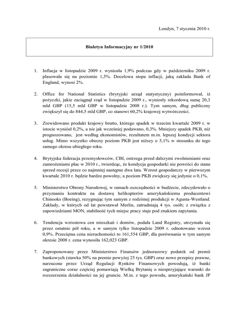 Londyn, 7 stycznia 2010 r. Biuletyn Informacyjny nr 1/2010 1. Inflacja