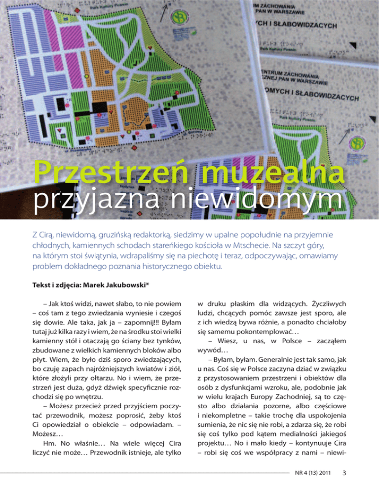 Przestrzeń muzealna przyjazna niewidomym Z Cirą, niewidomą, gruzińską redaktorką, siedzimy w upalne popołudnie na przyjemnie chłodnych, kamiennych schodach stareńkiego kościoła w Mtschecie. Na szczyt góry, na którym stoi świątynia, wdrapaliśmy się na piechotę i teraz, odpoczywając, omawiamy problem dokładnego poznania historycznego obiektu. Tekst i zdjęcia: Marek Jakubowski* – Jak ktoś widzi, nawet słabo, to nie powiem – coś tam z tego zwiedzania wyniesie i czegoś się dowie. Ale taka, jak ja – zapomnij!!! Byłam tutaj już kilka razy i wiem, że na środku stoi wielki kamienny stół i otaczają go ściany bez tynków, zbudowane z wielkich kamiennych bloków albo płyt. Wiem, że było dziś sporo zwiedzających, bo czuję zapach najróżniejszych kwiatów i ziół, które złożyli przy ołtarzu. No i wiem, że przestrzeń jest duża, gdyż dźwięk specyficznie rozchodzi się po wnętrzu. – Możesz przecież przed przyjściem poczytać przewodnik, możesz poprosić, żeby ktoś Ci opowiedział o obiekcie – odpowiadam. – Możesz… Hm. No właśnie… Na wiele więcej Cira liczyć nie może… Przewodnik istnieje, ale tylko w druku płaskim dla widzących. Życzliwych ludzi, chcących pomóc zawsze jest sporo, ale z ich wiedzą bywa różnie, a ponadto chciałoby się samemu pokontemplować… – Wiesz, u nas, w Polsce – zacząłem wywód… – Byłam, byłam. Generalnie jest tak samo, jak u nas. Coś się w Polsce zaczyna dziać w związku z przystosowaniem przestrzeni i obiektów dla osób z dysfunkcjami wzroku, ale, podobnie jak w wielu krajach Europy Zachodniej, są to często albo działania pozorne, albo częściowe i niekompletne – takie trochę dla uspokojenia sumienia, że nic się nie robi, a zdarza się, że robi się coś tylko pod kątem medialności jakiegoś projektu… No i mało kiedy – kontynuuje Cira – robi się coś we współpracy z nami – niewiNR 4 (13) 2011 3 Przestrzeń muzealna przyjazna niewidomym Urząd Miasta Warszawy – tablice przydrzwiowe domymi. Uszczęśliwia się nas na siłę jakimś wydumanym artystycznym modelikiem zamku i uważa się, że sprawa załatwiona. Zrealizowałeś tyle projektów związanych z przystosowaniem przestrzeni. Spisz tą swoją wiedzę i doświadczenia! Opublikujemy w naszej prasie, Ty spróbujesz opublikować w Polsce i gdzie tam możesz i będziemy mieli... – Gotową koncepcję? – przerwałem. – Będziemy mieli dopiero materiał do dyskusji! Wrócimy do Tbilisi. Siadaj i pisz – nakazała. Nie zdążyłem wtedy przygotować materiału. Wysyłam go teraz do redakcji Tyfloświata. A moim niewidomym i słabowidzącym przyjaciołom, z którymi współpracowałem i współpracuję nadal, dedykuję szkic tej koncepcji. Wiele instytucji o charakterze turystycznym i muzealnym, kierując się dyrektywami, a częściej poczuciem odpowiedzialności społecznej oraz zwykłą życzliwością, stara się przestrzenie swoich budynków oraz ekspozycji przystosować dla potrzeb samodzielnego poznawania przez osoby niepełnosprawne, w tym oczywiście niewidome i słabowidzące. Bardzo często zaangażowanie jednej, dwóch osób porusza lawinę działań ze strony pozostałych. Wspólne działania takiej grupy, współpracującej z niewidomymi i słabowidzącymi konsultantami, skutkują całkiem dobrym przystosowaniem przeznaczonej do poznawania przestrzeni, nawet w zakresie jej poszczególnych elementów. 4 Wyobraźmy sobie przestrzeń hipotetycznego muzeum czy ogrodu. Co zrobić, żeby ją oswoić? Jakie działania musimy podjąć, aby stała się przyjazna? Przyjmijmy założenie, że nasza koncepcja nie będzie szczególnie „kosztożerna”, a jednocześnie będzie możliwie uniwersalna oraz bogata. Maksymą przyświecającą naszym działaniom w zakresie „oswajania” przestrzeni w różnych miejscach kraju i Europy jest hasło: „Przystosujmy przestrzeń tak, aby dać możliwość wyboru sposobu jej poznawania”. Wszelkie działania, mające związek z przystosowaniem przestrzeni dla osób z dysfunkcjami wzroku, możemy podzielić na dwie grupy (choć podział ten jest płynny) – fizyczne oraz wirtualne dostosowywanie. Różnorodność sposobu przedstawienia informacji Bardzo ważnym elementem przystosowania wszelkiego rodzaju przestrzeni (w tym oczywiście przestrzeni o charakterze turystycznym) jest przygotowanie merytorycznie poprawnego barwnoreliefowego planu terenu. Będzie on użyteczny zarówno w celu poznanie struktury przestrzeni, np. sali muzealnej czy wystawowej, jak i przestrzeni budynku czy ogrodu. Generalizacja i skala planu dotykowego, jakość tłoczeń reliefowych i kolorystyka powinny odpowiadać wszelkim wypracowanym w kraju normom i standardom oraz zawierać niezbędne w celach poznawczym treści. Udźwiękowione, reliefowe tablice informacyjne Przestrzeń muzealna przyjazna niewidomym Model Ratusza w Poznaniu Idealnym rozwiązaniem w tego typu przedstawieniach jest ich udźwiękowienie oraz sytuacja, w której informacje o poszczególnych elementach planu podawane są zarówno w druku brajlowskim, druku płaskim, jak i w plikach dźwiękowych. Ten sam teren, przestrzeń mogą być przedstawione na bardziej szczegółowych planach, w formie kilkustronicowego albumu barwnoreliefowego. Musimy jednak pamiętać, iż bardziej szczegółowe przedstawienia tyflograficzne wymagają od odbiorcy znacznej ilości czasu na studiowanie ich. Bywają bardzo użyteczne, jeśli zwiedzający może je wypożyczyć przed zwiedzaniem, np. do domu, i szczegółowo się z nimi zapoznać. Następnym elementem przystosowania przestrzeni jest jej opis. Możemy się z nim zapoznać przed rozpoczęciem zwiedzania, np. w piśmie brajla czy w druku powiększonym, w broszurze informacyjnej na temat konkretnej przestrzeni muzealnej czy miejsca o szczególnym znaczeniu turystycznym. Ta sama broszura powinna być umieszczona na stronach internetowych danej instytucji. Wcześniejsze zapoz