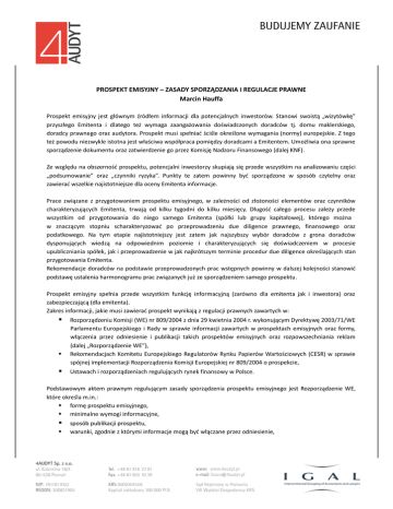 PROSPEKT EMISYJNY – ZASADY SPORZĄDZANIA I REGULACJE PRAWNE Marcin Hauffa Prospekt emisyjny jest głównym źródłem informacji dla potencjalnych inwestorów. Stanowi swoistą „wizytówkę” przyszłego Emitenta i dlatego też wymaga zaangażowania doświadczonych doradców tj. domu maklerskiego, doradcy prawnego oraz audytora. Prospekt musi spełniać ściśle określone wymagania (normy) europejskie. Z tego też powodu niezwykle istotna jest właściwa współpraca pomiędzy doradcami a Emitentem. Umożliwia ona sprawne sporządzenie dokumentu oraz zatwierdzenie go przez Komisję Nadzoru Finansowego (dalej KNF). Ze względu na obszerność prospektu, potencjalni inwestorzy skupiają się przede wszystkim na analizowaniu części „podsumowanie” oraz „czynniki ryzyka”. Punkty te zatem powinny być sporządzone w sposób czytelny oraz zawierać wszelkie najistotniejsze dla oceny Emitenta informacje. Prace związane z przygotowaniem prospektu emisyjnego, w zależności od złożoności elementów oraz czynników charakteryzujących Emitenta, trwają od kilku tygodni do kilku miesięcy. Długość całego procesu zależy przede wszystkim od przygotowania do niego samego Emitenta (spółki lub grupy kapitałowej), którego można w znaczącym stopniu scharakteryzować po przeprowadzeniu due diligence prawnego, finansowego oraz podatkowego. Na tym etapie najistotniejszy jest zatem jak najszybszy wybór doradców z grona doradców dysponujących wiedzą na odpowiednim poziomie i charakteryzujących się doświadczeniem w procesie upubliczniania spółek, jak i przeprowadzenie w jak najkrótszym terminie procedur due diligence określających stan przygotowania Emitenta. Rekomendacje doradców na podstawie przeprowadzonych prac wstępnych powinny w dalszej kolejności stanowić podstawę ustalenia harmonogramu prac związanych już ze sporządzeniem samego prospektu. Prospekt emisyjny spełnia przede wszystkim funkcję informacyjną (zarówno dla emitenta jak i inwestora) oraz zabezpieczającą (dla emitenta). Zakres informacji, jakie musi zawierać prospekt wynikają z regulacji prawnych zawartych w: Rozporządzeniu Komisji (WE) nr 809/2004 z dnia 29 kwietnia 2004 r. wykonującym Dyrektywę 2003/71/WE Parlamentu Europejskiego i Rady w sprawie informacji zawartych w prospektach emisyjnych oraz formy, włączenia przez odniesienie i publikacji takich prospektów emisyjnych oraz rozpowszechniania reklam (dalej „Rozporządzenie WE”), Rekomendacjach Komitetu Europejskiego Regulatorów Rynku Papierów Wartościowych (CESR) w sprawie spójnej implementacji Rozporządzenia Komisji Europejskiej nr 809/2004 o prospekcie, Ustawach i rozporządzeniach regulujących rynek finansowy w Polsce. Podstawowym aktem prawnym regulującym zasady sporządzenia prospektu emisyjnego jest Rozporządzenie WE, które określa m.in.: formę prospektu emisyjnego, minimalne wymogi informacyjne, sposób publikacji prospektu, warunki, zgodnie z którymi informacje mogą być włączane przez odniesienie, sposób publikacji i rozpowszechniania reklam. W Rozporządzeniu WE szczegółowo przedstawiono wymogi w stosunku do zawartości dokumentu w zależności od rodzaju wprowadzanych papierów wartościowych (instrumentów) lub działalności emitenta. W dalszej części artykułu przedstawione zostaną główne wytyczne dotyczące publicznej oferty akcji przedsiębiorstw innych niż banki, przedsiębiorstwa zbiorowego inwestowania typu zamkniętego, Prospekt emisyjny może zostać sporządzony w formie jednolitego dokumentu lub 3 oddzielnych elementów, tj.: dokumentu rejestracyjnego, dokumentu ofertowego, podsumowania. Dokument rejestracyjny ma za zadanie przedstawienie emitenta jako podmiotu biznesowego oraz prawnego, w tym celu ujawniane są informacje między innymi dotyczące: struktury organizacyjnej, kluczowych pracowników, akcjonariuszy, istotnych umów, czynników ryzyka, środków trwałych, zasobów kapitałowych, danych finansowych. Historyczne dane finansowe, które są zamieszczane w prospekcie, obejmują co do zasady 3 lata obrotowe oraz podlegają obowiązkowemu badaniu przez niezależnego biegłego rewidenta. W związku z tym, iż dane te są również wykorzystywane w innych punktach prospektu, istotnym jest, aby prace związane z ich przygotowaniem zostały przeprowadzone na początku całego procesu IPO. W przypadku grupy kapitałowej dane finansowe powinny zostać przygotowane zgodnie z Międzynarodowymi Standardami Sprawozdawczości Finansowej (MSSF), co wymaga zidentyfikowania różnic pomiędzy dotychczas stosowanymi przez grupę Emitenta zasadami rachunkowości oraz oszacowania odpowiednich korekt, które ujęte w sprawozdaniu finansowym zapewnią zgodność prezentowanych w nim danych z MSSF. Przekształcenie sprawozdań finansowych na zgodne z MSSF bywa czasochłonne i może istotnie wydłużyć cały proces upublicznienia, dlatego należy je przeprowadzić jak najszybciej. Dokument ofertowy ma za zadanie przede wszystkim przedstawienie rodzaju, warunków oraz zasad oferty i zawiera m.in.: informacje o oferowanych papierach wartościowych, informacje o warunkach oferty, informacje o kosztach emisji, oferty, Treść podsumowania emitent określa samodzielnie, nie mniej powinna ona zawierać kluczowe informacje na temat podstawowych elementów danych papierów wartościowych, mające na celu wspomóc inwestorów w procesie podejmowania decyzji o danej inwestycji. Podsumowanie powinno również zawierać następujące ostrzeżenia: każda decyzja o inwestycji w papiery wartościowe powinna być oparta na rozważeniu przez inwestora całości prospektu emisyjnego; w przypadku wystąpienia do sądu z roszczeniem odnoszącym się do informacji zamieszczonych w prospekcie emisyjnym, skarżący inwestor może na mocy ustawodawstwa Państwa Członkowskiego mieć obowiązek poniesienia kosztów przetłumaczenia prospektu emisyjnego przed rozpoczęciem postępowania sądowego; oraz odpowiedzial
