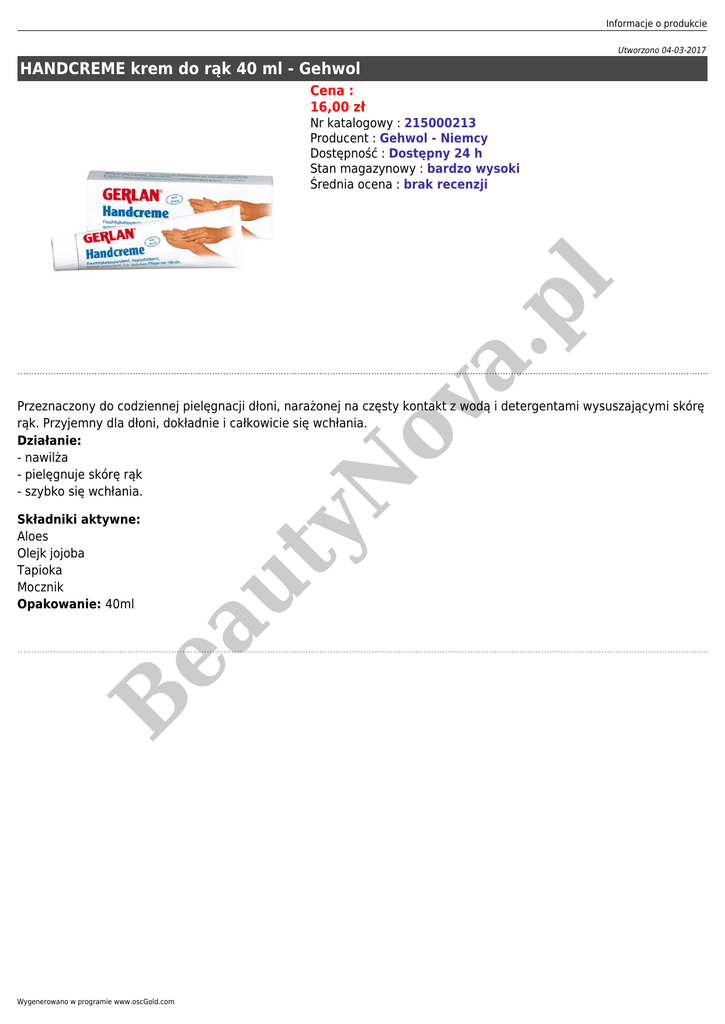 Informacje o produkcie Utworzono 04-03-2017 HANDCREME krem do rąk 40 ml - Gehwol Cena : 16,00 zł ov a. pl Nr katalogowy : 215000213 Producent : Gehwol - Niemcy Dostępność : Dostępny 24 h Stan magazynowy : bardzo wysoki Średnia ocena : brak recenzji B ut ea Składniki aktywne: Aloes Olejk jojoba Tapioka Mocznik Opakowanie: 40ml yN Przeznaczony do codziennej pielęgnacji dłoni, narażonej na częsty kontakt z wodą i detergentami wysuszającymi skórę rąk. Przyjemny dla dłoni, dokładnie i całkowicie się wchłania. Działanie: - nawilża - pielęgnuje skórę rąk - szybko się wchłania. Wygenerowano w programie www.oscGold.com